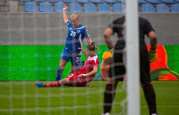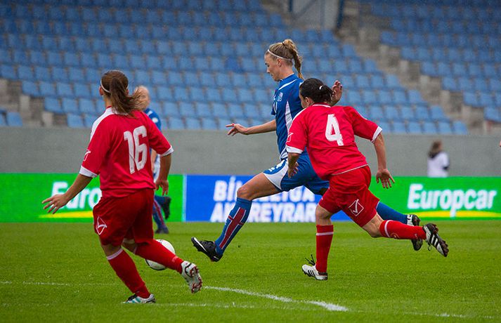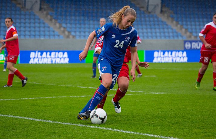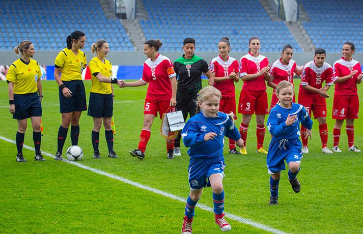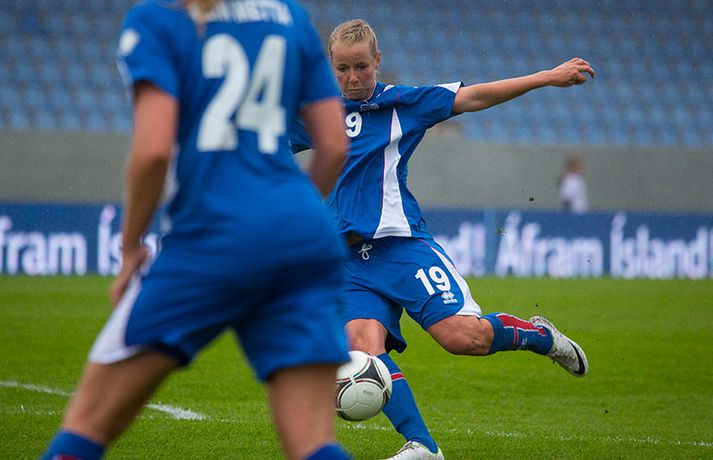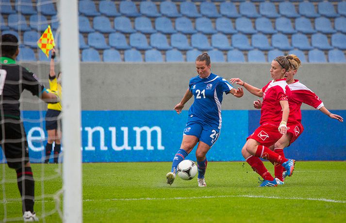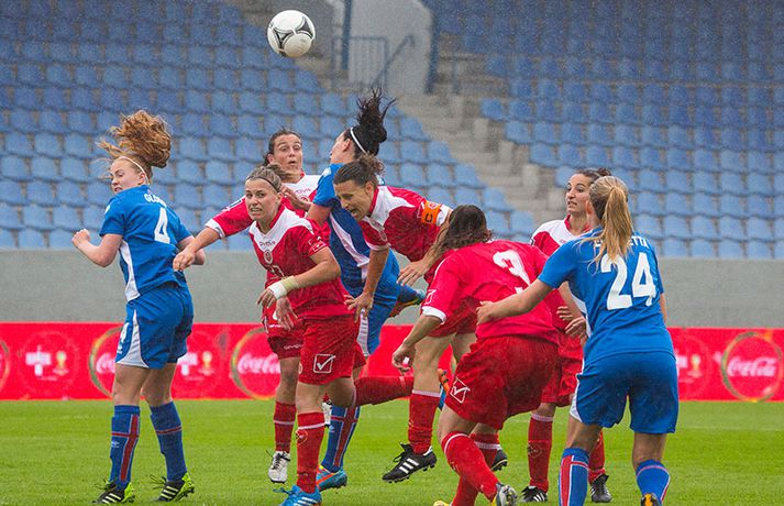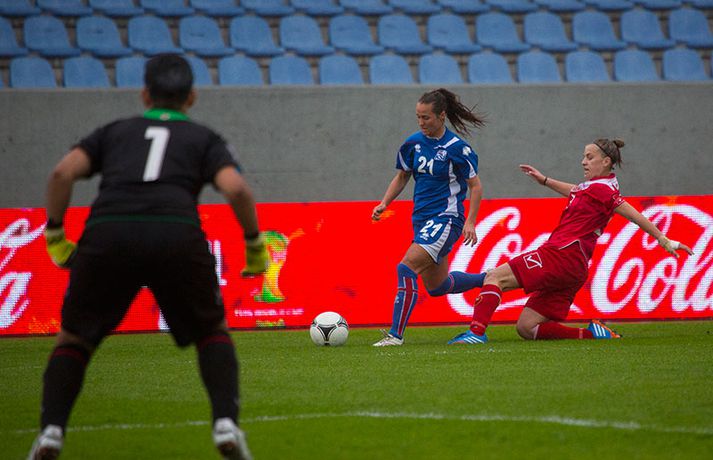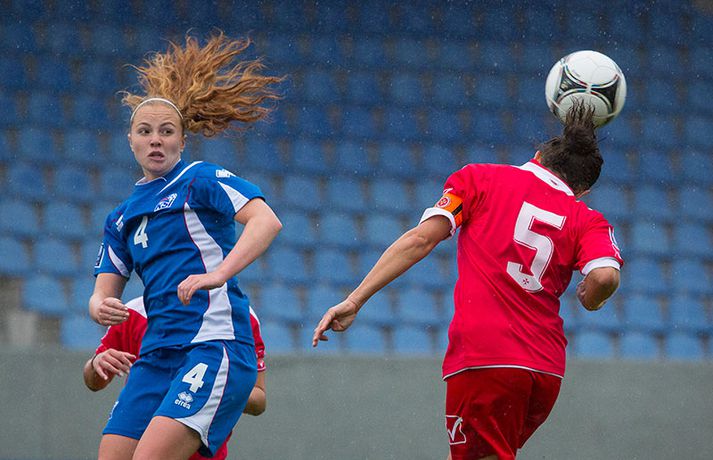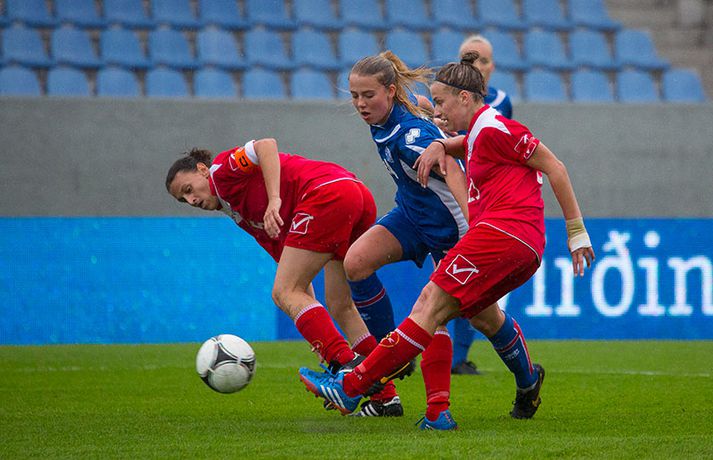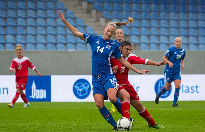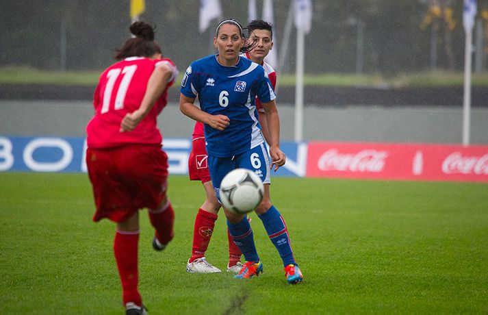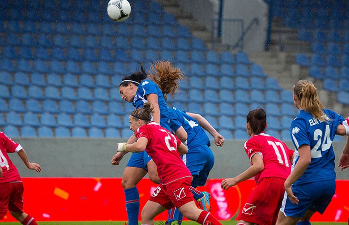 Íslenska kvennalandsliðið í fótbolta fór létt með Möltu 5-0 á Laugardalsvelli í undankeppni heimsmeistarakeppninnar sem fram fer í Kanada næsta sumar. Ísland var 3-0 yfir í hálfleik. Leikurinn var aldrei spennandi. Ísland var mikið sterkari aðilinn frá fyrstu mínútu til þeirrar síðustu og hefði liðið í raun getað skorað mun fleiri mörk. Framherji Möltu fékk ekkert að gera fram á við í leiknum því liðið kom boltanum varla inn á vallarhelming Íslands, slíkir voru yfirburðirnir. Það tók Ísland tólf mínútur að komast yfir og hafði liðið fengið fín færi til að skora áður en Hólmfríður Magnúsdóttir gerði það eftir hornspyrnu Hallberu Guðnýjar Gísladóttur sem átti ófáar góðar sendingarnar inn í teig Möltu í leiknum. Átta mínútum síðar skoraði Elín Metta Jensen annað mark Ísland og fimm mínútum fyrir hálfleik bætti Dóra María Lárusdóttir þriðja markinu við en Ísland átti 20 skot í fyrri hálfleik. Þóra Björg Helgadóttir fékk einu sinni að snerta boltann í leiknum og aldrei með höndunum. Íslensku stelpurnar voru alls ekki saddar þrátt fyrir að úrslitin voru ráðin í hálfleik. Liðið sótti af krafti þar sem bakverðirnir, Hallbera og Elísa Viðarsdóttir studdu vel við sóknina.Dagný Brynjarsdóttir fékk fjölda færa í fyrri hálfleik og hefði hæglega getað skorað þrennu í hálfleiknum. Hún náði þó að reima á sig markaskóna í hálfleik og skoraði fjórða mark Íslands á 64. mínútu eftir þunga sókn Íslands. Ísland átti yfir 40 skot í leiknum og hefði átt að skora mun fleiri mörk. Fimmta markið kom þegar fimm mínútur voru eftir. Elín Metta tvöfaldaði þá markafjölda sinn fyrir Ísland þegar hún skoraði annað mark sitt í leiknum en hún skoraði fyrstu landsliðsmörk sín í kvöld. Ísland á þrjá leiki eftir í riðlinum, alla á heimvelli. Liðið er í öðru sæti með 13 stig, stigi á undan Danmörku sem liðið mætir í næsta leik í ágúst. Freyr: Skrýtnasti fótboltaleikur sem ég hef spilað„Þetta var býsna auðvelt. Ég viðurkenni það. Þetta var oft á tíðum hálfgerður skrípaleikur,“ sagði Freyr Alexandersson þjálfari Íslands eftir sigurinn í kvöld. „Maður er svekktur með nýtinguna. Við eigum að skora yfir fimm mörk en við vorum að reyna og boltinn gekk ágætlega á milli leikmanna. Það vantaði aðeins geðveiki og gæði inn í teiginn. Yfir 40 marktilraunir er ótrúleg tala. „Við skjótum í markmanninn af fimm metra færi tíu sinnum í leiknum. Þar hefði ég viljað sjá meiri gæði. „Við vorum með ellefu sóknarmenn í leiknum. Við spilum í þremur línum en varnarhlutverk okkar í leiknum var ekki neitt. Við sóttum allan leikinn og þetta er skrýtnasti fótboltaleikur sem ég hef spilað,“ sagði Freyr sem eygir enn möguleika á að vera með nógu góðan árangur í öðru sæti riðilsins til að komast í umspil um laust sæti á HM en þau fjögur lið með bestan árangur í öðru sæti eiga möguleika á sæti á HM í Kanada. „Stigin, að halda hreinu, skora fimm og fá engin spjöld er mjög mikilvægt. Það eru möguleikar. Það er meiri séns heldur en við gerum okkur grein fyrir ef þetta spilast þokkalega fyrir okkur sem getur alveg gerst. „Við verðum að vera með okkar á hreinu og taka restina af stigunum,“ sagði Freyr. Dagný: 5-0, það verður að hafa það„Ég hefði átt að vera með fimm, á fínum degi fyrir mig. Ég hefði átt að vera með þrennu í fyrri hálfleik miðað við færin sem ég fékk,“ sagði Dagný Brynjarsdóttir eftir leikinn en hún skoraði eitt mark í leiknum. „Við liggjum í sókn og skorum fimm og hefðum kannski átt að vinna þær 12-0, kannski meira. „Við nýttum færin ekki almennilega og oft klikkaði síðasta sendingin. Fyrirgjafirnar voru oft ekki nógu góðar en 5-0, það verður að hafa það. „Aðstæður voru betri heldur en úti á Möltu þar sem við vorum á gervigrasi og völlurinn var þrengri sem hentaði þeim betur,“ sagði Dagný sem vildi ekki meina að þungur og blautur völlurinn hafi gert Íslandi erfitt fyrir í vítateig Möltu. „Markmiðið okkar var að halda einbeitingu og vera hreyfanlegar og láta boltann ganga. Það þýðir ekkert að reyna að sóla ein í gegnum þrjár því þær eru svo þéttar. „Við þurfum að vera þolinmóðar því þær nýta öll tækifæri til að tefja. Stundum voru þær með allt liðið inni í teig og þær voru duglegar að henda sér fyrir boltann. „Við hefðum þurft að vera grimmari í öðrum bolta, þegar markmaðurinn varði,“ sagði Dagný. Elín Metta: Ánægð að ná að skora„Ég er mjög ánægð með að hafa náð að skora í kvöld. Það gefur mér sjálfstraust,“ sagði Elín Metta Jensen skoraði skoraði tvö fyrstu mörk sín fyrir Ísland í kvöld. „Mér fannst við reyna að spila fótbolta og þær voru í einhverju allt öðru. Þetta var spes leikur en ef við hefðum sett aðeins meiri gæði í spilið okkar þá hefðum við náð að skora fleiri mörk. „Þær hentu sér fyrir boltann í teignum og voru margar þar. Maður þurfti að finna glufurnar og við náðum því nokkrum sinnum en hefðum þurft að nýta færin aðeins betur. „Í svona leikjum þarf maður að passa sig að detta ekki niður á sama plan og hitt liðið. Við lækkuðum tempóið í okkar leik miðað við hvernig við spilum venjulega. Það er aðalega það sem hefði getað verið betra,“ sagði Elín Metta.