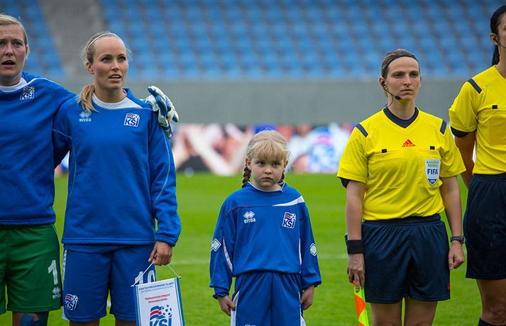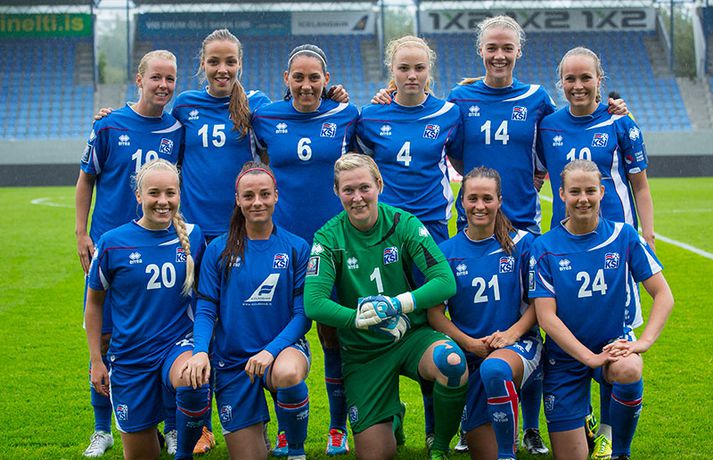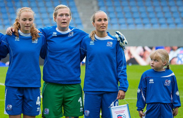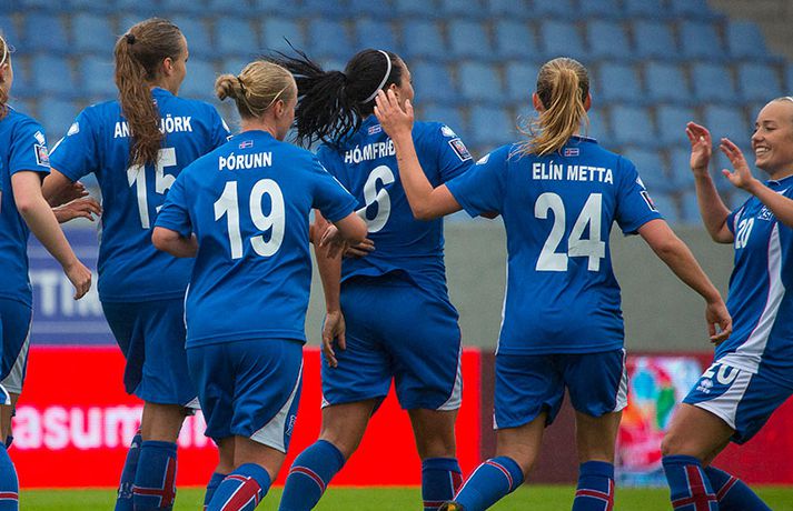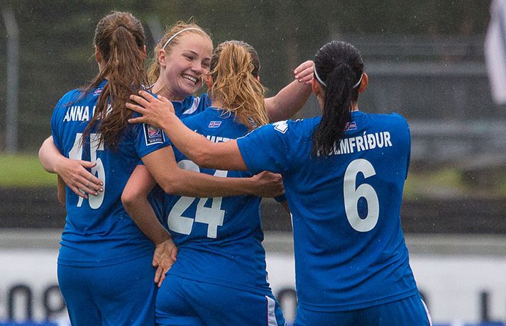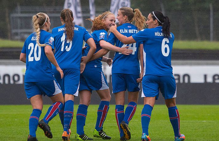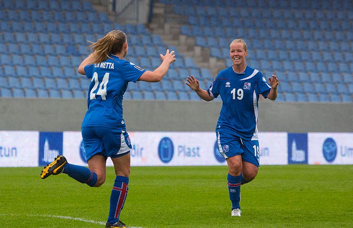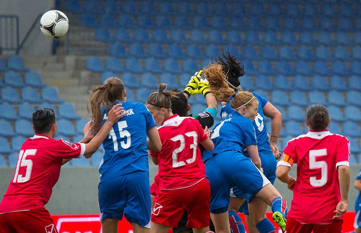 Umfjöllun, viðtöl og myndir: Ísland - Malta 5-0 | Létt í Dalnum Guðmundur Marinó Ingvarsson á Laugardalsvelli skrifar 19. júní 2014 17:07 Steplpurnar fagna marki í kvöld. vísir/daníel Íslenska kvennalandsliðið í fótbolta fór létt með Möltu 5-0 á Laugardalsvelli í undankeppni heimsmeistarakeppninnar sem fram fer í Kanada næsta sumar. Ísland var 3-0 yfir í hálfleik. Leikurinn var aldrei spennandi. Ísland var mikið sterkari aðilinn frá fyrstu mínútu til þeirrar síðustu og hefði liðið í raun getað skorað mun fleiri mörk. Framherji Möltu fékk ekkert að gera fram á við í leiknum því liðið kom boltanum varla inn á vallarhelming Íslands, slíkir voru yfirburðirnir. Það tók Ísland tólf mínútur að komast yfir og hafði liðið fengið fín færi til að skora áður en Hólmfríður Magnúsdóttir gerði það eftir hornspyrnu Hallberu Guðnýjar Gísladóttur sem átti ófáar góðar sendingarnar inn í teig Möltu í leiknum. Átta mínútum síðar skoraði Elín Metta Jensen annað mark Ísland og fimm mínútum fyrir hálfleik bætti Dóra María Lárusdóttir þriðja markinu við en Ísland átti 20 skot í fyrri hálfleik. Þóra Björg Helgadóttir fékk einu sinni að snerta boltann í leiknum og aldrei með höndunum. Íslensku stelpurnar voru alls ekki saddar þrátt fyrir að úrslitin voru ráðin í hálfleik. Liðið sótti af krafti þar sem bakverðirnir, Hallbera og Elísa Viðarsdóttir studdu vel við sóknina.Dagný Brynjarsdóttir fékk fjölda færa í fyrri hálfleik og hefði hæglega getað skorað þrennu í hálfleiknum. Hún náði þó að reima á sig markaskóna í hálfleik og skoraði fjórða mark Íslands á 64. mínútu eftir þunga sókn Íslands. Ísland átti yfir 40 skot í leiknum og hefði átt að skora mun fleiri mörk. Fimmta markið kom þegar fimm mínútur voru eftir. Elín Metta tvöfaldaði þá markafjölda sinn fyrir Ísland þegar hún skoraði annað mark sitt í leiknum en hún skoraði fyrstu landsliðsmörk sín í kvöld. Ísland á þrjá leiki eftir í riðlinum, alla á heimvelli. Liðið er í öðru sæti með 13 stig, stigi á undan Danmörku sem liðið mætir í næsta leik í ágúst. Freyr: Skrýtnasti fótboltaleikur sem ég hef spilað„Þetta var býsna auðvelt. Ég viðurkenni það. Þetta var oft á tíðum hálfgerður skrípaleikur,“ sagði Freyr Alexandersson þjálfari Íslands eftir sigurinn í kvöld. „Maður er svekktur með nýtinguna. Við eigum að skora yfir fimm mörk en við vorum að reyna og boltinn gekk ágætlega á milli leikmanna. Það vantaði aðeins geðveiki og gæði inn í teiginn. Yfir 40 marktilraunir er ótrúleg tala. „Við skjótum í markmanninn af fimm metra færi tíu sinnum í leiknum. Þar hefði ég viljað sjá meiri gæði. „Við vorum með ellefu sóknarmenn í leiknum. Við spilum í þremur línum en varnarhlutverk okkar í leiknum var ekki neitt. Við sóttum allan leikinn og þetta er skrýtnasti fótboltaleikur sem ég hef spilað,“ sagði Freyr sem eygir enn möguleika á að vera með nógu góðan árangur í öðru sæti riðilsins til að komast í umspil um laust sæti á HM en þau fjögur lið með bestan árangur í öðru sæti eiga möguleika á sæti á HM í Kanada. „Stigin, að halda hreinu, skora fimm og fá engin spjöld er mjög mikilvægt. Það eru möguleikar. Það er meiri séns heldur en við gerum okkur grein fyrir ef þetta spilast þokkalega fyrir okkur sem getur alveg gerst. „Við verðum að vera með okkar á hreinu og taka restina af stigunum,“ sagði Freyr. Dagný: 5-0, það verður að hafa það„Ég hefði átt að vera með fimm, á fínum degi fyrir mig. Ég hefði átt að vera með þrennu í fyrri hálfleik miðað við færin sem ég fékk,“ sagði Dagný Brynjarsdóttir eftir leikinn en hún skoraði eitt mark í leiknum. „Við liggjum í sókn og skorum fimm og hefðum kannski átt að vinna þær 12-0, kannski meira. „Við nýttum færin ekki almennilega og oft klikkaði síðasta sendingin. Fyrirgjafirnar voru oft ekki nógu góðar en 5-0, það verður að hafa það. „Aðstæður voru betri heldur en úti á Möltu þar sem við vorum á gervigrasi og völlurinn var þrengri sem hentaði þeim betur,“ sagði Dagný sem vildi ekki meina að þungur og blautur völlurinn hafi gert Íslandi erfitt fyrir í vítateig Möltu. „Markmiðið okkar var að halda einbeitingu og vera hreyfanlegar og láta boltann ganga. Það þýðir ekkert að reyna að sóla ein í gegnum þrjár því þær eru svo þéttar. „Við þurfum að vera þolinmóðar því þær nýta öll tækifæri til að tefja. Stundum voru þær með allt liðið inni í teig og þær voru duglegar að henda sér fyrir boltann. „Við hefðum þurft að vera grimmari í öðrum bolta, þegar markmaðurinn varði,“ sagði Dagný. Elín Metta: Ánægð að ná að skora„Ég er mjög ánægð með að hafa náð að skora í kvöld. Það gefur mér sjálfstraust,“ sagði Elín Metta Jensen skoraði skoraði tvö fyrstu mörk sín fyrir Ísland í kvöld. „Mér fannst við reyna að spila fótbolta og þær voru í einhverju allt öðru. Þetta var spes leikur en ef við hefðum sett aðeins meiri gæði í spilið okkar þá hefðum við náð að skora fleiri mörk. „Þær hentu sér fyrir boltann í teignum og voru margar þar. Maður þurfti að finna glufurnar og við náðum því nokkrum sinnum en hefðum þurft að nýta færin aðeins betur. „Í svona leikjum þarf maður að passa sig að detta ekki niður á sama plan og hitt liðið. Við lækkuðum tempóið í okkar leik miðað við hvernig við spilum venjulega. Það er aðalega það sem hefði getað verið betra,“ sagði Elín Metta. Fótbolti Mest lesið Erum við ósanngjörn við Ómar Inga sem þjóð? Handbolti Dagur tók upp gítarinn og söng í bronsgleði Króatanna Handbolti Fær a
