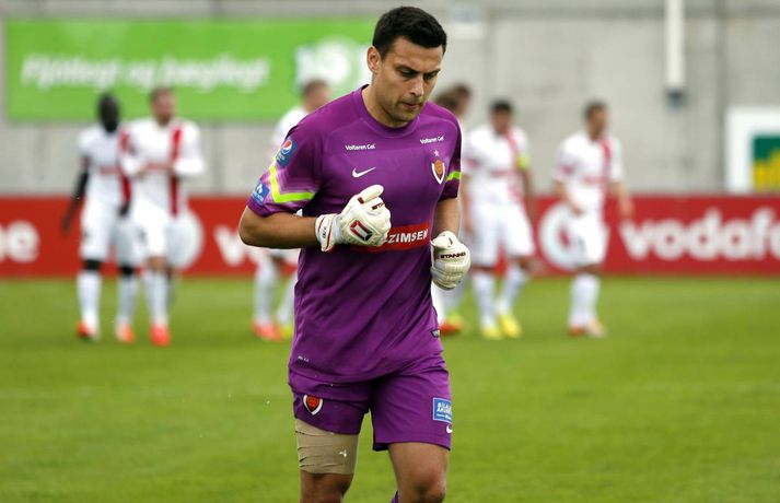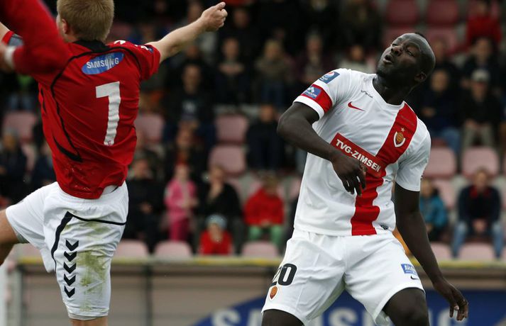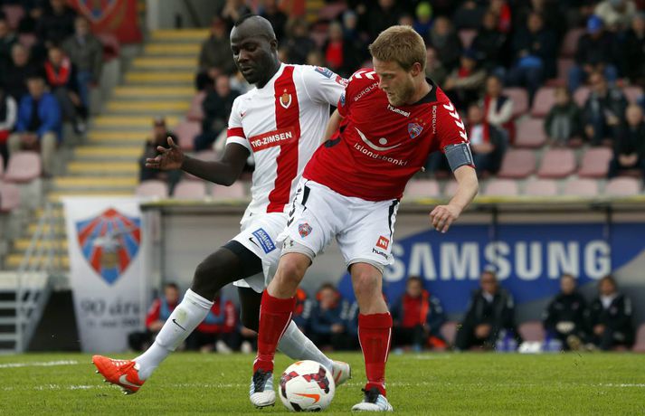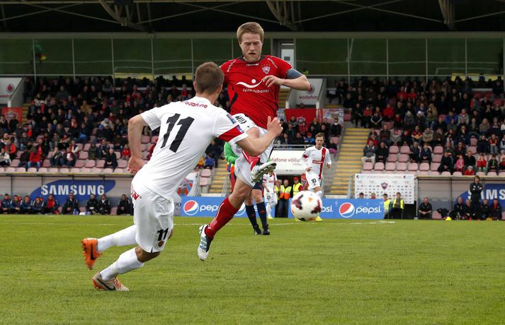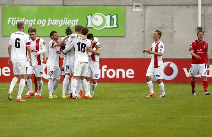 Umfjöllun, viðtöl, einkunnir og myndir: Valur - Víkingur 1-2 | Annar sigur Víkinga í röð Ingvi Þór Sæmundsson á Vodafone-vellinum skrifar 15. júní 2014 00:01 Víkingar fagna. Vísir/Stefán Víkingar fögnuðu sínum öðrum sigri í röð þegar þeir báru sigurorð af Val á útivelli með tveimur mörkum gegn einu. Leikurinn á Vodafone-vellinum í kvöld staðfesti það sem flestir vissu: að Aron Elís Þrándarson er frábær í fótbolta - leikmaður sem skilur á milli í jöfnum leikjum eins og þessum. Hann er ofsboðslega klár í að finna sér pláss milli varnar og miðju mótherjanna, á mjög auðvelt með að fara framhjá varnarmönnum og það er mikil skotógn af honum. Aron er mjög beittur sóknarleikmaður og ef hann sleppur við meiðslin sem hafa plagað hann síðustu ár getur hann náð virkilega langt. Leikurinn var ágætlega spilaður og bæði liðin héldu boltanum vel. Það dró til tíðinda á 28. mínútu þegar Iain Williamson kom Val yfir með skoti úr vítateignum eftir innkast Sigurðar Egils Lárussonar og skalla Hauks Páls Sigurðssonar. En aðeins mínútu seinna jafnaði Aron Elís leikinn með góðu skoti rétt fyrir utan vítateig eftir að hafa leikið laglega á Williamson. Það gerðist fátt næstu mínúturnar og stöðubaráttan var ríkjandi. En á lokamínútu fyrri hálfleiks var Aron Elís nálægt að endurtaka leikinn frá því í jöfnunarmarkinu. Hann lék þá á Hauk Pál og Bjarna Ólaf Eiríksson, sem lék sem miðvörður í kvöld, en skaut framhjá markinu frá vítapunkti. Staðan í hálfleik var 1-1. Seinni hálfleikurinn var rólegur í meira lagi. Valsmenn náðu að loka betur á Aron Elís og voru heldur sterkari aðilinn án þess þó að skapa sér mörg opin færi. Haukur Páll komst næst því skora fyrir Valsmenn; fyrst þegar hann átti bakfallsspyrnu beint á Ingvar Þór Kale og svo þegar hann átti af fjærstönginni sem Ingvar varði vel. Aron Elís hafði, sem áður sagði, haft hægt um sig í seinni hálfleik en þegar sjö mínútur voru til leiksloka lét hann aftur til sín taka. Hann átti þá frábæran sprett, komst upp að endamörkum vinstra megin í vítateignum, sendi boltann fyrir og eftir klafs fór boltinn af varamanninum Henry Monaghan og í netið. Valsmenn bættu í sóknina eftir markið og Ingvar þurfti að taka á honum stóra sínum þegar hann varði skalla Hauks Páls frábærlega. Heimamenn skildu hins vegar mikið pláss eftir aftarlega á vellinum á lokamínútunum og Aron Elís komst í tvígang nálægt því að skora, en Fjalar Þorgeirsson, markvörður Vals, sá við honum. Fleiri urðu mörkin hins vegar ekki og Víkingar fögnuðu góðum sigri sem þeir unnu svo sannarlega fyrir. Liðsheildin var sterk og þeirra lykilmenn, Aron Elís, Ingvar, Igor Taskovic og Alan Löwing, áttu allir afbragðs leik. Valsmenn hljóta að vera fúlir með niðurstöðuna, enda getur það varla talist ásættanlegt fyrir lið sem ætlar sér a.m.k. að komast í Evrópukeppni að tapa á heimavelli fyrir nýliðum. Markaskorarinn Williamson átti góðan fyrri hálfleik en það dró af honum eftir því sem á leikinn leið. Þá átti Bjarni Ólafur flottan leik í miðvarðarstöðunni. Víkingar eru nú í 5. sæti með 13 stig, einu stigi meira en Valur sem situr í sætinu fyrir neðan.Magnús: Vantaði þetta extra "Þetta er grátleg niðurstaða. Við erum, að mér finnst, búnir að vera á fínu róli í þessu móti, en við höfum ekki komist á almennilegt skrið," sagði Magnús Gylfason, þjálfari Vals eftir tapið gegn Víkingi í kvöld. "Það var grátlegt að tapa hérna á heimavelli í nokkuð jöfnum leik, þar sem við höfðum kannski yfirhöndina, en það vantaði eitthvað upp á," sagði Magnús en honum fannst vanta smá meiri kraft í leik sinna manna. "Við komum ákveðnari út í seinni hálfleikinn fannst mér og við sköpuðum okkur 2-3 hálffæri, en það vantaði þetta extra, þetta mark til að komast yfir. "Það var líka klaufalegt hjá okkur að fá strax á sig mark eftir að hafa komist yfir í fyrri hálfleik. Það var niðurdrepandi að fá á sig mark nánast á sömu mínútunni. "Mér fannst Víkingar ekki vera að valda okkur neinum stórvægilegum vandræðum en meðan staðan er 1-1 er stórhættulegt að fara með of marga menn fram í sóknina og við fengum að kenna á því í dag," sagði Magnús að lokum.Ólafur: Höfum oft spilað betur Ólafur Þórðarson, þjálfari Víkinga, kvaðst stoltur af sínum mönnum í kvöld. "Já, það er ég. Við höfum oft spilað betur, en við höfum aldrei fengið fleiri stig fyrir sigur. Við náðum að klára leikinn og það var gott," sagði Ólafur en Víkingar eru nú búnir að vinna tvo leiki í röð í Pepsi-deildinni. "Eins og ég sagði vorum við ekki að spila vel í dag, en við náðum að landa þessum sigri á karakter. Ég vona að við finnum aftur fjölina okkar, en ég var sáttur með karakterinn í dag. "Varnarleikurinn var heilt yfir mjög sterkur, en við gerum smá mistök í markinu. Valsmenn eru með gæðaleikmenn sem refsa og þeir gerðu það svo sannarlega í kvöld, en við náðum sem betur fer að svara strax fyrir okkur og klára svo leikinn í lokin." Ólafur var einnig sáttur með frammistöðu Arons Elísar Þrándarsonar sem skoraði fyrra mark Víkinga í kvöld og lagði upp það síðara. "Hann komst líka einn í gegn og ef hann hefði verið aðeins fljótari að hlaupa hefði hann sett eitt í viðbót. Við vonum að það komi með betra formi," sagði Ólafur léttur að lokum. Pepsi Max-deild karla Mest lesið Kjartan Atli lætur af störfum Körfubolti „Ég held að þetta hafi ekki verið kveðjustund“ Enski boltinn Indverjar brjáluðust út í Messi og brutust inn á völlinn Fótbolti Salah lagði upp í endurkomunni en Ekitike sá um mörkin Enski boltinn Ian Rush lagður inn á sjúkra