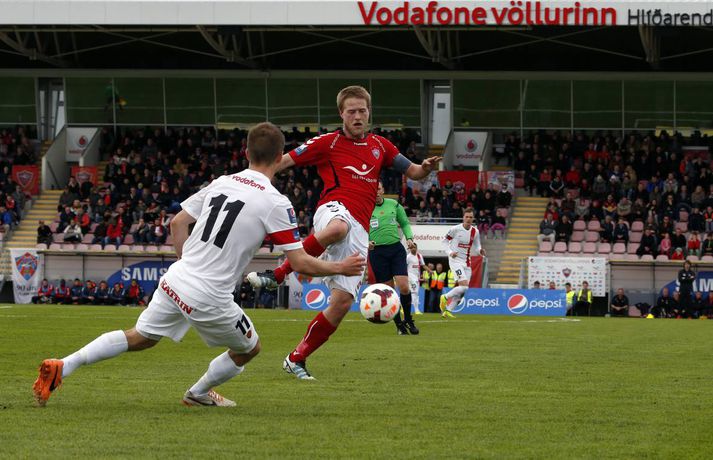 Víkingar fögnuðu sínum öðrum sigri í röð þegar þeir báru sigurorð af Val á útivelli með tveimur mörkum gegn einu. Leikurinn á Vodafone-vellinum í kvöld staðfesti það sem flestir vissu: að Aron Elís Þrándarson er frábær í fótbolta - leikmaður sem skilur á milli í jöfnum leikjum eins og þessum. Hann er ofsboðslega klár í að finna sér pláss milli varnar og miðju mótherjanna, á mjög auðvelt með að fara framhjá varnarmönnum og það er mikil skotógn af honum. Aron er mjög beittur sóknarleikmaður og ef hann sleppur við meiðslin sem hafa plagað hann síðustu ár getur hann náð virkilega langt. Leikurinn var ágætlega spilaður og bæði liðin héldu boltanum vel. Það dró til tíðinda á 28. mínútu þegar Iain Williamson kom Val yfir með skoti úr vítateignum eftir innkast Sigurðar Egils Lárussonar og skalla Hauks Páls Sigurðssonar. En aðeins mínútu seinna jafnaði Aron Elís leikinn með góðu skoti rétt fyrir utan vítateig eftir að hafa leikið laglega á Williamson. Það gerðist fátt næstu mínúturnar og stöðubaráttan var ríkjandi. En á lokamínútu fyrri hálfleiks var Aron Elís nálægt að endurtaka leikinn frá því í jöfnunarmarkinu. Hann lék þá á Hauk Pál og Bjarna Ólaf Eiríksson, sem lék sem miðvörður í kvöld, en skaut framhjá markinu frá vítapunkti. Staðan í hálfleik var 1-1. Seinni hálfleikurinn var rólegur í meira lagi. Valsmenn náðu að loka betur á Aron Elís og voru heldur sterkari aðilinn án þess þó að skapa sér mörg opin færi. Haukur Páll komst næst því skora fyrir Valsmenn; fyrst þegar hann átti bakfallsspyrnu beint á Ingvar Þór Kale og svo þegar hann átti af fjærstönginni sem Ingvar varði vel. Aron Elís hafði, sem áður sagði, haft hægt um sig í seinni hálfleik en þegar sjö mínútur voru til leiksloka lét hann aftur til sín taka. Hann átti þá frábæran sprett, komst upp að endamörkum vinstra megin í vítateignum, sendi boltann fyrir og eftir klafs fór boltinn af varamanninum Henry Monaghan og í netið. Valsmenn bættu í sóknina eftir markið og Ingvar þurfti að taka á honum stóra sínum þegar hann varði skalla Hauks Páls frábærlega. Heimamenn skildu hins vegar mikið pláss eftir aftarlega á vellinum á lokamínútunum og Aron Elís komst í tvígang nálægt því að skora, en Fjalar Þorgeirsson, markvörður Vals, sá við honum. Fleiri urðu mörkin hins vegar ekki og Víkingar fögnuðu góðum sigri sem þeir unnu svo sannarlega fyrir. Liðsheildin var sterk og þeirra lykilmenn, Aron Elís, Ingvar, Igor Taskovic og Alan Löwing, áttu allir afbragðs leik. Valsmenn hljóta að vera fúlir með niðurstöðuna, enda getur það varla talist ásættanlegt fyrir lið sem ætlar sér a.m.k. að komast í Evrópukeppni að tapa á heimavelli fyrir nýliðum. Markaskorarinn Williamson átti góðan fyrri hálfleik en það dró af honum eftir því sem á leikinn leið. Þá átti Bjarni Ólafur flottan leik í miðvarðarstöðunni. Víkingar eru nú í 5. sæti með 13 stig, einu stigi meira en Valur sem situr í sætinu fyrir neðan.Magnús: Vantaði þetta extra "Þetta er grátleg niðurstaða. Við erum, að mér finnst, búnir að vera á fínu róli í þessu móti, en við höfum ekki komist á almennilegt skrið," sagði Magnús Gylfason, þjálfari Vals eftir tapið gegn Víkingi í kvöld. "Það var grátlegt að tapa hérna á heimavelli í nokkuð jöfnum leik, þar sem við höfðum kannski yfirhöndina, en það vantaði eitthvað upp á," sagði Magnús en honum fannst vanta smá meiri kraft í leik sinna manna. "Við komum ákveðnari út í seinni hálfleikinn fannst mér og við sköpuðum okkur 2-3 hálffæri, en það vantaði þetta extra, þetta mark til að komast yfir. "Það var líka klaufalegt hjá okkur að fá strax á sig mark eftir að hafa komist yfir í fyrri hálfleik. Það var niðurdrepandi að fá á sig mark nánast á sömu mínútunni. "Mér fannst Víkingar ekki vera að valda okkur neinum stórvægilegum vandræðum en meðan staðan er 1-1 er stórhættulegt að fara með of marga menn fram í sóknina og við fengum að kenna á því í dag," sagði Magnús að lokum.Ólafur: Höfum oft spilað betur Ólafur Þórðarson, þjálfari Víkinga, kvaðst stoltur af sínum mönnum í kvöld. "Já, það er ég. Við höfum oft spilað betur, en við höfum aldrei fengið fleiri stig fyrir sigur. Við náðum að klára leikinn og það var gott," sagði Ólafur en Víkingar eru nú búnir að vinna tvo leiki í röð í Pepsi-deildinni. "Eins og ég sagði vorum við ekki að spila vel í dag, en við náðum að landa þessum sigri á karakter. Ég vona að við finnum aftur fjölina okkar, en ég var sáttur með karakterinn í dag. "Varnarleikurinn var heilt yfir mjög sterkur, en við gerum smá mistök í markinu. Valsmenn eru með gæðaleikmenn sem refsa og þeir gerðu það svo sannarlega í kvöld, en við náðum sem betur fer að svara strax fyrir okkur og klára svo leikinn í lokin." Ólafur var einnig sáttur með frammistöðu Arons Elísar Þrándarsonar sem skoraði fyrra mark Víkinga í kvöld og lagði upp það síðara. "Hann komst líka einn í gegn og ef hann hefði verið aðeins fljótari að hlaupa hefði hann sett eitt í viðbót. Við vonum að það komi með betra formi," sagði Ólafur léttur að lokum.