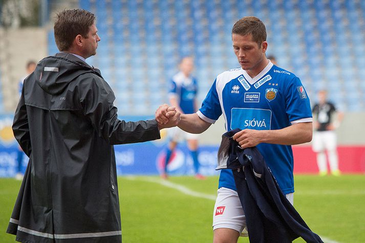 Uppbótartíminn: Skoraði tvö mörk fyrir mömmu 12. júní 2014 11:45 Bjarni Guðjónsson tekur í spaðann á bróður sínum Jóhannesi Karli eftir að sá síðarnefndi var tekinn af velli. Vísir/Daníel Sjöunda umferð Pepsi-deildar karla í knattspyrnu kláraðist í gær. Hverjir áttu góðan dag og hverjir áttu erfiðan dag? Hvað segir tölfræðin og hver var umræðan á Twitter? Vísir gerir hér upp umferðina á léttum nótum. FH er áfram á toppi deildarinnar með 17 stig eftir sjö leiki en það er taplaust rétt eins og Stjarnan sem er í öðru sæti með 15 stig. Eyjamenn og Þórsarar eru enn án stiga og í fallsæti. Umfjöllun og viðtöl úr öllum sex leikjum umferðarinnar:Víkingur - ÞórÍBV - ValurFram - KeflavíkFylkir - BreiðablikFjölnir - FHStjarnan - KRPape Mamadou Faye fagnar marki og bendir á fjölskyldu sína.Vísir/PjeturGóð umferð fyrir ...... Guðjón Pétur Lýðsson, Breiðabliki Miðjumaðurinn sparkvissi var inn og út úr liðinu hjá Ólafi Kristjánssyni og byrjaði á bekknum í síðustu tveimur leikjum hans með Blikana. Guðjón fékk tækifæri í byrjunarliðinu í fyrsta leiknum undir stjórn Gumma Ben. Hann skoraði glæsilegt mark, beint úr aukaspyrnu, og var valinn maður leiksins.... Pape Mamadou Faye, Víkingi Pape hefur byrjað mótið vel og er markahæstur ásamt tveimur öðrum með fjögur mörk. Í heildina er hann búinn að skora fimm mörk í deild og bikar. Pape lék Þórsvörnina grátt í fyrsta leik Víkinga í Víkinni í sumar. Það var ekki verra að mamma var í stúkunni og benti Pape á hana og brosti breitt er hann fagnaði mörkum sínum.... Árbæinga Loksins, loksins eru Fylkismenn komnir með stúku. Á eftir KR hefur ekkert lið verið lengur samfleytt í Pepsi-deildinni en samt sem áður hefur Fylkir ekki getað boðið upp á almennilega áhorfendaaðstöðu. Fylkismenn vígðu nýja stúku með fínu stigi gegn Breiðabliki þar sem tíu uppaldir strákar voru í byrjunarliðinu. Ekki amalegt kvöld í Árbænum.Haukur Baldvinsson átti að skora fyrir fram en skaut í stöng fyrir opnu marki.Vísir/DaníelErfið umferð fyrir ...... Kjartan Henry Finnbogason, KR Framherjinn átti ekki sinn besta dag í Garðabænum þar sem hann fékk gult spjald fyrir leikaraskap og svo annað gult, og þar með rautt, fyrir að rífa niður varnarmann Stjörnumanna. Rúnar Kristinsson, þjálfari KR, sagði orðspor hans illa farið, meðal annars vegna umfjöllunar Stöðvar 2 undanfarin ár, en Kjartan verður í banni á móti Fylki í næstu umferð.... Hauk Baldvinsson, Fram Haukur hefur átt erfitt uppdráttar í Pepsi-deildinni í svolítinn tíma, en fékk svo gullið tækifæri til að vera hetjan á móti Keflavík. Honum tókst aftur á móti að skora ekki í autt markið á meðan markvörður Keflavíkur lá rotaður og fékk hann tvær tilraunir til. Hann hefur ekki sofið vel þá nóttina.... Eyjamenn Enn og aftur fékk liðið á sig mark í uppbótartíma. Í síðustu fjórum leikjum ÍBV í Pepsi-deildinni hafa Eyjamenn fengið á sig mark á lokamínútunum sem hefur kostað liðið stig. FH skoraði sigurmarkið í uppbótartíma, Víkingar skoruðu sigurmark á 80. mínútu og bæði Þórsarar og Valsmenn skoruðu jöfnunarmark í uppbótartíma.Stjörnumenn fögnuðu góðum sigri í gær.Vísir/DaníelTölfræðin: *FH er fyrsta liðið frá árinu 1989 sem er á toppnum eftir sjö umferðir þrátt fyrir að ná ekki að skora tíu mörk í fyrstu sjö leikjum sínum. Valsmenn voru á toppnum eftir sjö umferðir 1989 með markatöluna 9-2. Hvert mark var 1,78 stiga virði en hvert mark hjá FH til þessa í sumar er 1,89 stiga virði. *Það voru 5 jafntefli í fyrstu fjórum umferðum Pepsi-deildarinnar en það hafa verið 10 jafnteflisleikir (þar af níu 1-1 jafntefli) í síðustu þremur umferðum. 21 prósent leikjanna í fyrstu fjórum umferðunum enduðu með jafntefli (5 af 24) en 56 prósent leikja í undanförnum þremur umferðum hafa endað með því að liðin hafa gengið af velli með eitt stig á hvort lið (10 af 18). *Ingiberg Ólafur Jónsson varð sjötti Framarinn í sumar til þess að skora sitt fyrsta mark í efstu deild. Hinir eru þeir Arnþór Ari Atlason (1. umferð), Alexander Már Þorláksson (2. umferð), Hafsteinn Briem (4. umferð), Ósvald Jarl Traustason (4. umferð) og Ásgeir Marteinsson (6. umferð). Framari hefur því skorað sitt fyrsta úrvalsdeildarmark í fimm af sjö leikjum Framara í Pepsi-deildinni í sumar. *Keflvíkingar eru búnir að tapa niður forystu í síðustu þremur leikjum sínum og fá á sig úrslitamark í síðustu fjórum viðureignum. Þessi fjögur stigamörk (eitt sigurmark og þrjú jöfnunarmörk) hafa haft af Keflvíkingum samtals 7 stig. *Víkingar hafa aðeins einu sinni á síðustu tveimur áratugum unnið þrjá af sjö fyrstu leikjum sínum í úrvalsdeildinni (sumarið 2006) og það sumar er jafnframt eina tímabilið (af síðustu sjö) þar sem Víkingum hefur tekist að halda sér í deildinni frá og með árinu 1993. *Valsliðið hefur spilað fleiri jafnteflisleiki (12) en sigurleiki (11) undir stjórn Magnúsar Gylfasonar. Valsmenn hafa aftur á móti aðeins tapað 1 af síðustu 12 leikjum sínum í Pepsi-deildinni.Nýja Fylkisstúkan er glæsileg.Vísir/DaníelSkemmtilegir punktar úr boltavaktinni:Henry Birgir Gunnarsson á Fylkisvelli: „Aðstoðarmaður Gumma Ben, Willum Þór Þórsson, er ekki skráður á skýrslu. Hann er líklega enn að jafna sig eftir þingið.“Anton Ingi Leifsson á Laugardalsvelli: „Haukur Baldvinsson átti marktilraun í markrammann - HA??? Hvernig fór Haukur að þessu? Hann var sloppinn einn inn fyrir, sólaði Árna Frey í markinu, en skaut svo boltanum í stöngina úr algjöru daaaaauðafæri.“Hæstu og lægstu einkunnir umferðarinnar: Ingvar Jónsson, Stjörnunni - 8 Michael Præst, Stjörnunni - 8 Guðjón Pétur Lýðsson, Breið