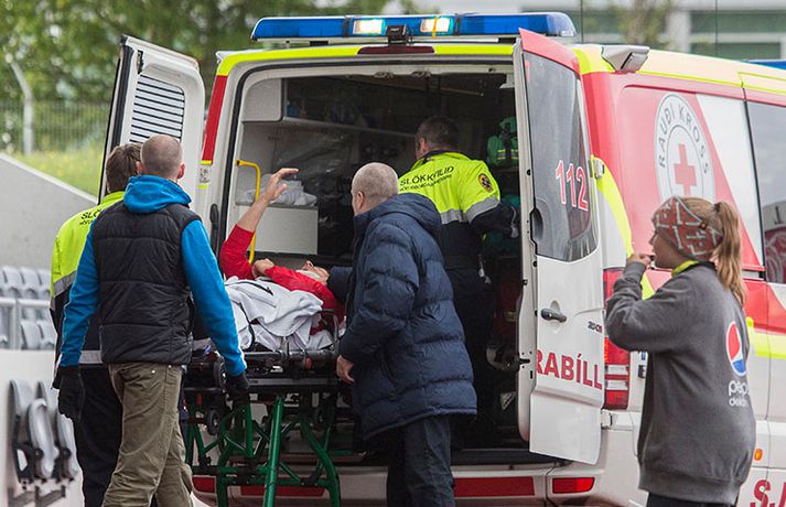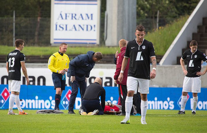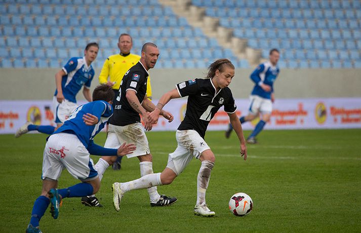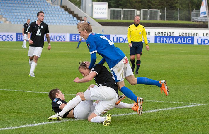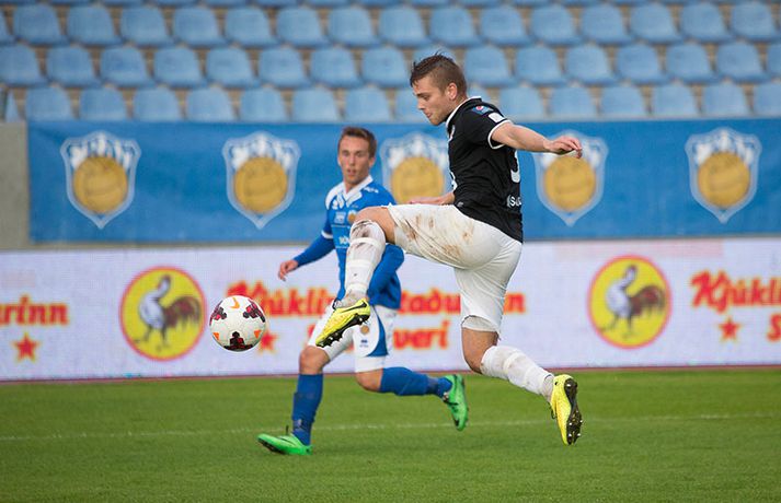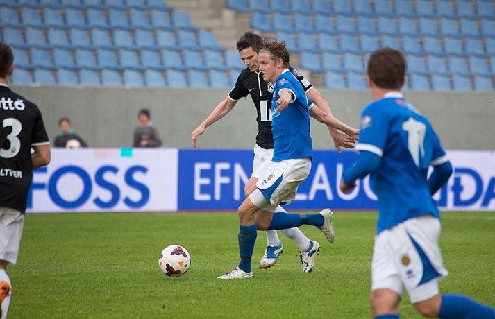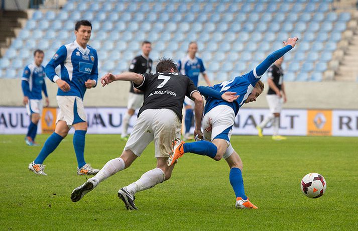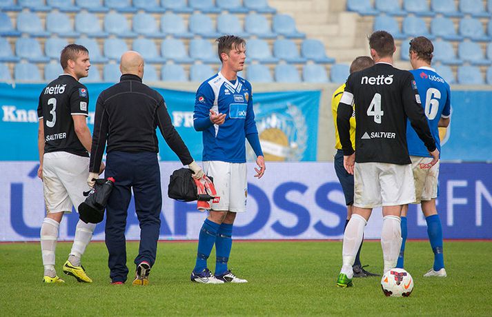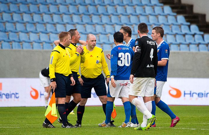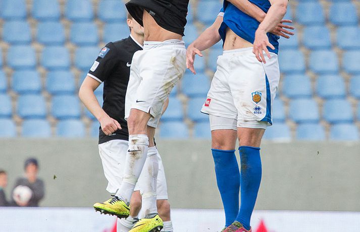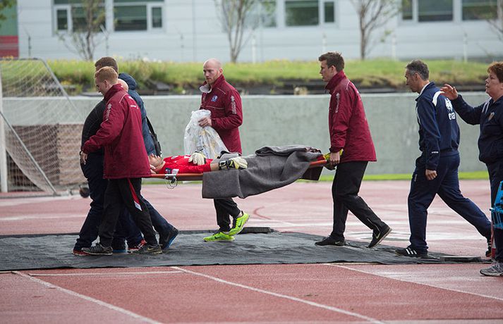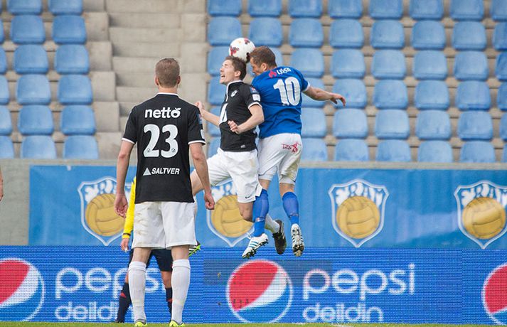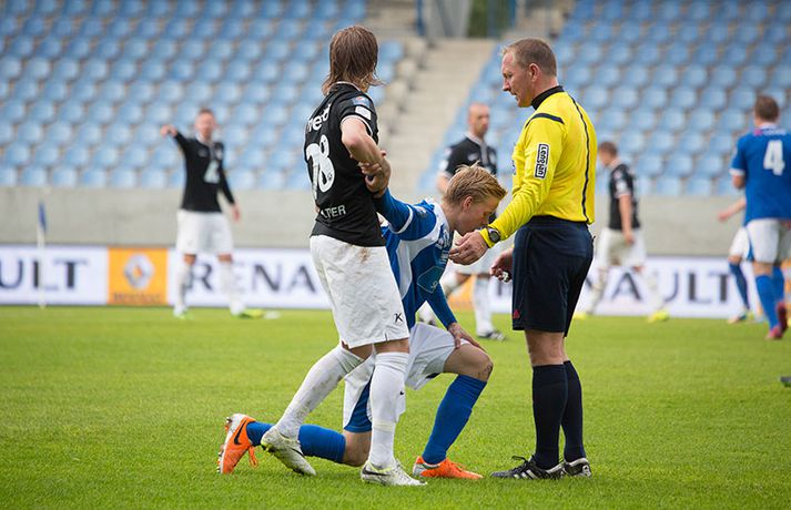Umfjöllun, viðtöl, einkunnir og myndir: Fram - Keflavík 1-1 | Höfuðmeiðsli og rautt spjald í Dalnum Anton Ingi Leifsson skrifar 10. júní 2014 08:30 Vísir/Daníel Fram og Keflavík sættust á skiptan hlut í fyrsta leik sumarsins á þjóðarleikvanginginum í Pepsi-deild karla.Jóhann Birnir Guðmundsson kom Keflavík yfir á tíundu mínútu og Ingiberg Ólafur Jónsson jafnaði metin fyrir Fram skömmu fyrir lok fyrri hálfleiks. Snemma í síðari hálfleik var Árni Freyr Ásgeirsson, markvörður Keflavíkur, borinn af velli og fluttur á sjúkrahús eftir að haf hlotið slæm höfuðmeiðsli og rotast. Ingiberg Ólafur fékk svo að líta rauða spjaldið í lokin en gestirnir úr Reykjanesbæ náðu ekki að færa sér liðsmuninn í nyt. Bæði lið byrjuðu í leikkerfinu 4-3-3, en Orri Gunnarsson var ekki með hjá Fram. Ingiberg Ólafur kom inn í liðið í hans stað og fór beint í bakvörðinn. Hann átti heldur betur eftir að láta til sín taka. Hjá Keflavík voru þrjár breytingar frá jafnteflinu gegn Fjölni í síðasta leik. Jonas Sandqvist var ekki með vegna meiðsla og þeir Halldór Kristinn Halldórsson og Magnús Sverrir Þorsteinsson fengu sér sæti á bekknum. Árni Freyr fór í markið, Endre Ove Brenne fór í vörnina og Elías Már Ómarsson á kantinn. Fyrri hálfleikur var nokkuð fjörugur. Keflvíkingar byrjuðu betur og komust verðskuldað yfir eftir ellefu mínútna leik. Þeir voru sterkari í upphafi leiks, en með tíð og tíma rönkuðu heimamenn við sér í sínum fyrsta leik á tímabilinu í Laugardal. Keflvíkingar fóru mikið upp vængina og það virkaði vel í fyrri hálfleik. Bakverðir Framara voru í tómum vandræðum í upphafi leiks, en þeim óx ásmegin í leiknum. Ingiberg Ólafur jafnaði metin fyrir Framara rétt fyrir hálfleik eftir darraðadans eftir hornspyrnu og þannig var staðan í hálfleik. Í síðari hálfleik var mikið jafnræði með liðunum. Bæði lið áttu nokkrar flottar sóknir, en besta færið fékk varamaðurinn Haukur Baldvinsson þegar hann slapp einn inn fyrir, sólaði Árna Frey í markinu og setti svo boltann á óskiljanlegan hátt í stöngina. Ingiberg Ólafur fékk svo reisupasann þegar tíu mínútur voru eftir af leiknum og bæði lið freistuðu þess að skora sigurmarkið. Allt kom fyrir ekki og liðin skiptu stigunum bróðurlega á milli sín í leikslok. Jafntefli niðurstaðan eftir nokkuð bragðdaufan síðari hálfleik. Fyrri hálfleikur var mun fjörugri en sá síðari. Lítið sem ekkert gerðist í síðari hálfleik og afar fáir sem sköruðu fram úr. Svarti bletturinn á þessum leik í Laugardal voru alvarleg meiðsli Árna Freys, markvarðar Keflavíkur, en hann meiddist þegar Haukur klikkaði dauðafærinu. Ekki sást nægilega vel úr blaðamannastúkunni hvað gerðist, en um alvarleg höfuðmeiðsli var að ræða og kallað var eftir lækni úr stúkunni til að hjálpa sjúkraþjálfurum liðanna.Kristján: Hann er í lagi „Miðað við leikinn þá tel ég að útkoman sé hæfileg. Sóknarleikurinn var ekki nógu markviss, sérstaklega ekki í síðari hálfleik, en varnarleikurinn var fínn. Fyrri hálfleikurinn var jafn og ætli jafntefli sé ekki sanngjörn niðurstaða," sagði Kristján Guðmundsson, þjálfari Keflavíkur, við fjölmiðla í leikslok. „Við vönduðum okkur ekki nægilega vel í sóknarleknum. Hvorki þegar við vorum jafnmargir, né einum fleiri. Það var sorglegt að sjá hvernig við létum boltann fara frá okkur til Framarana." „Við vorum ekki einu sinni að ná að klara sóknirnar okkar á markið. Það komu tvær til þrjár tilraunir í lokin, en ekki mikið meir." Jonas Sandqvist var ekki í marki Keflavíkur í kvöld, en Kristján útskýrði fjarveru hans: „Hann er í góðu standi. Hann er bara í einkaerindum erlendis og það er ekkert sem við ráðum við. Hann verður mættur í næsta leik. Það verður ekkert vandamál," sem vildi ekki gefa upp hvað hann væri að gera erlendis. „Nei, nei, það er hans mál." Árni Freyr Ásgeirsson kom í markið í stað Jonasar og stóð sig með prýði þangað til hann þurfti að fara af velli vegna þungs höfuðhöggs. Kristján sagði að í lagi væri með Árna: „Hann fékk högg á gagnaugað eftir samstuð við Unnar (varnarmann Keflavíkur). Það var farið með hann beint uppá spítala og við vorum að fá þær fregnir að hann er í lagi. Hann rotaðist og það er verið að tjasla honum saman. Hann fær vonandi að fara heim í kvöld," sagði Kristján að lokum við fjölmiðla.Bjarni: Úr varð spjaldasúpa „Við vorum miklu betri í síðari hálfleik en þeim fyrri. Við eigum nokkur mjög góð færi og síðan eigum við nokkrar sóknir sem við eigum að nýta okkur betur á síðasta þriðjungnum," sagði glæsilega klæddur þjálfari Framara, Bjarni Guðjónsson, eftir leik. „Við lendum í því að missa mann útaf. Þá fer maður að hugsa síðustu tíu mínúturnar að maður sé ánægður með eitt stig, en ég hefði viljað vera búinn að klára leikinn þar." Guðmundur Ársæll dómari leiksins spjaldaði gulum spjöldum í gríð og erg. Þau urðu alls níu talsins og skildi Bjarni ekki afhverju þau urðu svona mörg. „Þetta var hörkuleikur. Gulu spjöldin voru fjölda mörg. Mér fannst þessi leikur ekki grófur leikur, en af eitthverjum ástæðum byrjaði dómarinn að henda spjöldum hér og þar. Þegar þú byrjar að henda spjöldum snemma, þá þarftu að klára leikinn þannig og úr varð þessi spjaldasúpa." „Ég get ekki sagt til um það fyrr en á morgun. Sjúkraþjálfarinn er að skoða þá núna og vonandi verða þeir ekki lengi frá," aðspurður út í meiðslin hjá Viktori Bjarka og Jóhannesi Karli. Ingiberg Ólafur fékk rautt spjald þegar tíu mínútur voru til leiksloka og sagði Bjarni að hann hefði haldið að Ingiberg hafi tekið boltann. „Hann