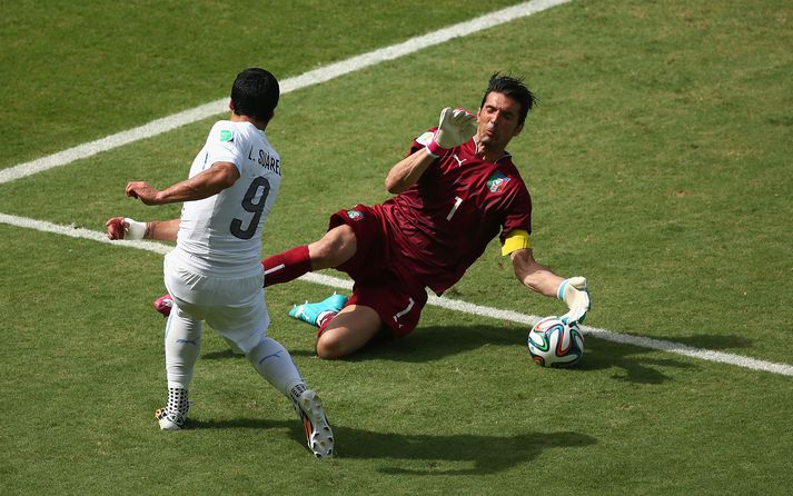 Luis Suárez beit leikmann Ítalíu Úrúgvæinn gæti verið búinn að spila sinn síðasta leik á HM 2014. 24. júní 2014 17:49