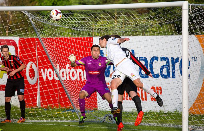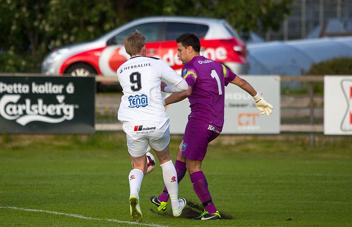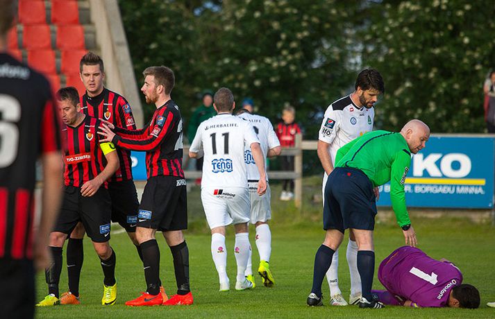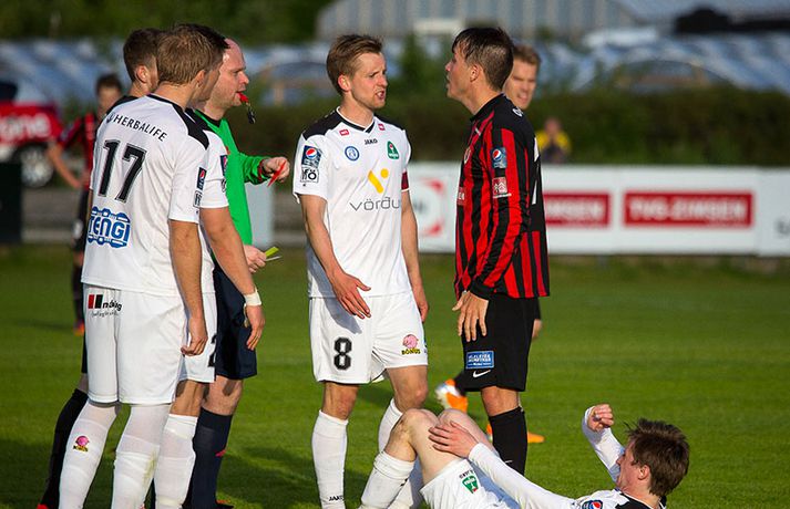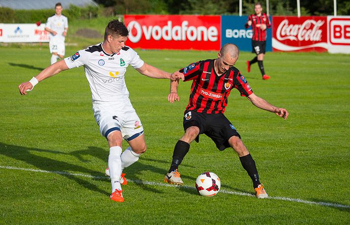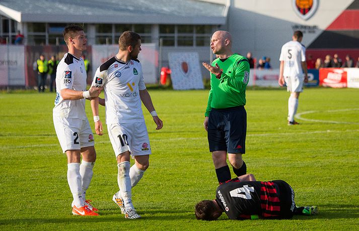 Víkingur vann þriðja leik sinn í röð í Pepsí deild karla í fótbolta í kvöld þegar liðið lagði Breiðablik 1-0 á heimavelli sínum í Víkinni. Pape Mamadou Faye skoraði sigurmarkið á 15. mínútu.Daníel Rúnarsson, ljósmyndari Vísis og Fréttablaðsins, var á leiknum í kvöld og náði þessum skemmtilegu myndum sem má sjá hér fyrir ofan og neðan. Það var jafnræði með liðunum framan af en fyrri hálfeikurinn endurspeglast af markinu sem Pape skoraði. Breiðablik átti horn og upp úr því fékk Víkingur skyndisókn þar sem Aron Elís Þrándarson stakk vörn Breiðabliks af og fann Pape sem átti mjög gott hlaup inn í teiginn og skoraði af stuttu færi. Breiðabliki gekk ágætlega að halda boltanum úti á velli en þegar komið var í nálægð við vítateig Víkings fór allt í baklás og lítið gekk. Víkingar voru aftur móti alltaf hættulegir í sínum sóknaraðgerðum framan af en það setti strik í reikninginn hjá þeim að bæði Pape og Todor Hristov þurftu að fara meiddir af leikvelli í fyrri hálfleik. Víkingur byrjaði seinni hálfleikinn betur og gestirnir virkuðu aldrei líklegir til að skora fyrr en Garðar Örn Hinriksson góður dómari leiksins fór að tína Víkinga af leikvelli. Arnþór Ingi Kristinsson fékk sitt annað gula spjald á 76. mínútu og manni fleiri sóttu Blikar af meiri krafti en áður. Það var þó ekki fyrr en fyrirliðinn Igor Taskovic fékk beint rautt spjald á 89. mínútu að Breiðablik fann leiðina að marki Víkings en markstangirnar og Ingvar Þór Kale sáu til þess að Víkingur héldi út og landaði stigunum þremur. Breiðablik getur nagað sig í handabökin að hafa ekki nýtt þau færi sem liðið skapaði sér en liðið þarf að gera mun betur en liðið gerði þegar bæði lið höfðu ellefu leikmenn inni á vellinum. Þá voru ákvarðanir á síðasta þriðjung vallarins ekki líklegar til árangurs. Víkingur getur vel við unað. Breiðablik náði ágætlega að halda aftur af þeirra hættulegstu leikmönumm, sérstaklega í seinni hálfleik en Víkingur varðist vel og hélt forystunni sem snilli Arons Elísar og Pape skóp. Víkingur er með 16 stig í fimmta sæti deildarinnar eftir 9 leiki en Breiðablik er enn án sigurs, í 10. sæti með 6 stig. Ingvar: Aldrei að vita nema ég bjóði Árna í bíó„Blikarnir sóttu fast á okkur og gáfu okkur erfiðan leik en við héldum út og ég er gríðarlega ánægður með að landa þessum stigum,“ sagði Ingvar Þór Kale markvörður Víkings í leikslok. „Þeir fengu þrjú dauðafæri í lokin og við náðum að henda okkur fyrir það og landa sigrinum. „Það er gríðarlega erfitt að leika manni færri á móti Breiðabliki. Breiðablik er erfiðasta liðið að lenda manni færri á móti. Þeir halda boltanum vel og koma sér í færi. Það var frábært hjá okkur að ná að halda þetta út,“ sagði Ingvar sem náði loksins að leggja Breiðablik að velli eftir að hafa yfirgefið félagið og farið í Víking. „Ég var búinn að spila við þá held ég þrisvar eftir að ég kom yfir aftur og alltaf gengið illa. Það var mjög gott að ná að klára þetta í dag og sætur sigur,“ sagði Ingvar en það vakti óneitanlega athygli þegar Árni Vilhjálmsson fyrrum liðsfélagi Ingvars hljóp að Ingvari eftir að greinilega var brotið á markverðinum og lét hann heyra það. „Það gerist bara í hita leiksins. Ég og Árni eigum eftir að takast í hendur á eftir og það er aldrei að vita nema ég bjóði honum í bíó eða eitthvað,“ sagði Ingvar léttur. Guðmundur: Þurfum menn sem ætla sér að skora mörk„Mér fannst algjör óþarfi að tapa þessum leik hér í Víkinni. Við fengum reyndar á okkur mark sem gerist í fótbolta en það er spurning hvernig þú bregst við þeim,“ sagði Guðmundur Benediktsson þjálfari Breiðabliks. „Mér fannst við spila góðan leik í fyrri hálfleik en það vantaði þessa loka ákvörðun, þessa loka sendingu. Við komum okkur í mjög góðar stöður og boltinn gekk vel hjá okkur hratt en það þarf að skora mörk til að vinna leiki og því miður var það ekki á hjá okkur í dag. „Einum fleiri og um tíma tveimur fleiri þá verður þú að vera með aðeins meiri ís í maganum og hausnum hreinlega til að vera klókari í þeim stöðum sem við fáum hér. Svo getum við litið á það að við setjum hann í tvígang eða þrígang í tréverkið og Kale ver tvisvar ótrúlega. Það er óþarfi að tapa þessum leik,“ sagði Guðmundur. Breiðablik hefur ekki enn unnið leik á tímabilinu, gert sex jafntefli og tapað þremur leikjum til þessa á tímabilinu. „Við erum minntir trekk í trekk að það séu níu leikir komnir og við erum enn að leita að fyrsta sigrinum. Við getum ekkert verið að spá í því. Við þurfum bara að hugsa um næsta leik og reyna að ná sigri þar. „Við höfum spilað hraðmót síðan ég tók við og ég hef verið ánægður með framlagið og það er kraftur í liðinu en það dugir ekki til. Það þarf líka að vera ákveðin skynsemi í leik liðsins og hana vantaði í dag. „Það þarf menn sem ætlar sér ekkert annað en að skora mörk. Þó ég sé ekkert hrifinn af því að fá á mig mörk þá er allt í lagi að fá á sig eitt mark hér því við áttum að skora fleiri mörk en Víkingur í kvöld. Hvort þessir leikmenn séu innan hópsins eða ekki til hjá okkur, við þurfum að skoða það,“ sagði Guðmundur sagði vildi þó ekki meina að hann væri farinn að horfa til þess að leikmannaglugginn opni til að styrkja liðið þó hann hafi viðurkennt að það þurfi að skoða þau mál verði ekki breyting á gengi liðsins.Vísir/DaníelVísir/DaníelVísir/DaníelVísir/DaníelVísir/DaníelVísir/DaníelVísir/DaníelVísir/Daníel