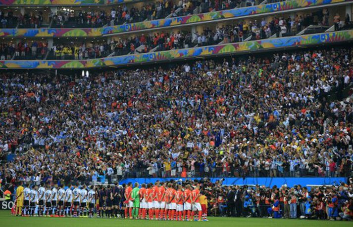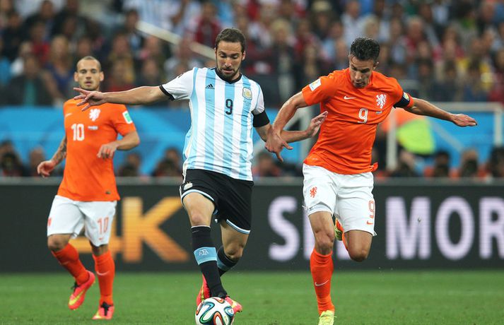 Sergio Romero var hetja Argentínumanna sem mæta Þjóðverjum í úrslitaleik HM í Brasilíu. Staðan að loknum venjulegum leiktíma og framlengingu var markalaus og því þurfti vítaspyrnukeppni til að knýja fram úrslit. Romero varði tvívegis í vítaspyrnukeppninni - frá þeim Ron Vlaar og Wesley Sneijder en sá fyrrnefndi hafði átt stórleik í vörn hollenska liðsins. Argentínumenn nýttu að sama skapi allar sínar spyrnur og tryggðu sér þar með farseðilinn í úrslitaleikinn á sunnudagskvöld. En þrátt fyrir dramatíkina í vítaspyrnukeppnina var leikurinn óspennandi og olli vonbrigðum, sér í lagi eftir þá skemmtun sem Þjóðverjar buðu upp á í sinni undanúrslitaviðureign gegn Brasilíu í gær. Brasilía og Holland eigast því við í leiknum um þriðja sæti mótsins á laugardagskvöldið.Robin van Persie hafði verið tæpur fyrir leikinn vegna magakveisu en hann var í byrjunarliðinu í kvöld, sem og Nigel De Jong sem hafði verið meiddur. Báðir fóru reyndar af velli - De Jong snemma í síðari hálfleik og Van Persie í framlengingunni. Leikurinn einkenndist fyrst og fremst af baráttu og gerðist því fátt markvert í venjulegum leiktíma. Hollendingar komust þó nálægt því að tryggja sér sigur í uppbótartíma þegar Arjen Robben var við það að sleppa í gegn. Javier Mascherano kom honum hins vegar til varnar á ögurstundu. Áfram var barist í framlengingunni og fengu Argentínumenn tvö þokkaleg færi í síðari hálfleik hennar en nýttu þau ekki. Þar við sat og réðust úrslitin sem fyrr segir í vítaspyrnukeppni. Bæði lið hafa á að skipa frábærum sóknarmönnum en í dag voru það varnarmennirnir sem voru í aðalhlutverki og áttu góðan dag. En fyrir vikið var leikurinn ekki mikið fyrir augað en knattspyrnuunnendur voru góðu vanir eftir 7-1 stórsigur Þýskalands á Brasilíu í hinni undanúrslitaviðureigninni í gær.Sergio Romero var hetja Argentínu.Vísir/GettyVísir/GettyVísir/GettyVísir/GettyVísir/GettyTweets about '#hm365 OR #hmruv'