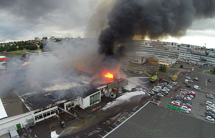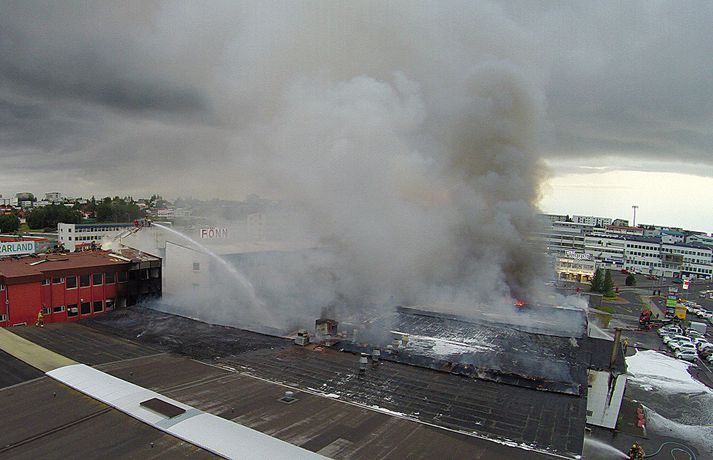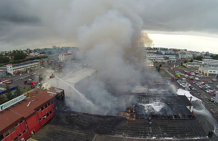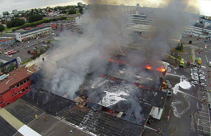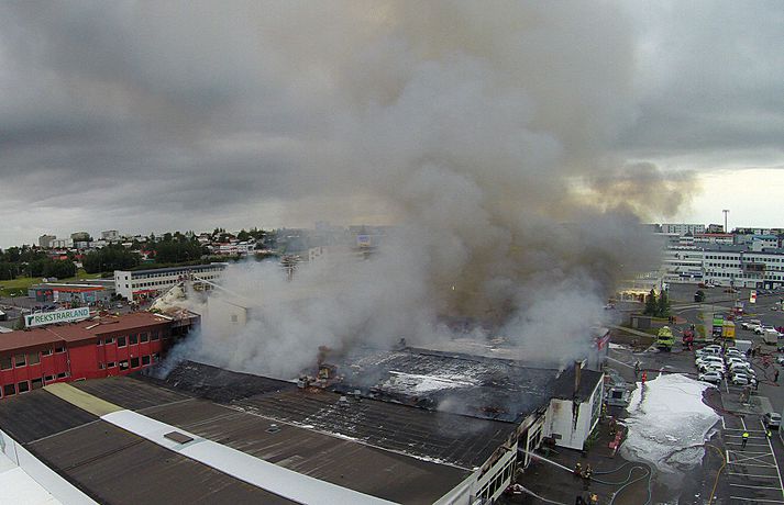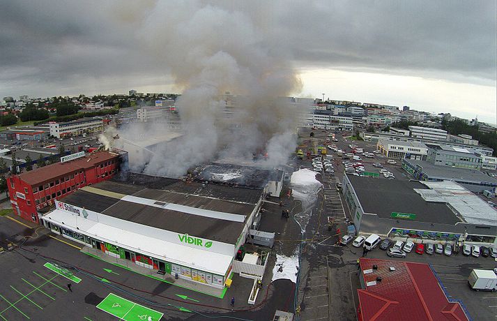 Miklar gassprengingar í Rekstrarlandi | Myndband Kolbeinn Tumi Daðason skrifar 6. júlí 2014 23:26 Andri Ómarsson hjá Helicam.is tók myndirnar. „Farið þið frá, ef þetta springur lengra út,“ sagði slökkviliðsmaður við tökumann og fréttamann Stöðvar 2 sem voru á vettvangi í Skeifunni í kvöld. Líkt og sjá má á myndbandinu að ofan urðu miklar sprengingar í húsnæði Rekstrarlands. Olís rekur verslunina. Brutu slökkviliðsmenn rúður í Rekstrarlandi í varúðarskyni við sprengingarnar. Gísli Berg, tökumaður Stöðvar 2, náði þessum myndbandinu í kvöld. Ljósmyndirnar tók Andri Ómarsson hjá Helicam.is.Loftmynd á svæðinu sem Andri Ómarsson hjá Helicam.is tók.Myndir Reykjavík Stórbruni í Skeifunni Mest lesið Veðurvaktin: Snjókoman rétt að byrja og víða erfið færð Veður Ungur Miðflokksmaður gengst við rasisma og segir af sér Innlent Snjókoman rétt að byrja Innlent Bílar út af veginum á Reykjanesbraut Innlent Eldur í blokk við Ljósheima Innlent Flugmaðurinn sem fórst millilenti oft í Reykjavík Innlent Ráðgjafinn ráðinn í tímabundið starf eftir dýra skreppitúra Innlent Skvísur geti virkað sem hálfgerðir þroskaþjófar Innlent Fjölmargir farþegar fastir í flugvélum á Keflavíkurflugvelli Innlent Játar að hafa myrt Shinzo Abe Erlent Fleiri fréttir Reglur brotnar og þjónusta sem bjóða ætti út Þarf að borga bætur þrátt fyrir breytingar á hlaupahjólinu Hvatt til varúðar vegna snjóflóðahættu á suðvesturhorninu Meiri kvika en í síðasta gosi Eldur í blokk við Ljósheima Flugmaðurinn sem fórst millilenti oft í Reykjavík Halla leiðir krabbameinsráð ráðherra Snjókomumet og umferðaröngþveiti Segir sameiginlegum gildum Norðurlanda ógnað Fjölmargir farþegar fastir í flugvélum á Keflavíkurflugvelli Ungur Miðflokksmaður gengst við rasisma og segir af sér Sturlað ástand og United vettlingar prjónaðir í bílnum Mesta snjódýpt í Reykjavík sem mælst hefur í október Viðbragðsaðilar í mikilli hættu vegna bíla á sumardekkjum Bílar út af veginum á Reykjanesbraut Vill heimila Samkeppniseftirlitinu að ráðast í húsleitir Snjókoman rétt að byrja Píratar berjist gegn „rísandi bylgju lýðskrums og fasisma“ Skvísur geti virkað sem hálfgerðir þroskaþjófar Ráðgjafinn ráðinn í tímabundið starf eftir dýra skreppitúra Misvægi atkvæða bitnar mest á Kraganum Heitavatnslaust á Suðurnesjum og rafmagnslaust víða um land Skreppiferðir í Jysk meðal þess sem ráðgjafi rukkaði fyrir „Ég tel ekki tilefni til að íhuga stöðu mína“ Áhyggjur af lánaframboði og ógnarlangar biðraðir Vara við ferðum á Fagradalsfjall þar sem aðstæður geti orðið hættulegar Kristmundur verður lögreglustjóri á Austurlandi „Vonandi klárast þetta á morgun“ Sá látni var á rjúpnaveiðum þegar hann varð fyrir voðaskotinu Kvartanir mannsins um ómannúðlega meðferð áður til skoðunar hjá NEL Sjá meira