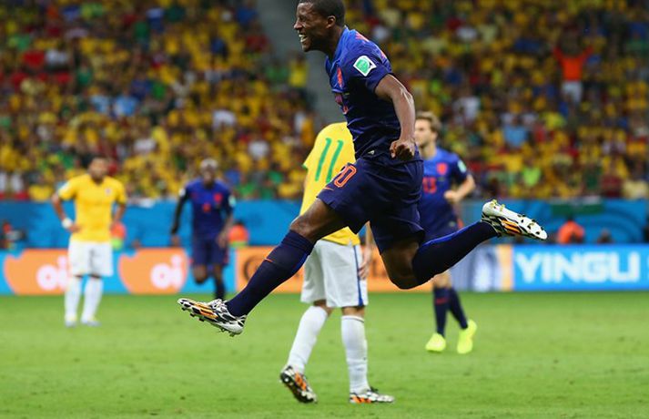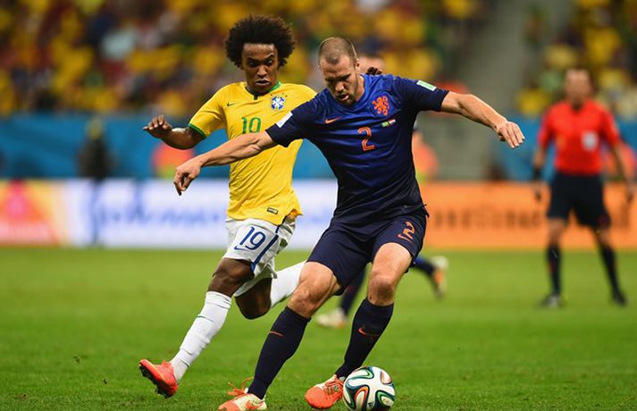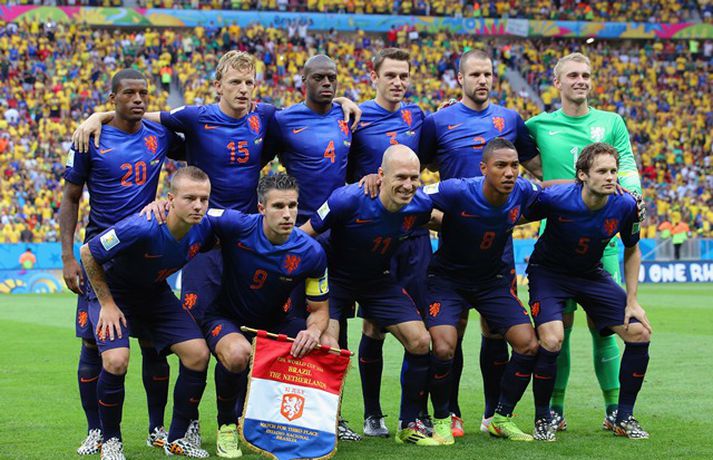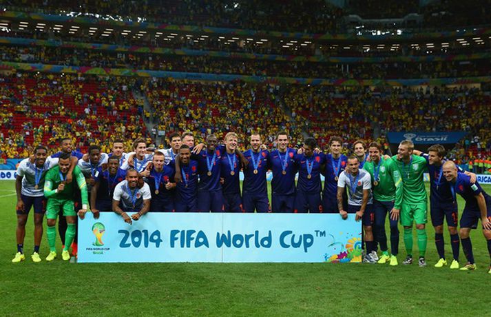 Öruggur sigur Hollands í leiknum um bronsið | Myndir Ingvi Þór Sæmundsson skrifar 12. júlí 2014 00:01 Hollendingar höfðu ástæðu til að gleðjast í kvöld. Vísir/Getty Holland tryggði sér bronsverðlaun á HM í fótbolta með 3-0 sigri á Brasilíu í leiknum um þriðja sætið í Brasilíuborg í kvöld. Robin van Persie, Daley Blind og Georginio Wijnaldum skoruðu mörk Hollendinga. Hollendingar, sem tefldu fram nánast óbreyttu liði frá undanúrslitaleiknum gegn Argentínu á miðvikudaginn, tóku forystuna á strax á þriðju mínútu þegar van Persie skoraði úr vítaspyrnu. Alsírski dómarinn, Djamel Haimoudi, blés í flautu sína og benti á vítapunktinn eftir að hafa metið það sem svo að Thiago Silva, fyrirliði Brasilíu, hefði togað Arjen Robben niður innan vítateigs. Silva slapp hins vegar með gult spjald. Hollendingar bættu svo við marki á 17. mínútu þegar Blind þrumaði boltanum í markið eftir mistök miðvarðarins Davids Luiz sem átti erfitt uppdráttar í kvöld líkt og í 7-1 tapinu gegn Þýskalandi í undanúrslitunum. Brasilíumenn voru meira með boltann það sem eftir lifði leiks, en mörkin létu á sér standa. Það var helst Oscar, leikmaður Chelsea, sem ógnaði hollensku vörninni að einhverju viti. Hann fékk hins vegar litla hjálp frá samherjum sínum. Wijnaldum bætti svo þriðja marki Hollands við í uppbótartíma eftir fyrirgjöf varamannsins Daryls Janmaat. Lokatölur 3-0, Hollendingum í vil sem unnu til sinna fyrstu bronsverðlauna á HM.Louis van Gaal fékk góða kveðjugjöf í sínum síðasta leik sem stjóri hollenska landsliðsins, en tekur sem kunnugt er við sem þjálfari Manchester United eftir HM. HM 2014 í Brasilíu Mest lesið „Gagnrýnin og viðbjóðurinn aldrei verið meiri“ Handbolti Farinn að leita að rakara og vill fá tíma 10. febrúar Enski boltinn Lindsey Vonn úr leik eftir hrikalegt fall í fyrstu ferð Sport Íslandsmeistari í ólympískum lyftingum þremur vikum eftir að hún missti fóstur Sport Keppandi Suður-Kóreu á Ólympíuleikunum fæddist á Íslandi Sport Orri aftur með draumainnkomu Fótbolti Trump um baulið á Vance á setningu ÓL: „Er það satt? Það kemur á óvart“ Sport Mætast undir allt öðrum kringumstæðum en áður Enski boltinn Dagur hringaður seint og þurfti að hætta Sport Ákærður fyrir morðið á kærustu sinni Sport Fleiri fréttir Mætast undir allt öðrum kringumstæðum en áður Farinn að leita að rakara og vill fá tíma 10. febrúar Orri aftur með draumainnkomu Albert meiddist og Fiorentina missti frá sér sigurinn Kristian Nökkvi á skotskónum í Hollandi Brentford upp að hlið Liverpool eftir endurkomusigur á Newcastle Mikel Arteta segir að níu stiga forysta Arsenal þýði „ekkert“ Fótboltalið Vals semur við son Alexanders Petersson Börsungar gefa ekkert eftir á toppnum Hamrarnir sóttu sigur, Everton sneri leiknum en Villa missti niður forystu Skytturnar með níu stiga forskot á toppnum Palmer með þrennu í fyrri hálfleik gegn Úlfunum Fær fjögurra leikja bann og missir af Lundúnaslagnum United fagnaði fjórða sigrinum í röð Sjáðu mörkin sem Sean Dyche fannst alveg skelfileg Biður Liverpool að slaka á reglunum Fara fögrum orðum um Íslendinginn unga Stóð með sjálfri sér: „Fann að ég myndi ekki ná að blómstra í þessu umhverfi“ Dagskráin í dag: Risa dagur í enska boltanum Risa sigur fyrir Leeds United Lengjubikarinn: Fylkir vann Breiðablik og FH skoraði sjö Hjörtun í vörn Íslands mættust ekki í kvöld Arnór fékk allt greitt frá Rússunum og saknar landsliðsins Þvertaka fyrir að þjálfarinn stökkvi frá borði rétt fyrir HM Arteta með lykilmenn meidda og svaraði ásökunum Segir fótboltasérfræðinga bera ábyrgð FH sækir sænskan miðvörð Úlfar í sauðagæru? „Myndi segja að þetta sé framsækin nálgun“ Sakar Arsenal um virðingarleysi „Skrítið að klæðast grænu en það mun venjast hratt“ Sjá meira