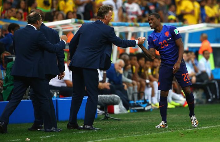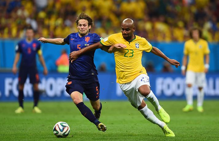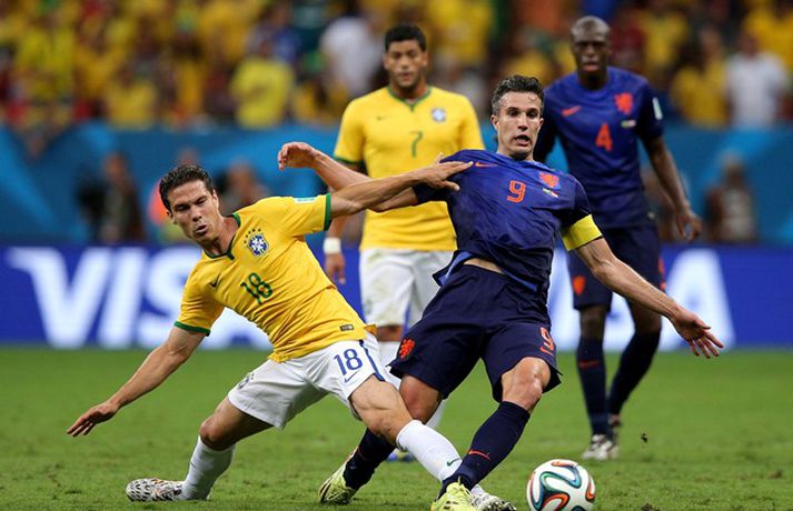 Holland tryggði sér bronsverðlaun á HM í fótbolta með 3-0 sigri á Brasilíu í leiknum um þriðja sætið í Brasilíuborg í kvöld. Robin van Persie, Daley Blind og Georginio Wijnaldum skoruðu mörk Hollendinga. Hollendingar, sem tefldu fram nánast óbreyttu liði frá undanúrslitaleiknum gegn Argentínu á miðvikudaginn, tóku forystuna á strax á þriðju mínútu þegar van Persie skoraði úr vítaspyrnu. Alsírski dómarinn, Djamel Haimoudi, blés í flautu sína og benti á vítapunktinn eftir að hafa metið það sem svo að Thiago Silva, fyrirliði Brasilíu, hefði togað Arjen Robben niður innan vítateigs. Silva slapp hins vegar með gult spjald. Hollendingar bættu svo við marki á 17. mínútu þegar Blind þrumaði boltanum í markið eftir mistök miðvarðarins Davids Luiz sem átti erfitt uppdráttar í kvöld líkt og í 7-1 tapinu gegn Þýskalandi í undanúrslitunum. Brasilíumenn voru meira með boltann það sem eftir lifði leiks, en mörkin létu á sér standa. Það var helst Oscar, leikmaður Chelsea, sem ógnaði hollensku vörninni að einhverju viti. Hann fékk hins vegar litla hjálp frá samherjum sínum. Wijnaldum bætti svo þriðja marki Hollands við í uppbótartíma eftir fyrirgjöf varamannsins Daryls Janmaat. Lokatölur 3-0, Hollendingum í vil sem unnu til sinna fyrstu bronsverðlauna á HM.Louis van Gaal fékk góða kveðjugjöf í sínum síðasta leik sem stjóri hollenska landsliðsins, en tekur sem kunnugt er við sem þjálfari Manchester United eftir HM.