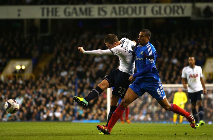 Gylfi Þór: Erfitt að kveðja Tottenham Tómas Þór Þórðarson skrifar 23. júlí 2014 20:56 Gylfi Þór Sigurðsson hefur yfirgefið Tottenham eftir tvö tímabil í Lundúnum. vísir/getty „Þetta er bara fínt. Það er samt svolítið skrítið að vera nýr leikmaður á stað þar sem maður þekkir allt á alla," segir Gylfi Þór Sigurðsson, landsliðsmaður í knattspyrnu, í samtali við Vísi. Gylfi Þór gekk í kvöld í raðir Swansea á nýjan leik frá Tottenham, en hann skrifaði undir fjögurra ára samning við velska félagið eftir að standast læknisskoðun fyrr í dag. Gylfi var í herbúðum Swansea seinni hluta tímabilsins 2011/2012 og skoraði þá sjö mörk í 18 deildarleikjum, en frammistaða hans þá varð til þess að Tottenham keypti Hafnfirðinginn. Landsliðsmaðurinn var pollrólegur upp á hótelherbergi og nýbúinn að snæða þegar blaðamaður Vísis heyrði í honum hljóðið í kvöld. „Það er svolítið síðan að þetta kom fyrst upp,“ segir Gylfi aðspurður um aðdragandann að vistaskiptunum. „Þetta byrjaði með áhuga frá Swansea sem varð svo alltaf meiri. Þetta hefur aðeins dregist á langinn undanfarna dagana því ég þurfti að ferðast frá Seattle.“Gylfi fagnar marki fyrir Swansea gegn WBA 2012.vísir/gettyGylfi þekkir augljóslega vel til hjá Swansea eftir að hafa dvalið í herbúðum liðsins í hálft ár. Það hefur misst tvo framliggjandi menn í sumar og borgar nú næstdýrustu upphæð í sögu félagsins fyrir Gylfa. Honum er ætlað stórt hlutverk á næstu leiktíð. „Það var einn af þeim hlutum sem spilaði inn í auk þess hvað ég var ánægður hérna síðast og hversu gel gekk. Ég þekki þjálfarann GaryMonk líka vel og þeir sýndu bara mikinn áhuga á að fá mig,“ segir Gylfi, en liðið hefur haldið áfram stefnu sinni að spila fallegan fótbolta og það líkar okkar manni. „Michael Laudrup hélt því áfram og liðið hefur gert það einnig undir stjórn Gary Monk. Það breytist ekkert. Þetta er lið sem vill spila boltanum og vera mikið í stuttum sendingum. Það er bara vonandi að það gangi vel áfram.“Gylfi Þór skoraði mark ársins hjá Spurs á síðustu leiktíð gegn Hull í deildabikarnum.vísir/gettyGylfi var tvö tímabil hjá Tottenham og upplifði góða tíma sem slæma. Hann þurfti að sætta sig við mikla bekkjarsetu á síðustu leiktíð, en hann hefur þó vitaskuld margt gott um Lundúnaliðið að segja. „Þessi tími er búinn að vera fínn. Manni finnst þetta hafa verið lengi að líða þó um séu að ræða aðeins tvö tímabil. Það var frábær upplifun til dæmis að spila í Lundúnaslag á móti Arsenal og Chelsea og að skora á móti Chelsea á heimavelli var frábært. Svo var gaman að spila í Evrópudeildinni og slá þar út lið eins og Inter. Ég átti margar góðar stundir hjá Tottenham og auðvitað er alltaf leiðinlegt að kveðja félag sem maður hefur notið þess að vera hjá. En ég tek þessa ákvörðun af fótboltalegum ástæðum,“ segir Gylfi. „Það yrði leiðinlegt að horfa til baka eftir fótboltaferilinn og hafa eytt of miklum tíma á bekknum. Það er eflaust það versta sem knattspyrnumaður gerir að hætta þannig vonandi fæ ég bara sem flestar mínútur og flesta leiki hjá Swansea.“Gylfi Þór í leik með Tottenham gegn Stoke.vísir/gettyTottenham keypti sæg af miðjumönnum síðustu tvö sumur sem skapaði mikla samkeppni fyrir Gylfa. Ekki hjálpaði til að hann var oft látinn spila úti á vinstri kantinum sem hann viðurkennir fúslega að honum líkar einfaldlega ekki. „Maður vissi auðvitað að samkeppnin yrði mikil, sérstaklega á miðjunni þar sem það gátu 4-5 leikmenn spilað mína stöðu fremst á miðjunni. En að spila á vinstri kantinum pirraði mig meira,“ segir Gylfi. „Eins og flestir vita líður mér best inn á miðjunni. Ég er ekkert þessi fljóta týpa á kantinum sem sprettar framhjá bakverði og negli fyrirgjöf inn á teiginn eins og Gareth Bale eða Andros Townsend. Ég er allt öðruvísi leikmaður. Vonandi fæ ég bara að spila sem númer tíu hjá Swansea eða sem númer átta inn á miðri miðjunni.“Í baráttunni við Rio Ferdinand með Swansea 2012.vísir/gettyTottenham er í æfingaferð í Bandaríkjunum og var Gylfi í Seattle þegar hann þurfti að fljúga til Swansea og ganga frá sínum málum. Hann náði að kveðja flesta leikmenn liðsins. „Þeir voru að fljúga til Toronto þegar ég var að fara þannig ég rétt náði að kveðja þá. Það var samt hefð fyrir því að mínir bestu félagar voru alltaf seldir; strákar eins og GarethBale, Jermaine Defoe og Tom Huddlestone. En við ungu strákarnir í liðinu höfum haldið hópinn og það var leiðinlegt að kveðja þá allt í einu,“ segir Gylfi sem er ekki eini maðurinn sem Swansea hefur keypt í sumar. „Það hafa verið keyptir góðir menn undanfarin ár og það var algjör snilld að fá BafétimbiGomis. Hann er sterkur leikmaður og svo yrði snilld að halda WilfriedBony. Swansea er búið að styrkja sig vel í þessum glugga og vonandi heldur það áfram,“ segir hann. Gylfi þekkir hvern krók og kima í Swansea eftir hálfs árs dvöl þar fyrir tveimur árum, en var eitthvað sérstakt sem hann gerði í kvöld; eitthvað sem hann saknaði? „Ekkert af viti ennþá. Ég fór bara á gamla ítalska veitingastaðinn sem ég fór oft á og fékk mér kjúklingapasta til að taka með upp á hótel,“ segir Gylfi Þór Sigurðsson. Enski boltinn Tengdar fréttir Gylfi Þór orðinn leikmaður Swansea Skrifaði undir fjöggurra ára samning við velska félagið. 23. júlí 2014 18:50 Gylfi Þór dýrasti íslenski knattspyrnumaður sögunnar Íslenski landsliðsmaðurinn verið seldur fyrir samtals fimm milljarða króna. 22. júlí 2014 22:15 Mest lesið Sjáðu geggjaðan snúning Alberts áður en hann skora