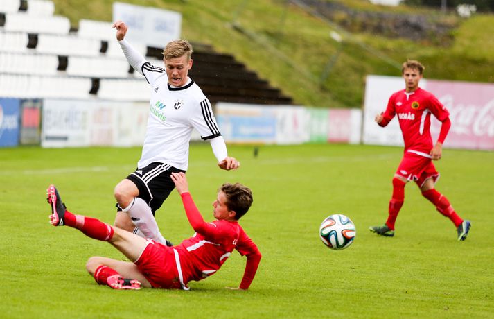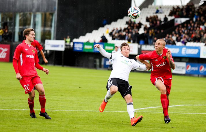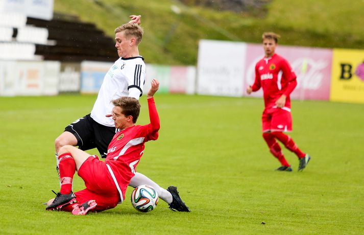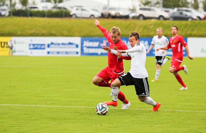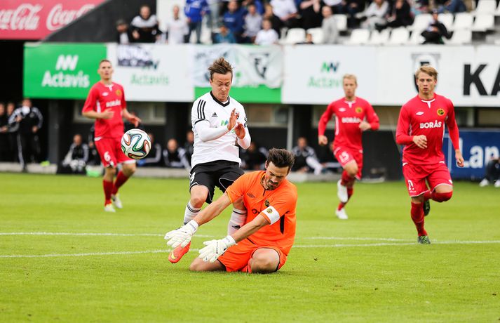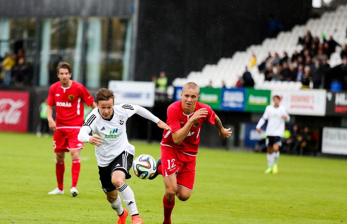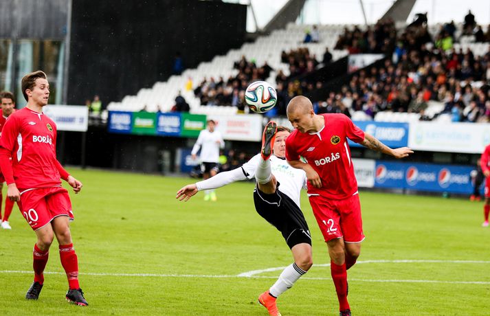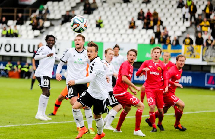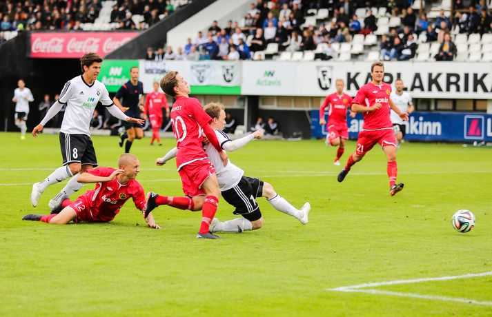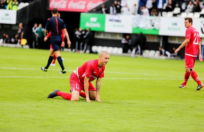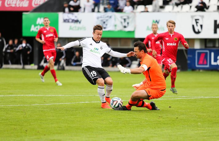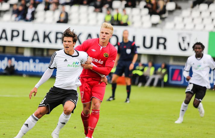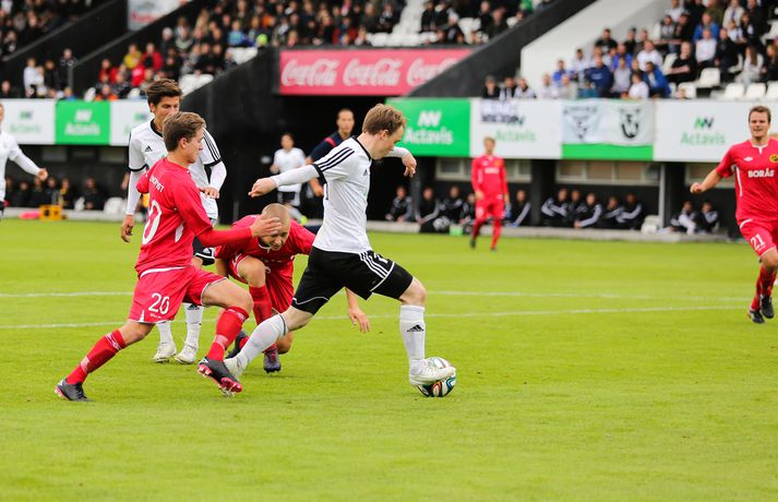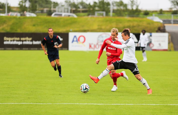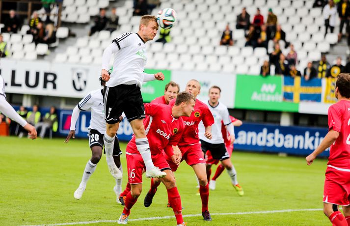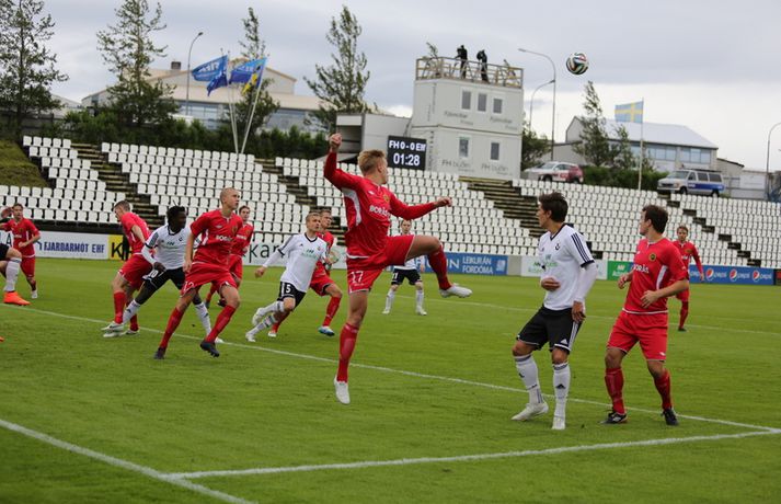 FH-ingar börðust hetjulega í 2-1 sigri á Elfsborg í undankeppni Evrópudeildarinnar í kvöld en hafa lokið leik í Evrópukeppninni í ár. FH komst í 2-0 en náðu ekki að bæta við þriðja markinu sem þeir þurftu og náðu gestirnir að gera út um einvígið í uppbótartíma.Arnþór Birkisson, ljósmyndari Vísis og Fréttablaðsins var á leiknum og má sjá myndasyrpu frá honum í myndaalbúminu hér fyrir ofan. Ljóst var fyrir leikinn að verkefni dagsins yrði erfitt. Eftir að hafa haldið lengi vel í lið Elfsborg ytra í fyrri leik liðanna náðu Svíarnir mörkum rétt fyrir lok leiksins og unnu öruggan 4-1 sigur. Það var hinsvegar ekki að sjá neina uppgjöf hjá FH-ingum í upphafi leiks. Atli Guðnason fékk tvö góð færi á fyrstu mínútum leiksins sem fóru forgörðum en hann lét ekki bjóða sér slíkt þrisvar. Atli fékk þá sendingu inn fyrir vörn Elfsborg frá Kassim Doumbia, tók boltann snyrtilega niður og renndi boltanum í netið og skyndilega voru FH-ingar komnir aftur í einvígið. Meira jafnræði var á með liðunum það sem eftir lifði hálfleiksins en FH-ingar voru þó alltaf líklegri til þess að skapa sér eitthvað. FH náði að bæta við marki um miðbik seinni hálfleiks sem skapaði gríðarlega mikla spennu á lokamínútum leiksins. Dalvíkingurinn Atli Viðar Björnsson fékk þá boltann á miðjum vítateig gestanna og átti lúmskt skot sem fór af varnarmanni Elfsborg og í netið. Heimamenn reyndu hvað þeir gátu á lokamínútum leiksins en sænska liðið lagðist aftar á völlinn og setti í lás. Náðu leikmenn Elfsborg að minnka muninn skömmu fyrir lok leiksins þegar Mikkel Beckmann nýtti sér mistök Péturs Viðarssonar og vippaði yfir Róbert Örn Óskarsson í marki FH. Þrátt fyrir hetjulega baráttu náðu FH-ingar ekki að bæta við þriðja marki leiksins og lauk leiknum því með 2-1 sigri FH og einvíginu með 5-3 sigri Elfsborg. Gríðarlega svekkjandi niðurstaða fyrir FH eftir tvo góða leiki en einbeitingarleysi í fyrri leiknum kostaði liðið á endanum. Ólafur: Vona að við gerum betur á næsta áriLeikmenn Elfsborg hreinsa eftir hornspyrnu Ólafs Páls.Vísir/Arnþór„Við getum verið stoltir af þessu en við hefðum samt sem áður átt að vinna einvígið,“ sagði Ólafur Páll Snorrason, fyrirliði FH, svekktur eftir 2-1 sigur á Elfsborg í kvöld. „Við klúðruðum leiknum fyrir okkur sjálfum með mistökum sem lið og við náðum ekki að klóra okkur upp úr því.“ Verkefni dagsins var erfitt en FH tapaði fyrri leiknum 1-4 í Svíþjóð. „Við höfðum fulla trú á verkefninu allt frá upphafi. Við vissum hvað við ætluðum að gera og fara út í og það gekk að flestu leyti upp í dag. Við gerðum hinsvegar nokkur mistök og við lærum vonandi af því.“ FH var nálægt því að komast í fjórðu umferð undankeppninnar annað árið í röð. „Við verðum vonandi í Evrópukeppni á næsta ári og getum byggt á þessu. Enn byggjum við á það sem við höfum verið að gera síðustu ár og ná góðum árangri í Evrópukeppnunum en ég vona innilega að við gerum betur á næsta ári,“ sagði Ólafur sem var ánægður að heyra að Stjarnan komst áfram. „Við erum alltaf að byggja á ákveðinni reynslu og hugmyndafræði í Evrópukeppnum og við erum orðnir mjög reynslumiklir á þessu sviði. Ég var að heyra að Stjarnan komst áfram gegn sterku liði og ég vill bara óska þeim til hamingju að ná þessum árangri á sínu fyrsta ári. Þetta er frábær árangur hjá nýliðum í þessari keppni,“ sagði Ólafur sem óskaði þeim góðs gengis. „Ég óska þeim góðs gengis og góðrar skemmtunar og maður verður bara stoltur af því að sjá íslensk lið komast svona langt. Þeir náðu að stíga sama skref og við náðum í fyrra og þeir eru grátlega nálægt því að ná frábærum árangri og sleppa við hundleiðinlegt undirbúningstímabil á Íslandi næsta vetur.“ Klas: FH myndi standa sig vel í AllsvenskanVísir/Arnþór„Ég er sáttur með úrslitin, verkefni dagsins var að komast áfram og við náðum því,“ sagði Klas Ingesson, þjálfari Elfsborg, sáttur eftir leikinn. „Við lögðum mikla áherslu á það að halda ró okkar jafnvel þótt FH myndi skora eitt-tvö mörk eða við myndum fá á okkur rautt spjald. Okkur gekk illa að skapa færi en vörnin hélt vel.“ Klas var óánægður með margt í leik Elfsborg en hrósaði varnarlínu sinni eftir leikinn. „Við vörðumst mjög vel í þessum leik. Þegar FH komst yfir nýttu þeir sér vel að við þurftum að færa miðjumann í miðvörðinn vegna þess að miðvörðurinn var meiddur. Okkur gekk illa að senda boltann á milli og að sækja hratt en varnarlínan bjargaði okkur.“ Klas lagði mikla áherslu á það fyrir leik að vanmeta ekki FH. „Starf þjálfarans er að halda leikmönnunum á tánum og við lögðum mikla áherslu á þennan leik. Við vissum að með því að komast áfram í kvöld er líklegra að við komust í Evrópukeppni, verð leikmanna hækkar og við fáum auknar tekjur í kassann.“ Klas hafði fulla trú á því að FH gæti staðið sig vel í Allsvenskan, efstu deild í Svíþjóð. „Ég held að þeir myndu standa sig vel í sænsku úrvalsdeildinni. Þeir eru með sterkt lið sem spilaði vel í dag. Ég bjóst við að þeir myndu þreytast eftir að hafa haft yfirhöndina í fyrri hálfleik en þeir héldu sífellt áfram.“ Klas var afar hrifinn af gestrisni Íslendinga. „Mér líkar vel við fólkið hérna, ég hef ekki fengið tækifæri á því að skoða mikið en af þeim sem ég hef hitt hafa allir verið mjög almennilegir.“ Davíð: Eigum fullt erindi í ElfsborgDavíð í baráttunni í leiknum.Vísir/Arnþór„Þetta er gríðarlega svekkjandi, við vorum nálægt þessu en náðum ekki að ógna nægilega mikið þegar vi