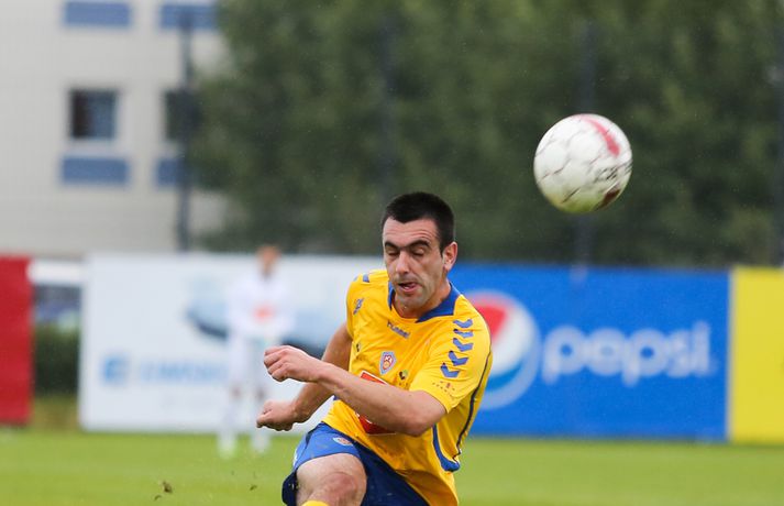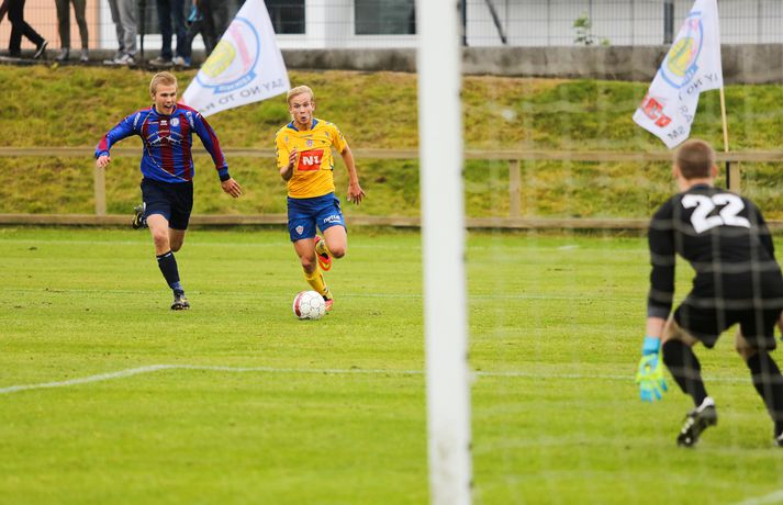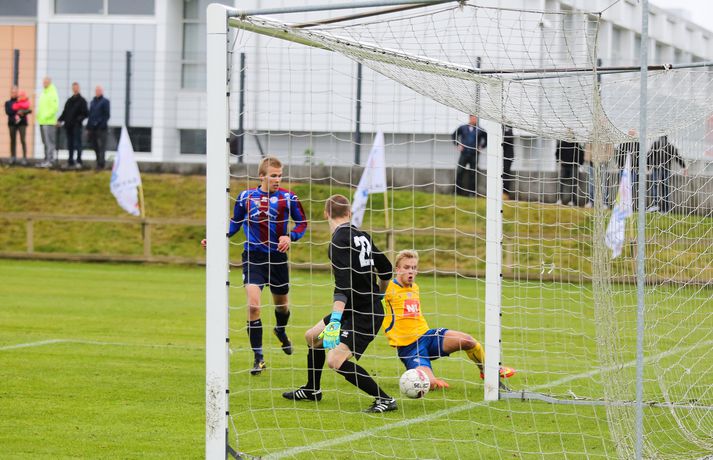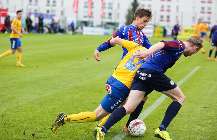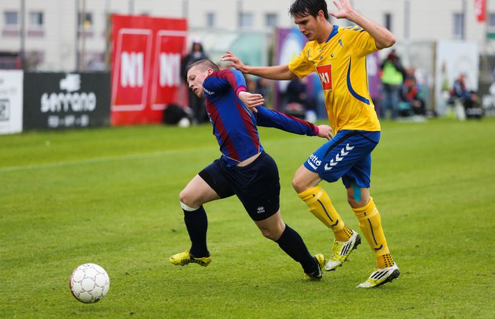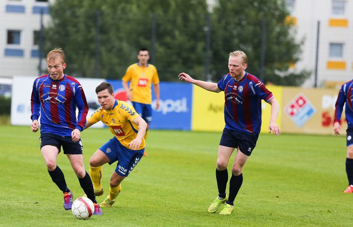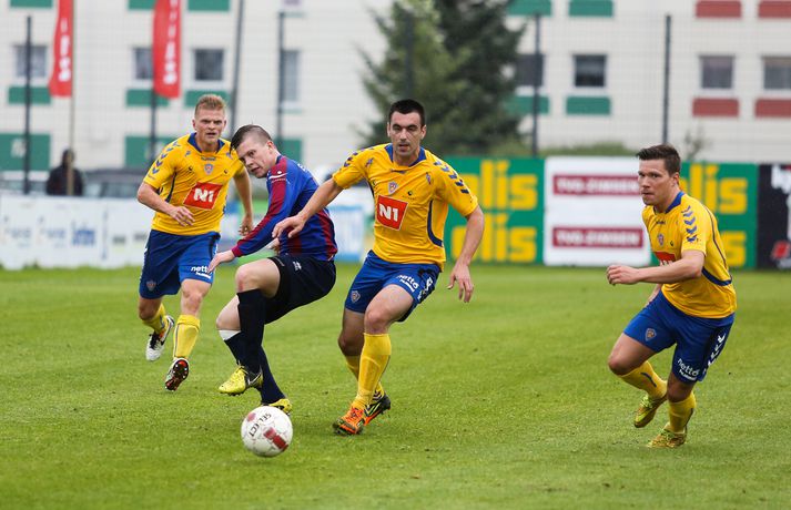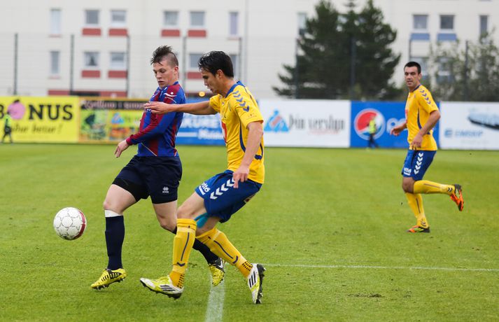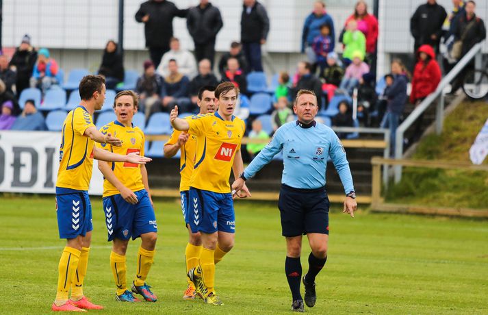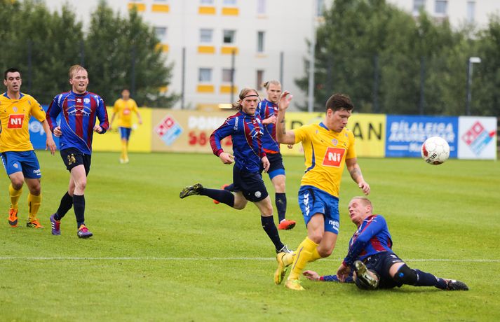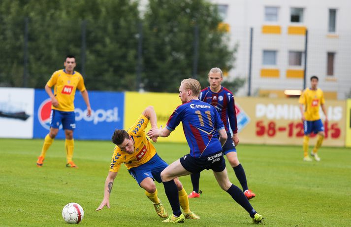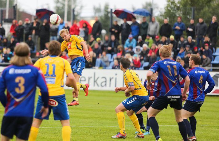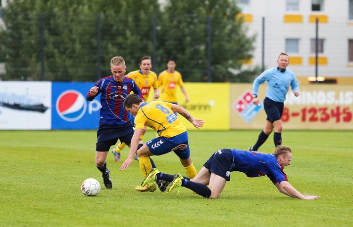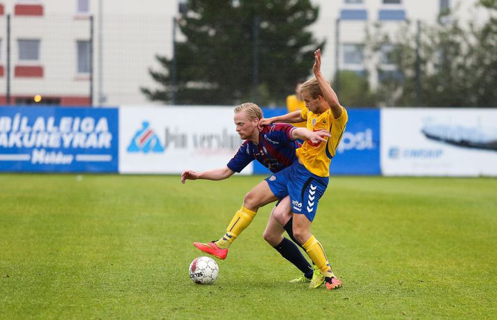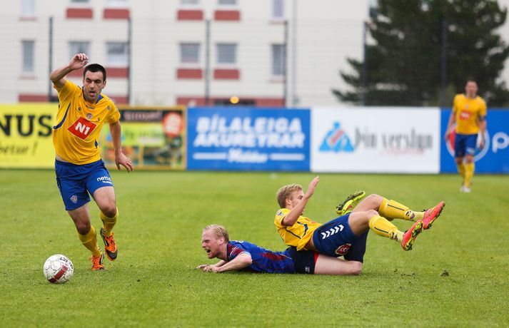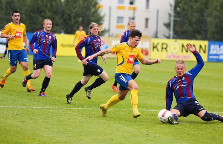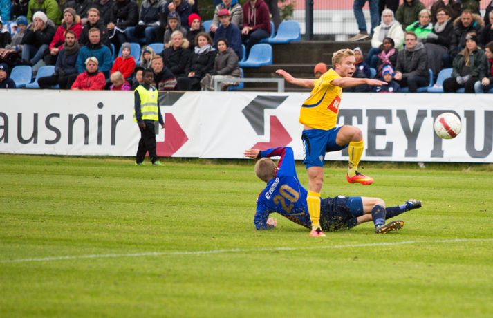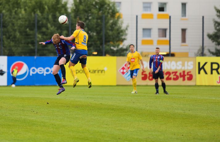 Leiknismenn nálgast Pepsi-deildina | Myndir Kristinn Páll Teitsson skrifar 15. ágúst 2014 20:06 Úr leik Leiknis og KA. Vísir/Arnþór Leiknir vann enn einn sigurinn í 2-1 seiglusigri á KA í 1. deildinni í kvöld. Leiknir er með 11 stiga forskot á HK í þriðja sætinu þegar sex leikir eru eftir. Heimamenn fengu sannkallaða draumabyrjun þegar Hilmar Árni Halldórsson kom Leikni 1-0 yfir eftir átta mínútna leik og bætti Sindri Björnsson við öðru marki um miðbik seinni hálfleiks. Arsenij Buinickij minnkaði muninn fyrir KA í upphafi seinni hálfleiks en lengra komust gestirnir ekki og unnu Leiknismenn því góðan sigur. Pepsi Max-deild karla Mest lesið Sakaður um svindl á HM í pílukasti Sport Dómarinn hlýtur mikið lof fyrir stundarbræði í garð Jake Paul og Joshua Sport Pílukastarinn biðst afsökunar á að hafa fallið á lyfjaprófinu og öllum lygunum Sport Arnór Ingvi orðinn leikmaður KR Íslenski boltinn Tvenna frá Rogers tryggði Villa sigur gegn Manchester United Enski boltinn Ótrúleg tíðindi á HM í pílukasti: „Mikið sjokk“ Sport Albert skoraði í fyrsta sigri Fiorentina Fótbolti Haaland gaf barnabarni Hareide gjöf Enski boltinn Tvær títanplötur settar í Jake Paul eftir kjálkabrotið Sport Ronaldo á nærbuxunum lætur Elon Musk efast um sjálfan sig Fótbolti Fleiri fréttir Arnór Ingvi orðinn leikmaður KR Breiðablik kaupir Jónatan frá Norrköping Elías mættur til meistaranna KR sagt vera að landa Arnóri Ingva Hilmar Árni til starfa hjá KR Segir fjórðung í bók Óla ósannan Víkingur í úrslit Bose-bikarsins eftir sigur „Verið heiður að spila í appelsínugulu með frábærum liðsfélögum“ Þekkir Egilshöllina vel og skoraði gegn fyrrum félögum Strákar Heimis Guðjóns fengu slæman skell í fyrsta leik Axel verður áfram hjá Aftureldingu Kveður pabba sinn í Laugardalnum og fer til FH „Félag sem var í basli með að ná endum saman og greiða laun á réttum tíma“ Skrýtið og taktlaust: „Ég er ekkert sátt með niðurstöðuna“ Fanndís kveður sviðið: „Ég er búin að fella nokkur tár“ Gylfi með tvö og Víkingar byrja á sigri Frá Akureyri til Danmerkur Markadrottningin heldur að landsliðið sé búið spil Strákarnir í 2. flokki Vals þeir einu sem ekki spila fyrir áramót Dæturnar vildu norður: „Mun alltaf gera allt fyrir þær“ Stjarnan sækir markvörð í 3. deildina „Ég var orðinn algjörlega bugaður“ Jónatan áfram á Hlíðarenda: „Var alltaf jákvæður fyrir því að framlengja“ Óli Jó kallar ráðninguna á Jóa Kalla algjört bull „Ég elska þig Ísland, takk fyrir allt!“ Sextán ára með fernu fyrir meistara Víkings Valur dregur sig úr Bose-bikarnum „Sagði bara við hann: Djöfulsins fíflið þitt“ Yngir upp í allt of gamalli deild Þróttur keypti Adam Árna frá Grindavík Sjá meira