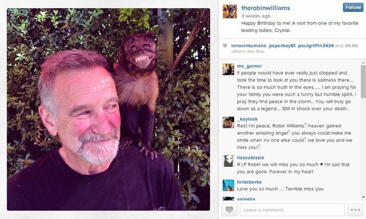 Leikarinn Robin Williams, sem lést í gær, skilur eftir sig ótalmargar og eftirminnilegar kvikmyndir, þar sem hann bæði sinnti aðal- og aukahlutverkum af mikilli snilld. En hann skilur þar að auki eftir sig persónulegri hluta á Instagram síðu sinni. Þar deildi hann hjartnæmum kveðjum til barna sinna, minnist gamalla hlutverka og grínast eins og honum einum var lagið. Undir myndunum má sjá athugasemdir frá aðdáendum leikarans. Margir hverjir segjast í sjokki yfir fregnunum og minnast hans með þakklæti. Hér að neðan má sjá samansafn af nokkrum skemmtilegum færslum Williams í gegnum tíðina: Á afmælisdaginn sinn setti hann inn þessa mynd af sér ásamt apanum Crystal og skrifaði: Til hamingju með afmælið ég! Fékk heimsókn frá einni af mínum uppáhalds aðalleikkonum, Crystal. Williams studdi alltaf góðan búning. Hér sýndi hann stuðning sinn við landslið Bandaríkjanna í sumar með mynd af sjálfum sér í búning í myndinni Night at the museum við hlið myndar af lukkudýri liðsins Teddy Goalsevelt. Dýravinurinn heimsótti dýragarðinn í San Fransisco og fékk að gefa nafna sínum sem er api nart úr boxi. Robin setti inn mynd áður en síðasti þáttur The Crazy Ones fór í loftið til að minna aðdáendur sína á að horfa. Þar sést hann með mikilli vinkonu sinni Söruh Michelle Gellar. Fyrir fjórum mánuðum setti leikarinn inn þessa svarthvítu mynd af sér og syni sínum til þess að óska honum til hamingju með afmælið. Fleiri myndir má nálgast á Instagram síðu leikarans.