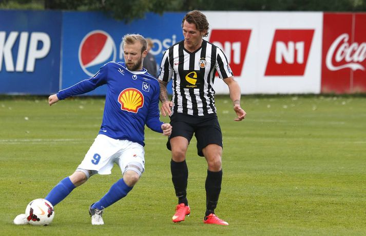 Stjarnan vann magnaðan sigur, 3-2, á KR-ingum í Vesturbænum í kvöld. Ólafur Karl Finsen gerði tvö mörk fyrir Stjörnuna í kvöld sem heldur áfram í Íslandsmeistaravonirnar. KR-ingar voru mikið mun betri til að byrja með og sóttu án afláts. Stjörnumenn voru hreinlega enn í Mílanó og ekki mættir til leiks. Heimamenn komust yfir í leik þegar tæplega tuttugu mínútur voru liðnar af leiknum þegar Aron Bjarki Jósepsson skoraði. Aron fékk boltann í lappirnar eftir hornspyrnu og mikið klafs en hann snéri sér við og stýrði boltanum af stuttu færi í netið. Virkilega vel gert. Eftir markið virtust Stjörnumenn vakna til lífsins. Þeir sóttu mikið næstu mínútur og fengu fjölmörg færi en náðu ekki að koma boltanum í netið fyrir hálfleik. Staðan var 1-0 í hálfleik. Stjörnumenn voru fínir til að byrja með í síðari hálfleiknum og ætluðu sér greinilega að jafna strax metin. Stjörnumenn voru ekki lengi að jafna leikinn en Veigar Páll skallaði boltann í netið eftir fimmtán mínútur í síðari hálfleiknum. Þá fékk hann frábæra sendingu úr aukaspyrnu frá Pablo Punyed og stýrði honum laglega í netið. Ólafur Karl Finsen skoraði síðan annað mark Stjörnumanna þegar tuttugu mínútur voru eftir af leiknum. Garðbæingar koma alltaf til baka eins og þeir hafa sýnt í allt sumar. Þeir bláu komnir yfir. Stjörnumenn ætluðu sér greinilega að vinna leikinn. Heimamenn voru aftur á móti ekki búnar að syngja sitt síðasta og Óskar Örn Hauksson náði að jafna metin þegar korter var eftir af leiknum. Óskar lék á hvern leikmann Stjörnunnar á fætur öðrum og þrumaði boltanum í markið með hægri fæti. Spennandi lokamínútur framundan. Sigurmark beggja liða lág í loftinu og það kom. Ólafur Karl Finsen skoraði magnað mark þremur mínútum fyrir leikslok en Stjörnumenn unnu boltann á miðjum vellinum og voru allt í einu komnir tveir gegn Stefáni í markinu. Toft lagði boltann á hárréttum tíma á Ólaf sem renndi honum í autt markið. Stjarnan vann að lokum ótrúlega mikilvægan sigur en liðið er sem fyrr í öðru sæti deildarinnar með 39 stig, aðeins tveimur stigum á eftir FH sem er í efsta sætinu. Rúnar: Kjartan fer líklega til Danmerkur á morgun„Þetta er nánast farið frá okkur núna, við eigum kannski einhverja stærðfræðilega möguleika,“ segir Rúnar Kristinsson, þjálfari KR, eftir tapið í kvöld. KR-ingar eiga litla sem enga möguleika á því að verja Íslandsmeistaratitilinn í ár. „Við vorum frábærir í fyrstu tuttugu og fimm mínútur leiksins og hefðum raun þá átt að gera fleiri mörk. Stjarnan er með gott lið og því komu þeir sterkir til baka.“ Rúnar segir að Stjörnumenn hafi gert þeim erfitt fyrir með því að pressa KR-ingana hátt. „Mér fannst reyndar bara eitt lið á vellinum eftir að við jöfnuðum leikinn en þá gerum við skelfileg mistök sem kostuðu okkur leikinn.“ Fjallað hefur verið um það í fjölmiðlum í dag að Kjartan Henry Finnbogason, leikmaður KR, sé á förum frá félaginu og þetta hafi jafnvel verið hans síðasti leikur í bili. „Það er mjög líklegt að það gerist á morgun að hann fari til Danmerkur. Það er ekki búið að ganga frá neinu og því ætla ég ekki að tjá mig meira um það,“ segir Rúnar. Kjartan Henry gaf ekki kost á viðtölum eftir leikinn en hann ku vera á leiðinni til danska B-deildarliðsins Horsens. Rúnar Páll: Vorum miklu betri allan leikinn„Þetta var bara flottur fótboltaleikur og mér fannst við vera miklu betri en KR-ingarnir allan leikinn,“ segir Rúnar Páll Sigmundsson, þjálfari Stjörnunnar, eftir leikinn. „Eftir að KR skoraði fyrsta markið í leiknum, þá fannst mér þeir aldrei sjá til sólar.“ Stjarnan tapaði gegn Inter ytra á fimmtudagskvöldið, 6-0, og féll því úr leik í undankeppni Evrópudeildarinnar. „Við megum ekki gleyma því að þetta Inter-ævintýri hefur hjálpað okkur mikið. Að spila á móti Inter Milan á þeirra heimavelli var frábært fyrir okkur alla, þrátt fyrir að hafa tapað 6-0.“ Rúnar segir að liðið eigi heldur betur séns á Íslandsmeistaratitlinum. „Við þurfum bara að vera fókuseraðir á þessi verkefni sem framundan eru, það eru fullt af erfiðum leikjum.“ Ólafur Karl: Flottasta mark sem ég hef skorað„Það var gaman að vinna og þetta var skemmtilegur fótboltaleikur á leiðinlegum sunnudegi,“ segir Ólafur Karl Finsen, leikmaður Stjörnunnar, eftir leikinn. Ólafur gerði tvö mörk fyrir Stjörnuna í kvöld. „Við byrjuðum eins og við værum að bíða eftir því að fá einhvern skell á okkur en eftir það förum við í gang.“ Ólafur segir að Inter-ævintýrið hafi bara verið ógeðslega skemmtilegt. „Þessi Inter-leikur gaf okkur bara meiri orku en einhverja þreytu. Það eina sem við horfum á núna er Íslandsmeistaratitill.“ Ólafur gerði sigurmark leiksins þegar þrjár mínútur voru eftir af venjulegum leiktíma. „Þetta var bara flottasta mark sem ég hef skorað,“ sagði Ólafur og var greinilega að grínast. „Eftir því sem markið er ljótara, því meira fagnar maður.“