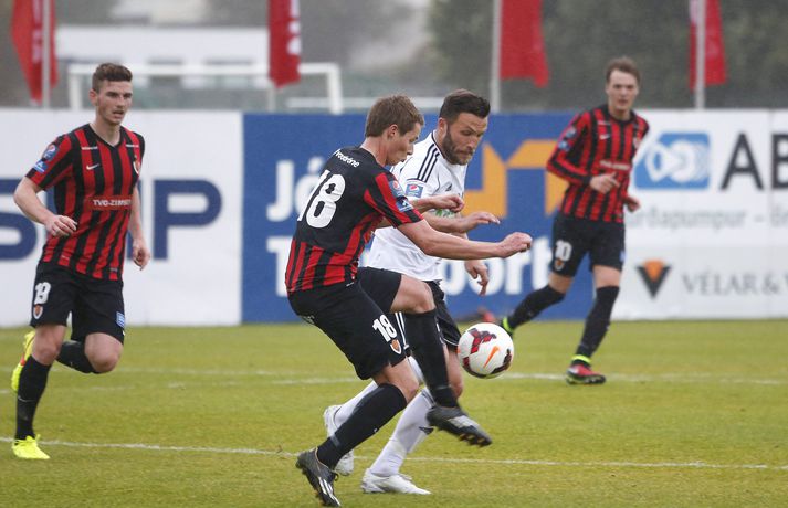 FH tyllti sér á topp Pepsí deildar karla í fótbolta á nýjan leik í kvöld þegar liðið lagði Víking 3-2 á útivelli. Staðan í hálfleik var 0-0.Stefán Karlsson, ljósmyndari Vísis og Fréttablaðsins, var á leiknum í kvöld og náði þessum myndum sem sjá má hér fyrir ofan. Fyrri hálfleikur var tíðindalítill í kvöld þó FH hafi verið mikið meira með boltann og leikurinn fór nánast eingöngu fram á vallarhelmingi heimamanna. Það kom því eins og þruma úr heiðskíru lofti þegar Michael Abnett kom Víkingi yfir strax á fjórðu mínútu seinni hálfleiks. FH kann ekki vel við að vera undir jafnaði strax í fyrstu sókn eftir markið en mun meira jafnræði var með liðunum í seinni hálfleik og munaði mikið um að Aron Elís Þrándarson kom inn á í hálfleik en hann var settur á bekkinn fyrir leik. Þegar tæpur hálftími var eftir af leiknum skipti Heimir Guðjónsson Atla Guðnasyni inn á og í kjölfarið náði FH yfirhöndinni í leiknum á ný og ekki hjálpaði það Víkingum að varamaðurinn Ventseslav Ivanov fékk rautt spjald 17 mínútum eftir að hann kom inn á. FH lagði allt í sóknarleikinn vitandi það að Stjarnan missteig sig í gær. Stórsóknin skilaði FH tveimur mörkum á lokamínútunum en Atli Viðar Björnsson kom FH yfir skömmu eftir að hann kom inn á sem varamaður. Það er gríðarlegur styrkur fyrir FH að geta skipt eins öflugum vararmönnum inn á og raun ber vitni. Með þessa breidd er erfitt að sjá liðið misstíga sig á lokasprettinum þó enginn geti afskrifað Stjörnuna eða KR sem lúrir rétt fyrir aftan. Víkingur náði að malda í móinn í uppbótartíma en skaðinn var skeður og úrslitin ráðin. FH er komið með tveggja stiga forystu á toppi deildarinnar en Víkingur er sem fyrr í fjórða sæti en liðið hefur aðeins náð í eitt stig í þremur síðustu leikjum sínum og hefur kvatt toppbaráttuna. Davíð Þór: Alltaf líklegir til að skora með Atla Viðar á vellinum„Við sköpuðum okkur ekki nóg í fyrri hálfleik og vorum aðeins of hægir en svo fáum við þetta mark í andlitið en að sama skapi jöfnuðum við mínútu seinna. Við lentum ekkert í það miklum vandræðum,“ sagði Davíð Þór Viðarsson miðjumaður FH. „Við vorum einum fleiri og pressuðum þvílíkt á þá og auðvitað fer aðeins um mann þegar maður sækir og sækir og sækir og það kemur ekki nógu mikið út úr því en þegar maður er með Atli Viðar Björnsson inni á vellinum þá er maður alltaf líklegur til að skora. „Þeir gáfu okkur eitt mark og við gáfum þeim eitt mark, það var 1-1 í því,“ sagði Davíð og átti við tvö síðustu mörk leiksins. „Það var kæruleysi hjá okkur í lokin en það skiptir ekki öllu, við unnum þennan leik. Við vorum búnir að vera duglegir að halda boltanum og þeir komust ekki neitt. Þá gerðumst við sekir um smá kæruleysi en mér er alveg sama. „Við komumst aftur á toppinn og erum í flottum málum. Við ætlum okkur að vinna þetta mót og Stjarnan tapar ekki mörgum stigum og við þurfum að vinna okkar leiki. Við stefnum að því að vinna alla leiki fram að síðasta leiknum gegn Stjörnunni í október og þá sér maður hvort það verði úrslitaleikur,“ sagði Davíð. Ólafur Þórðarson: Dómarinn hafði ekki kjark í að dæma á FH„Ég er ósáttur við aulaskap minna leikmanna að hafa gefið þennan leik frá sér í dag,“ sagði Ólafur Þórðarson þjálfari Víkings. „Mér fannst fyrsta markið ekki vera gegn gangi leiksins. Við vörðumst vel og þeir voru ekki að skapa neitt. Þeir fengu ekkert fleiri færi en við og svo skorum við fínt mark úr fyrsta færinu okkar. „Ef við byrjum á byrjuninni þá er stærsta atvikið í leiknum þegar dómarinn sleppir því að reka Jón Ragnar (Jónsson) útaf í fyrri hálfleik. Hann hafði ekki kjark í að dæma á FH eins og hann átti að gera í kvöld. „Hann var síðasti maður og Viktor (Jónsson) er sloppinn í gegn. Ef hann flautar þá er það rautt spjald,“ sagði Ólafur sem var ekki heldur sáttur við rauða spjaldið sem Ivanov fékk. „Ég sé ekki nógu vel hvort Ivanov sé með olnbogann uppi. Mér fannst hann fara upp í þetta til að skalla boltann og það tók dómarann langan tíma að ákveða hvað hann ætti að gera þarna og hann lét FH tala þetta spjald á hann.“ Ólafur var ekki heldur sáttur við fyrra spjaldið sem Ivanov fékk en þar var hann ekki síður ósáttur við leikmanninn sem fékk spjaldið fyrir dýfu. „Hann fór niður, það er klárt. Hann gat staðið og fengið markmanninn á sig. Það átti hann að gera. Markmaðurinn fór í hann, það er engin spurning og fyrir mér er það brot.“ Aron Elís Þrándarson byrjaði á bekknum í dag en innkoma hans í upphafi seinni hálfleiks breytti leiknum fyrir Víking. „Hann hefur ekki verið að standa sig nógu vel að undanförnu. Það er þannig að ungir strákar spila upp og niður og hann er ungur og á langt í land ennþá. Það var ekki verið að refsa honum. Maður velur það lið sem maður treystir best hverju sinni. Það var vitað að Aron myndi koma inn í leiknum. Hann stóð sig nokkuð vel eftir að hann kom inn á,“ sagði Ólafur að lokum.Vísir/Stefán