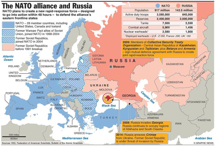 Verkefni leiðtoga NATO, þegar þeir koma saman í Wales á morgun, verður að vernda mikilvæga meðlimi bandalagsins í Austur-Evrópu gegn Rússum. Án þess þó að ergja Rússa um of. NATO hefur reynt að fá Rússland til að ganga í bandalagið í tvo áratugi, en nú virðist sem samband NATO og Rússlands hafi ekki verið verra frá tímum Kalda stríðsins. Fjallað er um samskipti NATO og Rússlands í grein sem AP fréttaveitan birti í morgun. NATO tilkynnti á mánudaginn að til stæði að stofna herdeild sem ætlað væri að bregðast við ógnum í Austur-Evrópu á 48 klukkutímum. Að safna ætti birgðum, eins og eldsneyti og skotfærum í löndum eins og Póllandi, en Pólverjar hafa lengi beðið um aukna vernd NATO. Háttsettur meðlimur rússneska hersins tilkynnti svo í gær að Rússland myndi endurskoða viðbragðsáætlanir sínar með tilliti til „breyttra hernaðarógna“. Vesturveldin hafa nú í nokkra mánuði sakað Rússa um að styðja við bakið á aðskilnaðarsinnum í Austur-Úkraínu, eftir að Rússlandi hernam og innlimaði Krímskaga. Þrátt fyrir neitanir yfirvalda í Moskvu telur NATO að minnst þúsund rússneskir hermenn taki beinan þátt í átökunum í Úkraíniu og að þeir hafi hjálpað aðskilnaðarsinnum við að snúa taflinu við gegn stjórnarhernum. Æðsti herforingi NATO í Evrópu sagði í viðtali við þýskt dagblað í síðasta mánuði að ef Rússland myndi beita svipuðum aðferðum í aðildarríki NATO, og nefndi hann Lettland sem dæmi þar sem um 27 prósent íbúa telja sig vera Rússa. Þá væru litið á það sem árás á öll aðildarríki bandalagsins samkvæmt fimmtu grein stofnsamnings NATO frá 1949. Þannig séu Bandaríkin til dæmis skuldbundin til að vernda Riga, alveg eins og Berlín.Hér má sjá samanburð á hernaðargetu NATO og Rússlands.Vísir/Graphic NewsTelja vörn NATO ekki nægjanlega Þá bendir AP á skýrslu sem varnarmálanefnd neðri deildar breska þingsins birti í júlí. Þar segir að NATO sé sérstaklega óundirbúið fyrir þeirri nýju tegund hernaðar sem Rússar hafa breytt í Úkraínu. Þar sem ýtt sé undir óöld innan annarra landa. Með áróðri, samfélagsmiðlum og notkun hermanna í dulargervi eða án nokkurra merkinga. Háttsettur embættismaður innan NATO sagði AP að viðbrögð gegn álíka aðgerðum Rússa og þeir hafi beitt í Úkraínu, sé meðal þess sem rætt verði í Wales á morgun. Þrátt fyrir að leiðtogar bandalagsins hafi undanfarið lofað meðlimum í Austur-Evrópu aukinni vernd, segir AP að þeir vilji ekki skaprauna Vladimir Putin og hershöfðingjum Rússlands. Líkurnar á því að þessar þjóðir fái þá vernd sem þeir hafa beðið um eru ekki miklar. Viðmælandi AP, Jorge Benitez sem er sérfræðingur í málefnum NATO, segir að ekki muni koma til þess aftur að vesturveldin staðsetji hundruði þúsundir hermanna og skriðdreka í löndunum eins og gert var í Vestur-Þýskalandi á tímum Kalda stríðsins. Þó stæði til að fjölga heræfingum í löndunum, en NAO meðlimum í Austur-Evrópu þætti það ekki nóg.