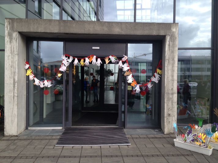 Samstöðufundur yfirtók húsakynni Ríkissáttasemjara Stefán Ó. Jónsson skrifar 1. september 2014 10:07 Á annað hundrað manns eru nú staddir í húsakynnum Ríkissáttasemjara þar sem fram fer samstöðufundur með samninganefnd Félags stjórnenda leikskóla (FSL). Samningafundur FSL og samninganefndar sveitarfélaga hófst í húsinu nú klukkan 10 en viðræður síðustu vikna hafa gengið hægt og er fundurinn sá sjöundi í röðinni undir stjórn ríkissáttasemjara. „Ljóst er að félagsmenn FSL hafa áhyggjur af stöðunni og að langlundargeð þeirra er á þrotum,“ segir í tilkynningu frá Kennarasambandinu. Því hafi margir ákveðið að nýta kaffihlé sitt til að sýna samninganefnd félagsins samstöðu með því að mæta fyrir framan húsnæði Ríkissáttasemjara nú klukkan 09:45 í morgun.Ingibjörg Kristleifsdóttir, formaður FLS, hélt smá tölu að þessu tilefni þar sem hún þakkaði fólki fyrir komuna og fyrir stuðninginn. Hér að ofan má sjá þegar fundarmenn gengu inn í húsnæði embættisins og kyrjuðu hvort ekki væri kominn tími til að semja.Inngangurinn að Borgartúni 21 var skreyttur með merkjum fundarins.Mynd/Elísabet Mest lesið Segir Kúbu brátt munu falla Erlent Alvöru inniveður um helgina Innlent Þurfi ekki að óttast bílnúmeralesara við Sorpu Innlent Vatnselgur undir brúnni í Ártúnsbrekku Innlent Listamönnum fækkar ört Innlent Alvarlegt umferðarslys við Munaðarnes Innlent Kristinn hafði betur gegn Alexöndru og verður oddviti Pírata Innlent Hvalfjarðargöng lokuð Innlent Gefst upp og flytur eftir sjö ára mótmæli Innlent Truflanir víða vegna eldingaveðurs Innlent Fleiri fréttir Þurfi ekki að óttast bílnúmeralesara við Sorpu Listamönnum fækkar ört Alvöru inniveður um helgina Kristinn hafði betur gegn Alexöndru og verður oddviti Pírata Selfosskirkja 70 ára og kirkjukórinn 80 ára Kjartan og Marta til liðs við Miðflokkinn Útiloka að þjóðaratkvæðagreiðslan fái hraða afgreiðslu Rætt við stjórnarandstöðuna um atkvæðagreiðslu um ESB Truflanir víða vegna eldingaveðurs Hvalfjarðargöng lokuð Vatnselgur undir brúnni í Ártúnsbrekku Ríkisstjórnin feli aðgerðaleysi á bak við atkvæðagreiðsluna Enn frekari dráttur á máli Margrétar „Verið að vaða áfram með æðibunugangi“ Rafmagnslaust vegna eldingar Jakob Bjarnar, Kjartan og Sunna tilnefnd til blaðamannaverðlauna Bráðabirgðaráðstafnir í Reynisfjöru: Nýr útsýnispallur rís í vor Mál Margrétar flutt á ný vegna dráttar Bjarki lætur staðar numið í Dalabyggð Ísland sé í sterkari stöðu en áður fyrir aðildarviðræður Alvarlegt umferðarslys við Munaðarnes Bein útsending: Staða loftlagsrannsókna á Íslandi Þjóðaratkvæðagreiðslan fer fram 29. ágúst Kynna þjóðaratkvæði um framhald viðræðna Bein útsending: Kynna tillögu um þjóðaratkvæðagreiðslu Methiti í hafinu við Ísland vísbending um stærri breytingar Kynna tillöguna um þjóðaratkvæðagreiðsluna klukkan 11:30 „Brýn nauðsyn“ geti kallað á rof þagnarskyldu heilbrigðisstarfsfólks Bein útsending: Staða mæðra á vinnumarkaði Síminn búinn að glamra í fjóra áratugi Sjá meira