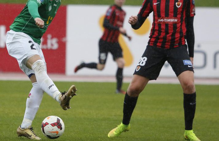 Umfjöllun, viðtöl, einkunnir og myndir: Breiðablik - Víkingur 4-1 | Blikar í stuði gegn Víkingum Kolbeinn Tumi Daðason á Kópavogsvelli skrifar 21. september 2014 00:01 Vísir/Valli Árni Vilhjálmsson skoraði þrennu þegar Blikar skelltu vængbrotnum Víkingum í rigningu og roki á Kópavogsvelli í 20. umferð Pepsi-deildar karla. Blikar voru mun sterkari aðilinn frá upphafi til enda og verðskulduðu sigurinn. Strax í upphafi leiks var ljóst í hvað stefndi. Blikar sóttu af krafti undan vindi og eftir tuttugu mínútur hafði Árni Vilhjálmsson komið heimamönnum í 2-0. Fyrra markið var af glæsilegri gerðinni, negla upp í þaknetið einn gegn Ingvari Kale, en hið síðara af stuttu færi eftir góðan undirbúning Ellerts Hreinssonar. Blikar réðu gangi leiksins fullkomlega og Víkingar, sem léku án þriggja lykilmanna, áttu engin svör. Skotinn Henry Monaghan fékk að líta rauða spjaldið undir lok fyrri hálfleiks fyrir háskalega tæklingu og þar með var leiknum svo gott sem lokið. Blikar hefðu getað leitt með fimm mörkum í hálfleik en forystan aðeins tvö mörk er gengið var til búningsherbergja. Síðari hálfleikurinn var jafnari þótt Víkingar væru manni færri. Ekkert benti þó til annars en öruggs sigurs Blika þegar brotið var á Viktori Erni Jónssyni innan teigs. Ívar Örn Jónsson skoraði af öryggi úr spyrnunni og gaf gestunum von. Glæsimark Árna slökkti þær vonir á 82. mínútu með frábæru vinstri fótarskoti áður en Ellert Hreinsson innsiglaði sigurinn. Blikar léku mögulega sinn besta leik í sumar og hljóta að svekkja sig á því hvar þessi spilamennska hefur verið til þessa. Jafntefliskóngarnir voru í frábærum gír og hefðu getað skorað mun fleiri mörk. Víkingar eru áfram í bílstjórasætinu hvað Evrópusæti varðar. Nú er hins vegar forystan á Valsmenn í 5. sæti aðeins tvö stig eftir sigur Hlíðarendapilta á Þór. Blikar eru úr fallhættu eftir sigurinn í dag. Framarar gætu náð þeim að stigum en 17 markamunur gerir það að verkum að Blikar verða í efstu deild að ári svo framarlega sem svín taki ekki upp á því að fljúga. Gummi Ben: Skrautlegar tæklingar fylgja haustinuGuðmudur Benediktsson.Vísir/Stefán„Við byrjuðum af gríðarlegum krafti og gerðum út um leikinn í fyrri hálfleik með frábærri spilamennsku á köflum. Við erum hæstánægðir,“ sagði Guðmundur Benediktsson, kampakátur þjálfari Blika, í leikslok. Hann vildi ekki viðurkenna að farið hefði um sig þegar Víkingar minnkuðu muninn í eitt mark stundarfjórðungi fyrir leikslok. Blikar hafa sett Íslandsmet í jafnteflum í sumar og örugglega einhverjir sem áttu von á að hið sama yrði uppi á teningnum. „Nei, ég hafði gríðarlega góða tilfinningu. Fannst við reyndar á tímabili í síðari hálfleik flækja hlutina. Einfaldleikinn er bestur og við gerðum hið einfalda mjög vel í fyrri hálfleik. Það er mannlegt eðli að reyna að gera erfiðari hluti og flækja hlutina tveimur mörkum yfir og manni fleiri.“ Hans menn hefði vaknað við að fá á sig markið og var Guðmundur ánægður hvernig hans menn „stigu á bensíngjöfina“ og kláruðu leikinn. Aðspurður um rauða spjaldið sem Henry Monaghan, leikmaður Víkings, fékk undir lok fyrri hálfleiks sagði Guðmundur: „Hann fór í tæklingu á mínum manni og dómarinn virðist hafa metið það þannig að hann hafi farið með takkana á undan. Þetta gerist nokkrum sinnum þegar fer að hausta. Ekkert auðvelt að dæma í þeim aðstæðum.“ Óli Þórðar: Blikar voru miklu betri„Það er lítið að segja um frammistöðu okkar. Það er meira að segja um frammistöðu Blika. Þeir voru miklu betri en við og við mættum ekki klárir,“ sagði Ólafur Þórðarson, þjálfari Víkinga. Gestirnir söknuðu Arons Elís Þrándarsonar, Pape Faye og Alan Lowing í dag og var það greinilegt. Þjálfarinn var aðeins með sex varamenn og einn þeirra var Milos Milojevic, aðstoðarþjálfari Víkinga. „Við vissum að við værum með þunnan hóp en engu að síður vill maður sjá þá sem maður stillir upp í byrjunarliðinu leggja meira á sig en þeir gerðu í dag.“ Aðspurður hvort hans menn hefðu ekki verið með hausinn kláran í baráttuna í rigningunni og rokinu sagði Ólafur: „Nei, mér sýndist ekki.“ Henry Monaghan, miðjumaður Víkinga, var rekinn af velli fyrir grófa tæklingu undir lok fyrri hálfleiks. Ólafur var ósáttur við dóminn og taldi Skotann aðeins hafa farið með annan fótinn í tæklinguna. Sá dómur hefði þó litlu skipt í heildarmyndinni. Víkingar hafa tveggja stiga forskot á Val í baráttunni um Evrópusæti þegar tvær umferðir eru eftir. Ólafur viðurkenndi að hann hefði áhyggjur fyrir leikina sem framundan væru. Hann hefði alltaf áhyggjur. Árni Vill: Ég á einn gulllitaðan skó fyrirÁrni Vilhjálmsson.„Ég er sáttur með liðið og sigurinn. Mörkin eru fín líka þar sem maður er framherji,“ sagði Árni Vilhjálmsson, maður leiksins. Árni skoraði þrjú mörk og þakkaði hann meðal annars skónum sem hann klæddist. „Ég verð að gefa Viktori Unnari (Illugasyni) vini mínum það að hann lánaði mér þessa skó. Fyrst með U19 landsliðinu þegar ég setti átta mörk í tíu leikjum og svo dró ég þá fram í sumar fyrir þennan leik og setti þrjú. Þeir gefa mörk þessir skór,“ sagði Árni léttur. Árni er kominn með tíu mörk í sumar og í kapphlaupi við Jonathan Glenn og Gary Martin um markakóngstitilinn. Hann segir það ekki markmið að verða markakóngur og næla sér í gulllitaðan skó. „Alls ekki. Ég var að spila í gulllituðum skóm í dag svo ég á einn svoleiðis. Ég get ekki farið að hugsa út í það. Að vinna leikina er mjög gott. Að skora eitt eða tvö er gaman líka. Ég er sáttur ef ég næ að gera eitthvað fyrir lið