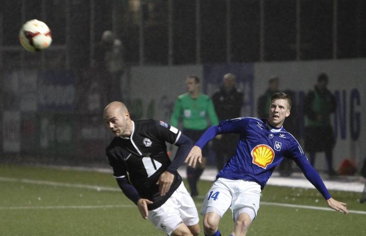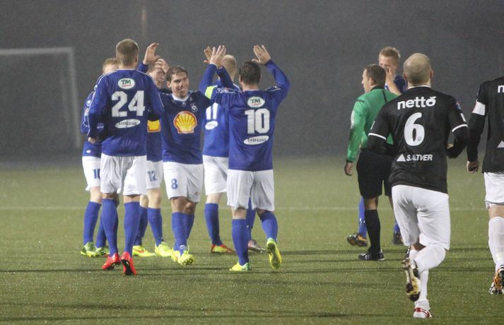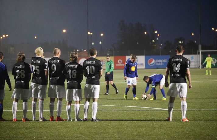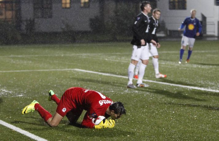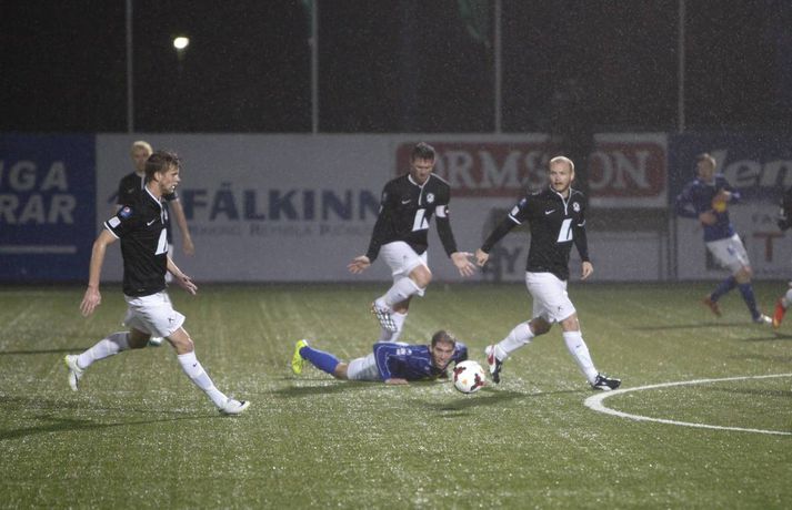 Umfjöllun, viðtöl, einkunnir og myndir: Stjarnan - Keflavík 0-2 | Aukaspyrnumörk í Garðarbæ Anton Ingi Leifsson á Samsung-vellinum skrifar 14. september 2014 00:01 Aukaspyrnumörk Pablo Punyed og Veigar Páls Gunnarsson tryggðu Stjörnunni sigur á Keflavík í kvöld, en leikið var í flóðljósum á Samsung-vellinum. Hræðilegar aðstæður gerðu leikmönnum erfitt fyrir, en ausandi rigning var sem og strekkings vindur. Stjörnumenn voru sterkari og innbyrtu stigin þrjú sem eru gífurlega mikilvæg í baráttunni við FH um Íslandsmeistaratitilinn. Stjarnan byrjaði í 4-4-2, en Rolf Toft og Veigar Páll Gunnarsson voru í fremstu víglínu. Ólafur Karl Finsen sat á bekknum ásamt Niclas Vemmelund, en það kom mest á óvart í liðsskipun dagsins. Heiðar Ægisson stóð sig vel í síðasta leik gegn KR í hægri bakverðinum og hann hélt sæti sínu verðskuldað. Hjá Keflavík var aðeins breytt út á vananum og hent í tígulmiðju. Einar Orri Einarsson var aftastur á miðjunni með þá Sindra Snæ Magnússon og Frans Elvarsson sitthvoru megin við sig. Elías Már Ómarsson spilaði svo í þessari svokölluðu "holu" fyrir aftan framherjana Theodór Guðna Halldórsson og Hörð Sveinsson. Leikurinn var í járnum framan af, en Stjörnumenn áttu ívið betri færi og skoruðu fyrsta markið eftir 25. mínútur. Þeir fengu þá aukapsyrnu rétt fyrir utan teig og þar mætti Pablo Punyed og skrúfaði boltann í netið, keimlíkt markinu sem hann skoraði gegn Þór í uppbótartíma í sumar. Ekki batnaði ástandið þegar Elías Már, besti leikmaður Keflavíkur í sumar þurfti að fara af velli vegna meiðsla, en eftir markið virtust gestirnir færa sig aðeins framar. Þeir sköpuðu sér þó enginn hættuleg færi, fyrr en í uppbótartíma þegar Hörður Sveinsson skallaði boltann í slá.Hörður Árnason var með áætlunarferðir upp vinstri vænginn hjá Stjörnunni og gaf frábærar sendingar fyrir markið sem heimamenn náðu þó ekki að nýta sér. Það voru rennblautir leikmenn sem gengu til búningsherbergja í hálfleik, en veðrið var ansi skrautlegt á Stjörnuvelli í kvöld. Í síðari hálfleik var svipað uppá teningnum. Það var rosalega lítið um opin markfæri og það var erfitt að segja til hvort liðið hafi verð betri aðilinn. Stjörnumenn voru ívið meira með boltann, en voru stálheppnir að Hörður Sveinsson hafi ekki jafnað metin þegar 70 mínútur voru liðnar af leiknum þegar Hörður Sveinsson fékk ákjósanlegt færi eftir ævintýraleg mistök Ingvars í markinu. Varnarmenn Stjörnunnar náðu, sem betur fer fyrir Ingvar, að henda sér fyrir boltann. Á síðustu mínútum leiksins vantaði ekki dramatíkina. Á 89. mínútu gerðu gestirnir tilkalls til vítaspyrnu þegar boltinn virtist fara í hönd Harðars Árnasonar, en ekkert var dæmt. Stjörnumenn geystust í sókn, brotið var á Pablo Punyed rétt fyrir utan teig. Fyrirliðinn Veigar Páll Gunnarsson fékk að taka þessa aukaspyrnu og skoraði eftir hörmuleg mistök Sandqvist í markinu. Lokatölur 2-0 og Stjarnan áfram enn taplaus. Eins og fyrr segir hafa Stjörnumenn oft spilað betur en í kvöld og spilaða veðrið stóra rullu hjá báðum liðum, en það var afar slæmt vægt til orða tekið. Þeir fengu þó stigin þrjú og um það snýst leikurinn; að sækja stigin þrjú og það tókst fullkomlega hjá Stjörnumönnum. Stjarnan minnkaði mun FH aftur í tvö stig eftir að Hafnarfjarðarliðið hafi náð fimm stiga forystu fyrr í dag. Keflvíkingar spiluðu ágætlega í dag, en ekki nægilega vel til að vinna Stjörnuna. Þeir eru enn í bullandi fallbaráttu; með nítján stig í níunda sæti og þremur stigum fyrir ofan fallsæti. Fram og Fjölnir eru í tíunda og ellefta sæti, en þau lið mætast einmitt á Laugardalsvelli á morgun.Kristján Guðmundsson: Mun auðveldara að dæma á okkur „Okkur sýndist það að þetta hafi átt að vera víti. Hann fer ekkert í neinn annan líkamshluta áður en hann fer í höndina á honum og við teljum að þetta hafi átt að vera víti," sagði Kristján Guðmundsson, þjálfari Keflavíkur í leikslok, aðspurður út í atvik undir lok leiksins. Boltinn virtist þá fara í hönd Harðars Árnasonar eftir fyrirgjöf Bojans Stefáns, en Þóroddur Hjaltalín dómari og hans aðstoðarmenn dæmdu ekkert. „Það var mun auðveldara að dæma á okkur og ég var ósáttur með dómgæsluna í dag," og aðspurður hvað hann hafi verið ósáttur með í dómgæslunni svaraði Kristján: „Þeir fengu ódýrar aukaspyrnur sem þeir skora úr og auðveldara að dæma á okkur yfir höfuð. Sending til baka hjá þeim og það var ekki dæmt á það og þeir skora annað markið upp úr því. Það er hægt að týna ýmislegt til." „Frammistaðan var fín. Þetta var jafn leikur og eitt stig var á borðinu ef allir hefðu verið í lagi inná vellinum." „Það var mjög erfitt að ráða vindinn og þegar við eigum þrjú skot í röð inná vítateignum hjá þeim þá sögðu strákarnir að það hafi verið mjög erfitt að hemja boltann," en hvað fannst Kristjáni um rauða spjaldið sem Einar Orri fékk? „Það er svo auðvelt að dæma á Einar, en hann er orðið ákveðið fórnarlamb í þessu öllu saman. Það er afskaplega auðvelt að dæma á hann og gefa honum spjöld, en hann er klaufi í seinna spjaldinu. Ég get ekki kvartað yfir þvi." Hvernig sér Kristján leikina þrjá sem eftir eru? „Stigin koma ef við sýnum frammistöðu eins og hér í dag. Við tókum völdin á miðjunni í síðari hálfleik, en náum ekki að skapa nægilega opin færi. Þessi leikur er dálítið tímabilið í hnotskurn," sagði Kristján við fjölmiðla í leikslok.Rúnar Páll: Heiðar spilaði nánast óaðfinnalega „Þeir voru ekki að skapa neitt, þannig þetta var ekkert stress. Það var smá stress þegar Ingvar var eitthvað 