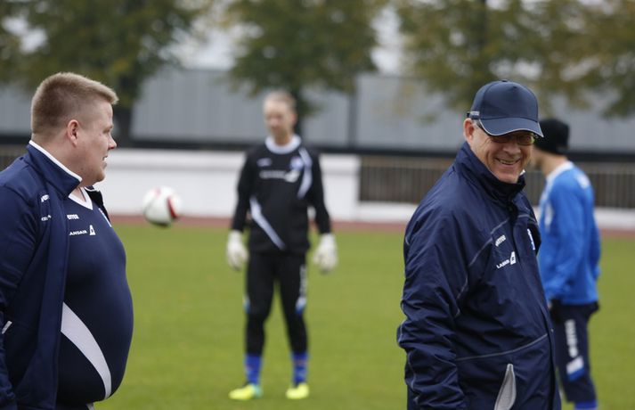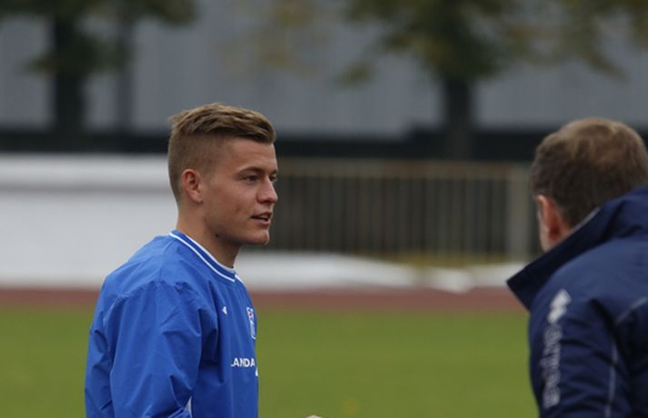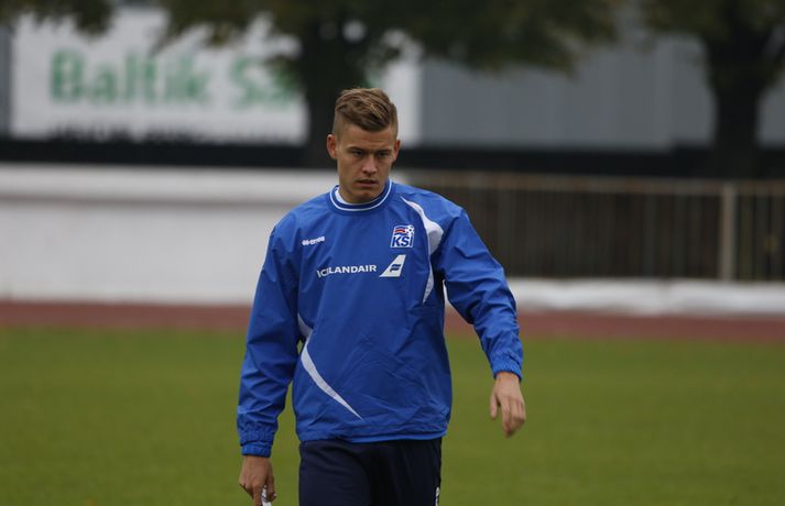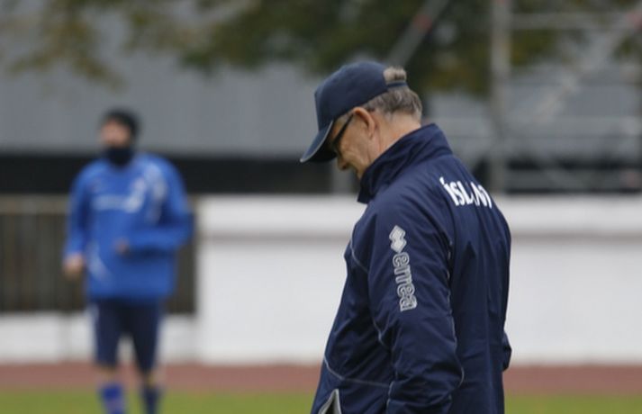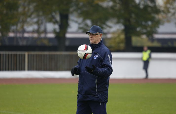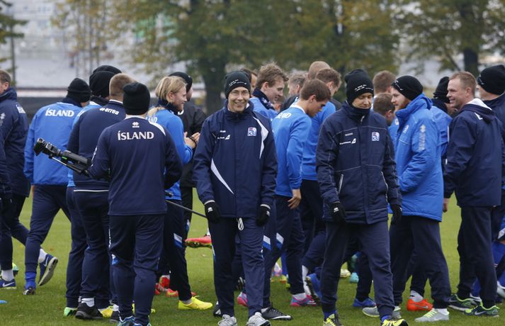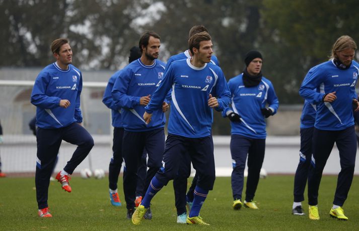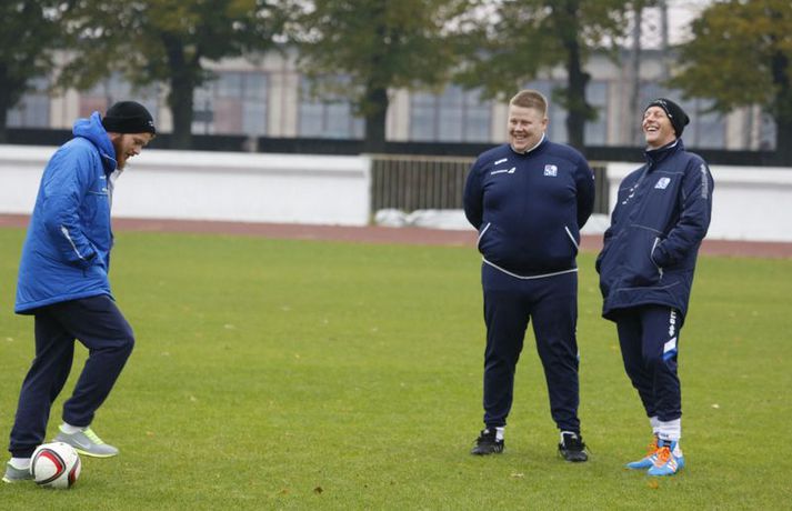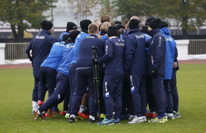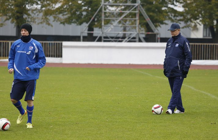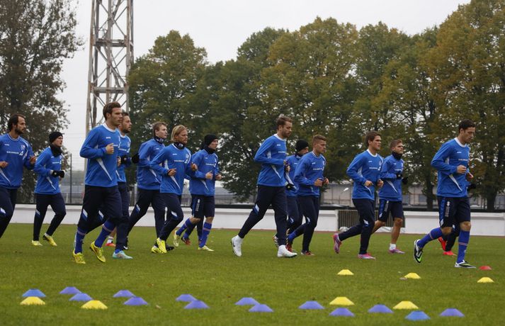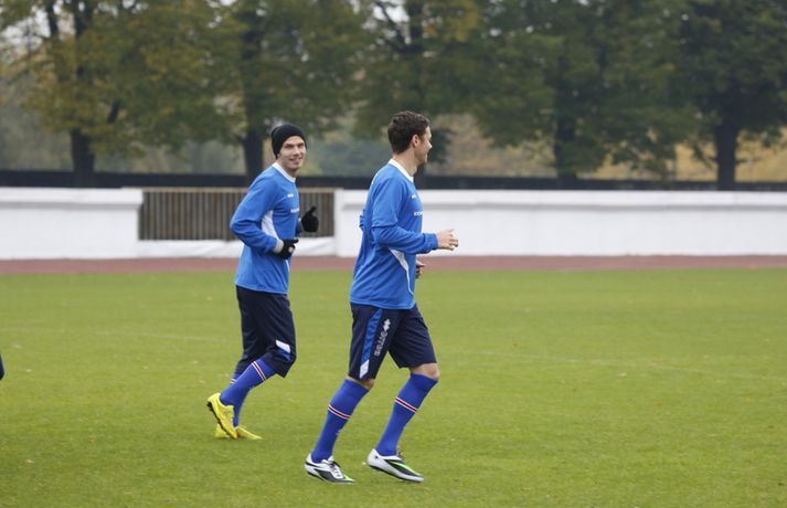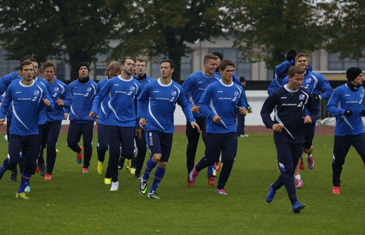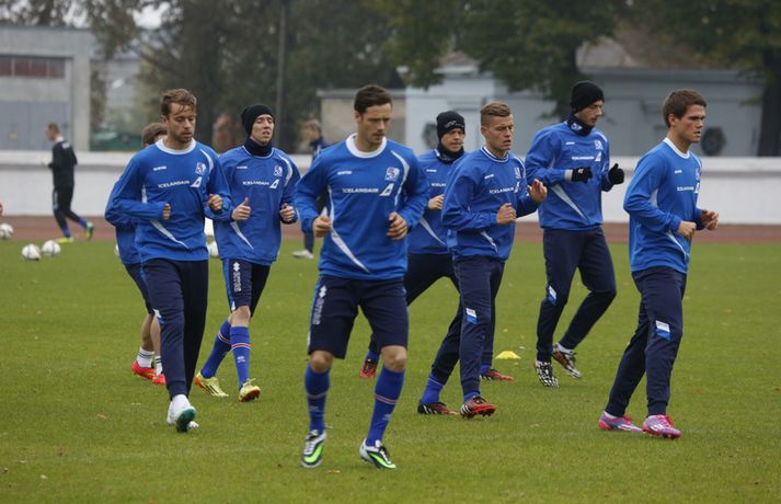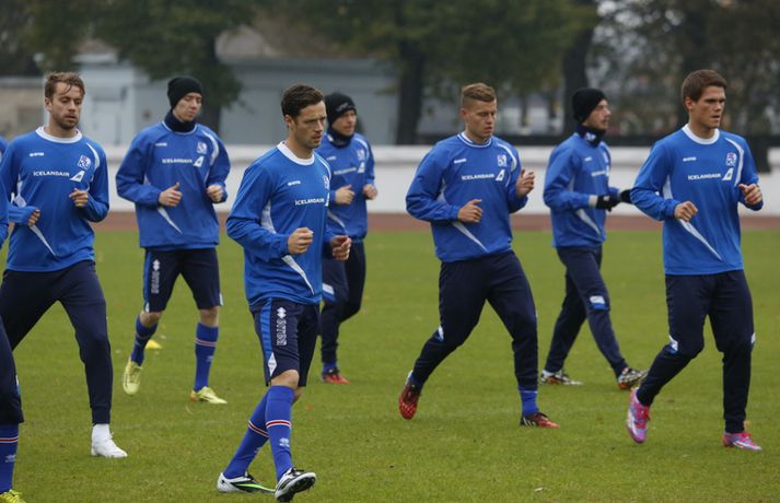 Íslenska landsliðið æfði á Daugava-vellinum nú í hádeginu að staðartíma í Lettlandi. Strákarnir undirbúa sig nú að kappi fyrir leikinn gegn Lettum í Riga annað kvöld en ekki var annað að sjá á köppunum að þeir væru klárir í slaginn. Valgarður Gíslason brá sér á æfinguna og tók meðfylgjandi myndir.Vísir/Valli