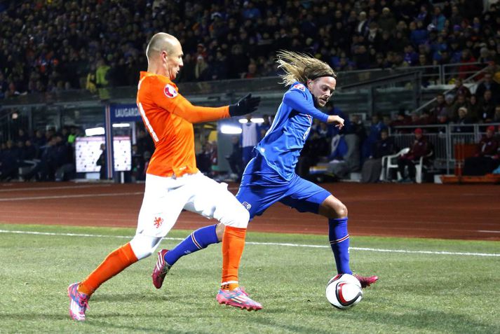 Gekk betur hjá stranga skólakennaranum en vinalega frændanum Ingvi Þór Sæmundsson skrifar 15. október 2014 16:45 Birkir Bjarnason reynir að fara framhjá Arjen Robben í leiknum á mánudaginn. Vísir/Andri Marinó Bart Vlietstra skrifaði athyglisverða grein um hollenska landsliðið sem birtist á vefsíðu the Guardian í gær. Holland tapaði sem frægt er orðið gegn Íslandi á Laugardalsvellinum á mánudagskvöldið, en hollenska liðið hefur tapað þremur af fjórum fyrstu leikjum sínum undir stjórn Guus Hiddink, sem tók landsliðinu af Louis van Gaal eftir HM í sumar. Hiddink gerði samning fram yfir EM 2016, en eftir það tekur Danny Blind, annar af aðstoðarþjálfurum Hollands, við liðinu. Vlietstra segir að þessi tvö ár undir stjórn Hiddinks hefðu átt að vera viðeigandi lokapunktur á ferli hans, eftir erfið ár að undanförnu. „Þetta átti að vera fullkomin leið til að enda ferilinn,“ segir Vlietstra í upphafi greinarinnar. „Síðustu ár hafa verið erfið hjá Hiddink (Rússland komst ekki á HM 2010, Tyrklandi mistókst að tryggja sér sæti á EM 2012 og hlutirnir gengu ekki upp hjá milljarðaliði Anzhi Makhachkala) en þau áttu að falla í gleymskunnar dá, að því gefnu að hann næði góðum árangri með Holland á EM 2016.“ Vlietstra segir að hollenska liðið hafi litið vel út þegar Hiddink tók við því, enda var Holland nýbúið að vinna til bronsverðlauna á HM í Brasilíu, og framtíðin virtist björt. Ungir leikmenn á borð við Daryl Janmaat (Newcastle), Stefan de Vrij (Lazio), Bruno Martins Indi (Porto) og Daley Blind (Manchester United) voru nýgengnir til liðs við stór lið í sterkum deildum og aðrir ungir leikmenn eins og Jordy Clasie (Feyenoord), Memphis Depay og Georginio Wijnaldum (PSV) voru teknir við leiðtogahlutverkum hjá félagsliðum sínum.Ísland er sex stigum á undan Hollandi í undankeppni EM 2016.Vísir/VilhelmÞá voru eldri leikmenn á borð við Robin van Persie (Manchester United), Nigel de Jong (AC Milan) og Arjen Robben (Bayern München) enn í lykilhlutverkum hjá sínum félagsliðum og góðir leikmenn eins og Rafael van der Vaart, Ibrahim Affelay og Gregory van der Wiel voru að snúa aftur eftir meiðsli. „Fjölmiðlarnir voru einnig á bandi Hiddink. Á meðan Van Gaal deildi við þá og hunsaði er Hiddink alltaf fullkominn herramaður, sem gefur þeim efni til að vinna með og býður þeim jafnvel upp á hótel að spjalla með stóran vindil í hönd,“ segir Vlietstra í greininni. Hlutirnir hafa hins vegar ekki gengið jafn vel og ætla mætti. Holland tapaði fyrsta leik sínum undir stjórn Hiddink, æfingaleik gegn Ítalíu, og hollenska liðið tapaði einnig fyrir Tékklandi í fyrsta leik sínum í undankeppni EM 2016. Naumur sigur á Kasakstan vannst svo áður en að tapinu fyrir Íslandi kom. Hiddink breytti um leikaðferð frá tíma Van Gaal (úr5-3-2 í 4-3-3) og andrúmsloftið breyttist í hollenska hópnum. Wesley Sneijder, leikmaður Galatasary, lýsti Van Gaal sem ströngum kennara, en Hiddink sem vinalegum frænda. Þessar breytingar hafa ekki virkað, allavega ekki hingað til. Holland hefur ekki náð góðum úrslitum og ágreiningur - sem er ekki óalgengur hjá hollenskum liðum - kom upp á milli framherjanna Van-Persie og Klaas-Jan Huntelaar eftir leikinn gegn Kasakstan. Vlietstra bendir einnig á að Holland treysti um of á Robben og að Hiddink hafi viðurkennt að líkamlegt ástand hollenskra leikmanna sé ekki nógu gott. Grein Vlietstra má lesa í heild sinni hér. EM 2016 í Frakklandi Tengdar fréttir Robben og Van Persie í byrjunarliðinu hjá Hollandi Óbreytt lið hjá Hollandi eftir sigurinn gegn Kasakstan. 13. október 2014 17:44 Erfiðir dagar fyrir verðlaunalið HM Öll lið hafa tapað síðustu leikjum sínum og öll með markatölunni 2-0. 14. október 2014 16:00 Gylfi Þór skoraði 23. markið sem Cillessen fær á sig úr víti Hollenski landsliðsmarkvörðurinn ekki öflugur að verja vítaspyrnur. 13. október 2014 19:12 Kolbeinn: Hef fengið nokkur SMS Segir að hollenska liðið hljóti að bera virðingu fyrir því íslenska fyrir leikinn í kvöld. 13. október 2014 14:00 Kolbeinn: Gaman fyrir mig að koma á æfingu "Ég mæti til Hollands með bros á vör. Þetta var frábær sigur,“ sagði Kolbeinn Sigþórsson, framherji íslenska landsliðsins, eftir 2-0 sigurinn á Hollandi í kvöld. 13. október 2014 21:32 Ísland vann stórbrotinn sigur á Hollandi Gylfi Þór Sigurðsson skoraði bæði mörkin í stórglæsilegum 2-0 sigri á stjörnum prýddu liði Hollands. Ísland er með fullt hús stiga að loknum þremur umferðum. 13. október 2014 16:46 Bronsliði HM pakkað saman í kuldanum Ísland vann eitt sitt stærsta afrek frá upphafi er liðið vann stórbrotinn 2-0 sigur á ógnarsterku liði Hollands á Laugardalsvelli í gær. 14. október 2014 06:00 Hannes: Þetta eru náttúrulega frægir karlar Hannes Þór Halldórsson, markvörður íslenska landsliðsins, er ósigraður það sem af er undankeppni EM en hann hefur haldið hreinu í tveimur fyrstu leikjum íslenska liðsins og er fyrsti íslenski markvörðurinn sem nær því. 13. október 2014 12:00 Elmar: Hrikalega gaman að koma heim og spila fyrir framan fullan völl Theódór Elmar Bjarnason hefur eignað sér hægri bakvarðarstöðu íslenska karlalandsliðsins í fótbolta með frábærri frammistöðu í sigurleikjunum á móti Tyrklandi og Lettlandi. Framundan er leikur gegn Hollendingum í kvöld. 13. október 2014 10:00 Hollendingum var svolítið kalt í Dalnum í kvöld - myndir Hollenska landsliðið æfði á Laugardalsvellinum í kvöld en framundan er leikur á móti sjóðheitu íslensku landsliði á sama stað klukkan 18.45 annað kvöld. Íslenska landsliðið getur náð sex stiga forskoti á Holland með sigri. 12. október 2014 20:38 Óbreytt byrjunarlið hjá Íslandi Lars og Heimir stilla u