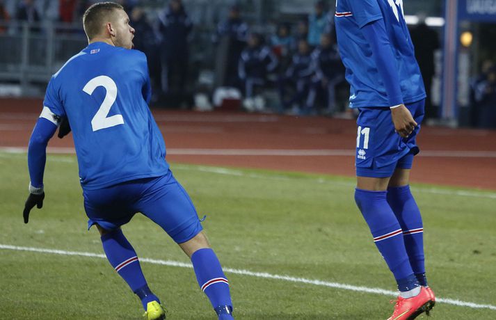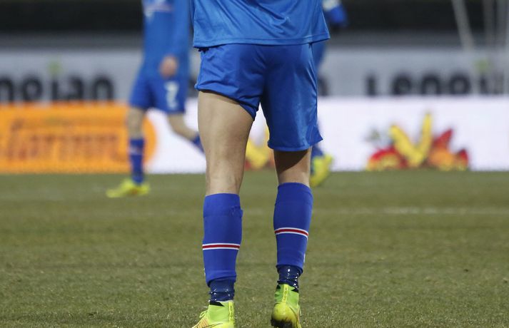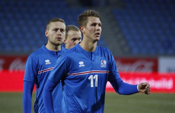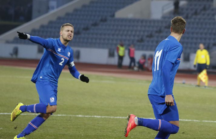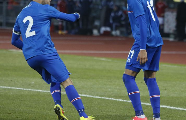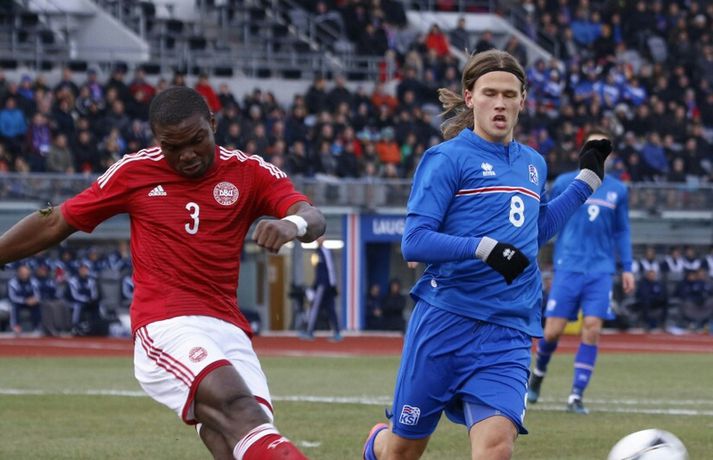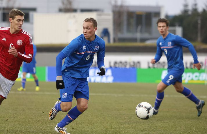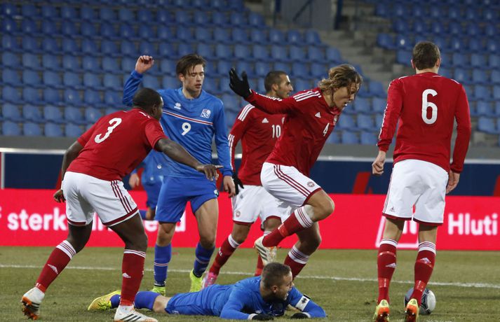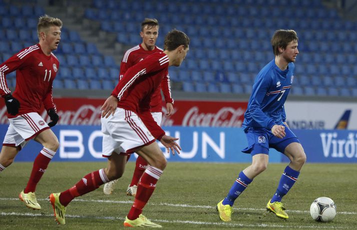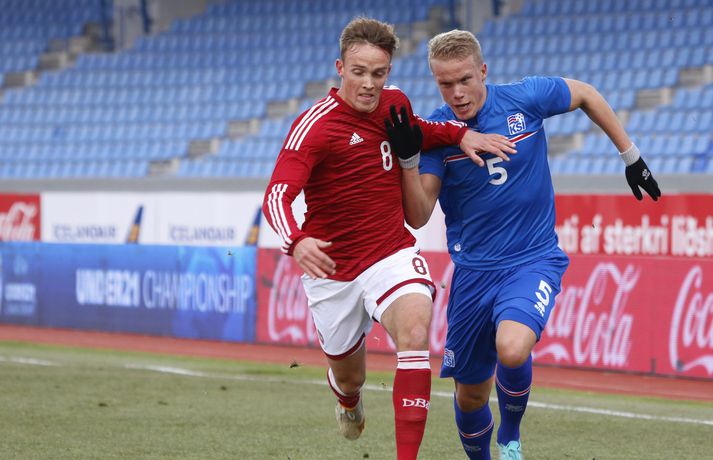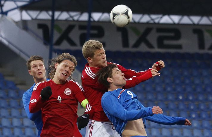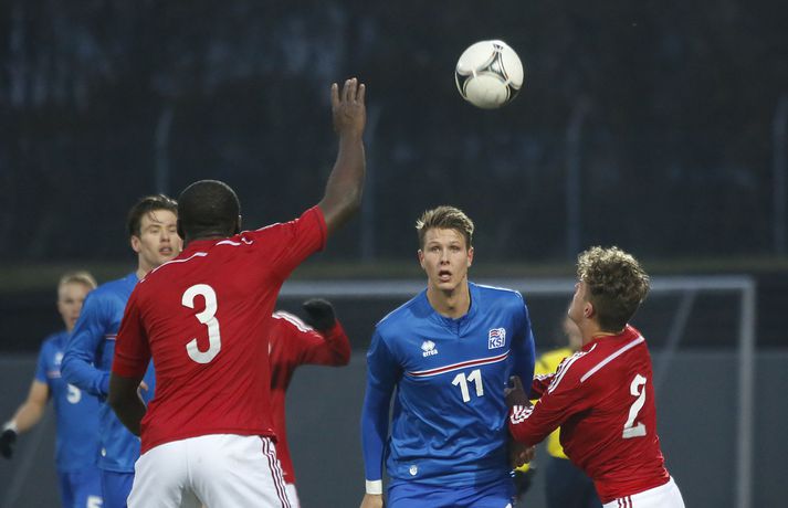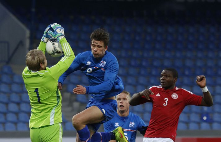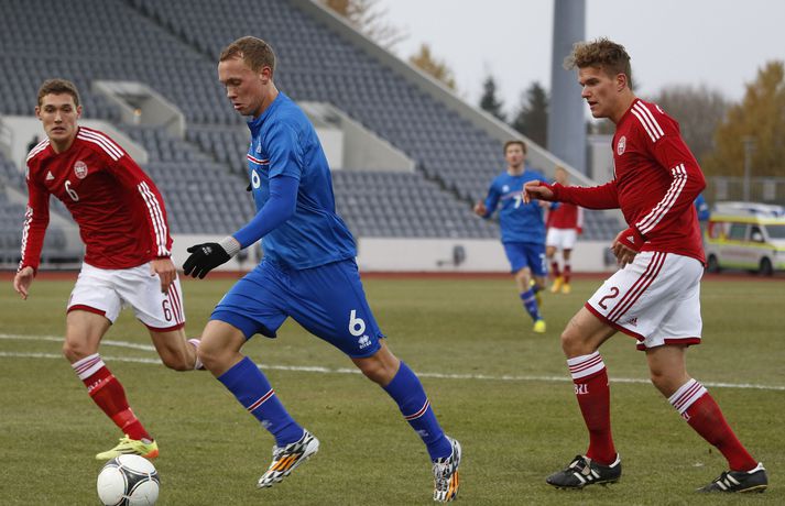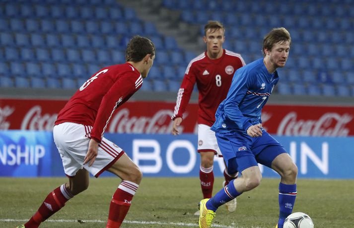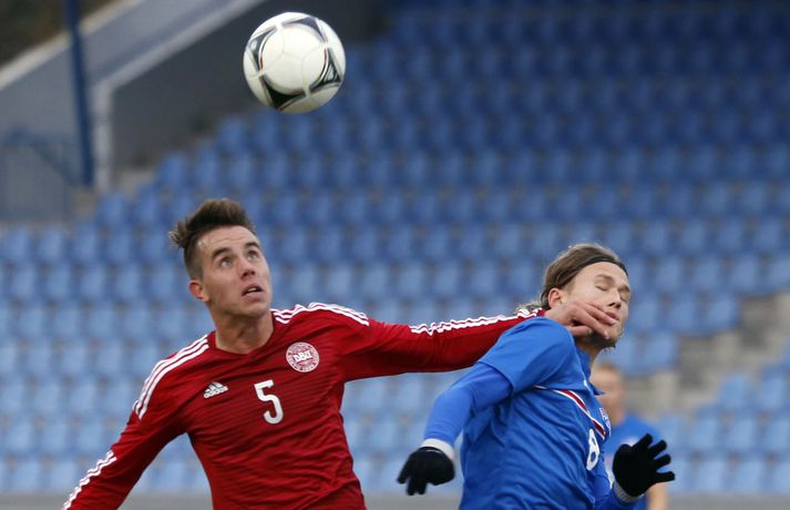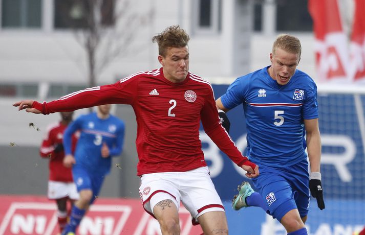 Danmörk tryggðu sér sæti á EM U21 árs landsliða sem fram fer í Tékklandi árið 2015. Þrjú mörk litu dagsins ljós í Laugardalnum, en öll komu þau alveg undir lok leiksins.Myndirnar hér að ofan tók Valgarður Gíslason, ljósmyndari Fréttablaðsins og Vísis, á Laugardalsvellinum í kvöld. Danirnir voru ívið sterkari og áttu sigurinn skilið. Þeir klikkuðu á fjölmörgum dauðafærum, en íslenska liðið beitti afar sterkri varnartaktík sem dugði vel þangað til nokkrar mínútur lifðu leiks. Þrjár breytingar voru á íslenska liðinu frá fyrri leiknum í Álaborg. Fredrik Schram tók stöðu Rúnars Alex Rúnarssonar í markinu, en Rúnar var meiddur. Hjörtur Hermannsson tók stöðu Harðar Björgvins Magnússonar í vinstri bakverðinum sem var í banni og Þorri Geir Rúnarsson kom inn í liðið á kostnað Emils Atlasonar. Fyrsti landsleikur Þorra var af dýrari gerðinni. Danirnir byrjuðu betur og Fredrik Schram þurfti heldur betur að taka á stóra sínum strax á þrettándu mínútu þegar hann varði skalla Andreas Christensen á meistaralegan hátt. Danirnir, voru eins og búist var við, mun meira með boltann, en sköpuðu sér ekki mörg opin tækifæri í fyrri hálfleik fyrir utan skalla Christensen. Andreas Cornelius fékk hálffæri sem Schram varði einnig stuttu síðar. Íslenska liðinu gekk, líkt og í fyrri leiknum, afar illa að halda boltanum innan liðsins, en Danirnir pressuðu stíft. Fyrsta skot Íslands kom eftir 34. mínútu leik og það var nær himnum en marki Dana. Leikurinn jafnaðist eftir því sem leið á hálfleikinn og bláklæddir heimamenn náðu einni til tveimur fínum sóknum áður en fyrri hálfleik lauk. Danir voru nærri því að komast yfir rétt fyrir hálfleik, en allt kom fyrir ekki og staðan var markalaus í hálfleik. Íslenska liðið var líklega nokkuð sátt að fara inn í hálfeikinn með 0-0 stöðu. Danirnir höfðu átt hættulegri færi og ætlaði liðið sér eitthvað í síðari hálfleik þurfti það að nýta sér sínar skyndisóknir betur og reyna halda boltanum betur í síðari hálfleik. Leikurinn opnaðist aðeins meira í síðari hálfleik. Ísland fékk meira sjálfstraust og byrjaði hálfleikinn vel; héldu boltanum vel, ágætis hreyfing meðal manna og þar fram eftir götunum. Eftir það dró aðeins af okkar mönnum aftur og Danirnir sóttu látlaust. Það dró svo til tíðinda átta mínútum fyrir leikslok. Orri Sigurður Ómarsson sendi þá háan bolta inn að marki Dana sem virtist vera að enda í höndum Jakob Jensen, markvarðar Dana, en Ólafur Karl Finsen setti pressu á hann svo hann missti boltann úr höndunum og inn. Dómari leiksins ákvað þó að dæma aukaspyrnu, en hann hefur líklega talið að boltinn hafi farið af hönd Ólafs og í markið. Löglegt mark tekið af okkar mönnum? Maður spyr sig. Það var svo uppúr löngu innkasti sem fyrsta mark leiksins kom. Nicolaj Thomsen kom boltanum í netið eftir darraðdans í teig Ísland. Staðan var orðin svört, því þá þurfti íslenska liðið að skora tvo mörk. Þeir voru þó ekki lengi að jafna. Jöfnunarmarkið kom einungis mínútu síðar þegar Hólmbert Aron Friðjónsson jafnaði metin úr vítaspyrnu eftir að brotið hafi verið á Sverri Inga Ingasyni. Okkar menn þurftu eitt mark í viðbót, en það tókst ekki og Danir leika því á Evrópumóti U21-árs landliða í knattspyrnu árið 2015. Íslenska liðið spilaði góðan varnarleik, en sóknarleikinn var ekki upp á marga fiska. Liðið var að spila við afar sterkt lið Dana, en eftir á að hyggja veltir maður því fyrir sér hvers vegna Eyjólfur Sverrisson skipti ekki fyrr inná. Það er þó alltaf gott að vera vitur eftir á. Liðið spilaði góðan varnarleik, vel agaðan, en Danirnir fengu mun fleiri og hættulegri færi og verða að teljast eiga sætið skilið, en mótið fer fram eins og fyrr segir í Tékklandi á næsta ári.vísir/valliSverrir Ingi: Stór ákvörðun hjá dómaranum „Þetta er gífurlega svekkjandi. Við vorum búnir að halda þeim ágætlega frá markinu okkar allan leikinn," sagði Sverrir Ingi Ingason, fyrirliði Íslands í leikslok. „Þeir eru meira að dúttla svona fyrir utan teig, en mér finnst við ekki vera nægilega skarpir sóknarlega. Í föstum leikatriðum og þess háttar, þá erum við meira og minna sofandi. Einnig í markinu sem þeir skora, þá erum við ekki að dekka. Það gerir útslagið." „Það var voðalega sárt. Því þá þurftum við tvö mörk, því útivallarmarkið telur auka. Þetta var erfitt, en við náðum að ná inn einu. Hann fór í mig þarna í teignum og þetta var pjúra víti. Við höfðum bara ekki meiri tíma," sagði Sverrir og aðspurður út í atvikið þegar markið var dæmt af Íslandi svaraði hann: „Mér fannst bara markvörðurinn verða hræddur. Hann er búinn að missa boltann áður en Óli fer í einvígið við hann. Hann nær aldrei að grípa boltann og Óli á alveg jafn mikinn rétt á að fara í boltann og markmaðurinn. Hann má nota hendurnar og það er yfirleitt alltaf brot þegar þú snertir hann." „Virkilega stór ákvörðun hjá dómaranum." „Völlurinn var gífurlega erfiður. Hann var frosinn og það var gífurlega erfitt að hemja boltann. Þegar við fengum sóknarmöguleikana þá vorum við ekki nægilega skarpir. Við hefðum átt að fá fleiri fyrirgjafir þvi við erum með stóra leikmenn og svona í teignum," sagði Sverrir að lokum.vísir/valliÓlafur Karl: Dómarinn flautar ósjálfrátt „Þetta var bara mark. Dómarinn flautar bara ósjálfrátt. Hann veit ekki sjálfur á hvað hann flautar á," sagði Ólafur Karl Finsen, vængmaður Íslands, um dóminn umdeilda í leiknum. Aðspurður hvort markmenn séu heilagir svaraði hann: „Mér sýnist það vera þannig. Hann vissi ekki hvað var að. Hann flautaði bara útaf eitthverju." „Þetta 