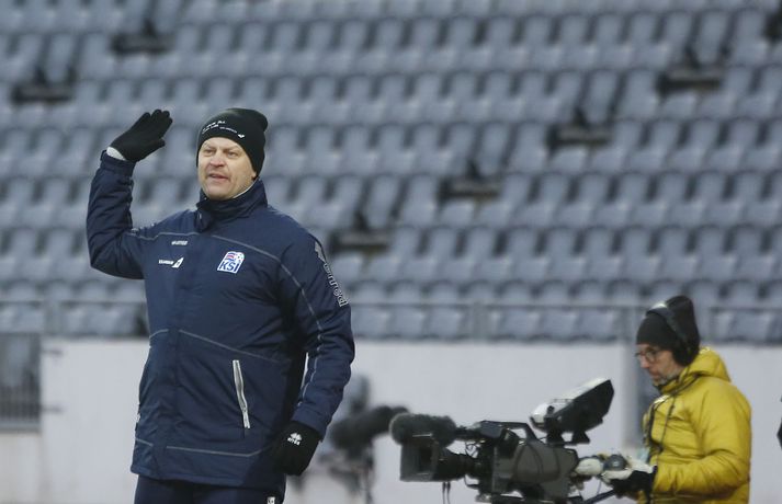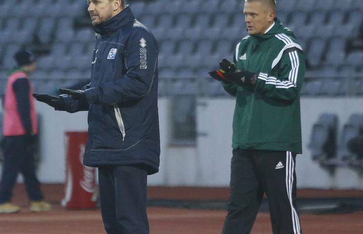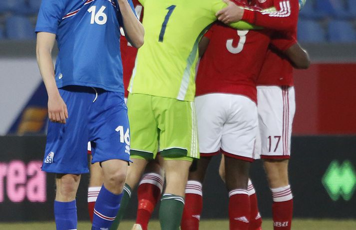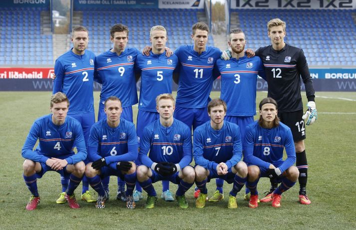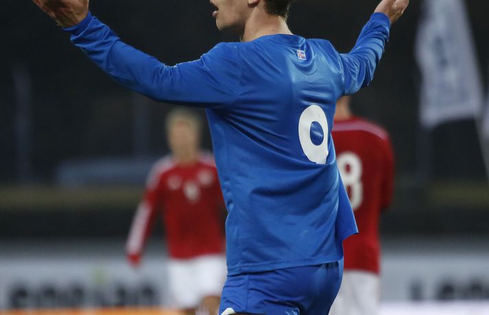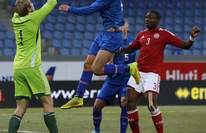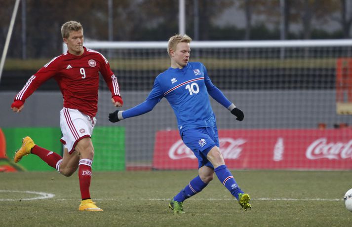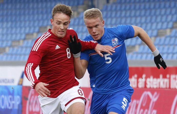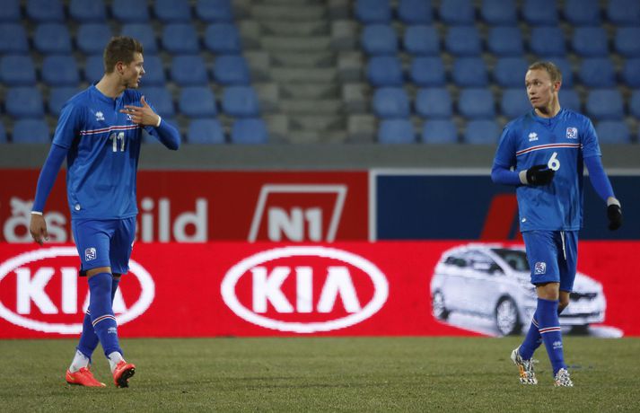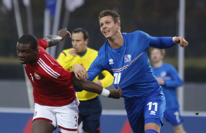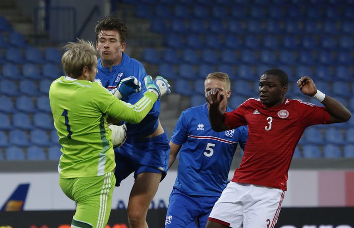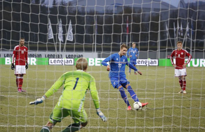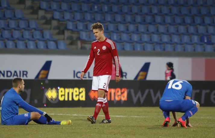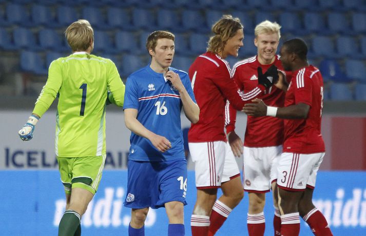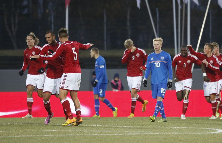 Umfjöllun, viðtöl og myndir: Ísland - Danmörk 1-1 | Strákarnir fara ekki á EM Ingvi Þór Sæmundsson og Anton Ingi Leifsson á Laugardalsvelli skrifar 14. október 2014 13:22 Emil Atlason svekktur í leikslok í kvöld en Danirnir fagna. Vísir/valli Danmörk tryggðu sér sæti á EM U21 árs landsliða sem fram fer í Tékklandi árið 2015. Þrjú mörk litu dagsins ljós í Laugardalnum, en öll komu þau alveg undir lok leiksins.Myndirnar hér að ofan tók Valgarður Gíslason, ljósmyndari Fréttablaðsins og Vísis, á Laugardalsvellinum í kvöld. Danirnir voru ívið sterkari og áttu sigurinn skilið. Þeir klikkuðu á fjölmörgum dauðafærum, en íslenska liðið beitti afar sterkri varnartaktík sem dugði vel þangað til nokkrar mínútur lifðu leiks. Þrjár breytingar voru á íslenska liðinu frá fyrri leiknum í Álaborg. Fredrik Schram tók stöðu Rúnars Alex Rúnarssonar í markinu, en Rúnar var meiddur. Hjörtur Hermannsson tók stöðu Harðar Björgvins Magnússonar í vinstri bakverðinum sem var í banni og Þorri Geir Rúnarsson kom inn í liðið á kostnað Emils Atlasonar. Fyrsti landsleikur Þorra var af dýrari gerðinni. Danirnir byrjuðu betur og Fredrik Schram þurfti heldur betur að taka á stóra sínum strax á þrettándu mínútu þegar hann varði skalla Andreas Christensen á meistaralegan hátt. Danirnir, voru eins og búist var við, mun meira með boltann, en sköpuðu sér ekki mörg opin tækifæri í fyrri hálfleik fyrir utan skalla Christensen. Andreas Cornelius fékk hálffæri sem Schram varði einnig stuttu síðar. Íslenska liðinu gekk, líkt og í fyrri leiknum, afar illa að halda boltanum innan liðsins, en Danirnir pressuðu stíft. Fyrsta skot Íslands kom eftir 34. mínútu leik og það var nær himnum en marki Dana. Leikurinn jafnaðist eftir því sem leið á hálfleikinn og bláklæddir heimamenn náðu einni til tveimur fínum sóknum áður en fyrri hálfleik lauk. Danir voru nærri því að komast yfir rétt fyrir hálfleik, en allt kom fyrir ekki og staðan var markalaus í hálfleik. Íslenska liðið var líklega nokkuð sátt að fara inn í hálfeikinn með 0-0 stöðu. Danirnir höfðu átt hættulegri færi og ætlaði liðið sér eitthvað í síðari hálfleik þurfti það að nýta sér sínar skyndisóknir betur og reyna halda boltanum betur í síðari hálfleik. Leikurinn opnaðist aðeins meira í síðari hálfleik. Ísland fékk meira sjálfstraust og byrjaði hálfleikinn vel; héldu boltanum vel, ágætis hreyfing meðal manna og þar fram eftir götunum. Eftir það dró aðeins af okkar mönnum aftur og Danirnir sóttu látlaust. Það dró svo til tíðinda átta mínútum fyrir leikslok. Orri Sigurður Ómarsson sendi þá háan bolta inn að marki Dana sem virtist vera að enda í höndum Jakob Jensen, markvarðar Dana, en Ólafur Karl Finsen setti pressu á hann svo hann missti boltann úr höndunum og inn. Dómari leiksins ákvað þó að dæma aukaspyrnu, en hann hefur líklega talið að boltinn hafi farið af hönd Ólafs og í markið. Löglegt mark tekið af okkar mönnum? Maður spyr sig. Það var svo uppúr löngu innkasti sem fyrsta mark leiksins kom. Nicolaj Thomsen kom boltanum í netið eftir darraðdans í teig Ísland. Staðan var orðin svört, því þá þurfti íslenska liðið að skora tvo mörk. Þeir voru þó ekki lengi að jafna. Jöfnunarmarkið kom einungis mínútu síðar þegar Hólmbert Aron Friðjónsson jafnaði metin úr vítaspyrnu eftir að brotið hafi verið á Sverri Inga Ingasyni. Okkar menn þurftu eitt mark í viðbót, en það tókst ekki og Danir leika því á Evrópumóti U21-árs landliða í knattspyrnu árið 2015. Íslenska liðið spilaði góðan varnarleik, en sóknarleikinn var ekki upp á marga fiska. Liðið var að spila við afar sterkt lið Dana, en eftir á að hyggja veltir maður því fyrir sér hvers vegna Eyjólfur Sverrisson skipti ekki fyrr inná. Það er þó alltaf gott að vera vitur eftir á. Liðið spilaði góðan varnarleik, vel agaðan, en Danirnir fengu mun fleiri og hættulegri færi og verða að teljast eiga sætið skilið, en mótið fer fram eins og fyrr segir í Tékklandi á næsta ári.vísir/valliSverrir Ingi: Stór ákvörðun hjá dómaranum „Þetta er gífurlega svekkjandi. Við vorum búnir að halda þeim ágætlega frá markinu okkar allan leikinn," sagði Sverrir Ingi Ingason, fyrirliði Íslands í leikslok. „Þeir eru meira að dúttla svona fyrir utan teig, en mér finnst við ekki vera nægilega skarpir sóknarlega. Í föstum leikatriðum og þess háttar, þá erum við meira og minna sofandi. Einnig í markinu sem þeir skora, þá erum við ekki að dekka. Það gerir útslagið." „Það var voðalega sárt. Því þá þurftum við tvö mörk, því útivallarmarkið telur auka. Þetta var erfitt, en við náðum að ná inn einu. Hann fór í mig þarna í teignum og þetta var pjúra víti. Við höfðum bara ekki meiri tíma," sagði Sverrir og aðspurður út í atvikið þegar markið var dæmt af Íslandi svaraði hann: „Mér fannst bara markvörðurinn verða hræddur. Hann er búinn að missa boltann áður en Óli fer í einvígið við hann. Hann nær aldrei að grípa boltann og Óli á alveg jafn mikinn rétt á að fara í boltann og markmaðurinn. Hann má nota hendurnar og það er yfirleitt alltaf brot þegar þú snertir hann." „Virkilega stór ákvörðun hjá dómaranum." „Völlurinn var gífurlega erfiður. Hann var frosinn og það var gífurlega erfitt að hemja boltann. Þegar við fengum sóknarmöguleikana þá vorum við ekki nægilega skarpir. Við hefðum átt að fá fleiri fyrirgjafir þvi við erum með stóra leikmenn og svona í teignum," sagði Sverrir að lokum.vísir/valliÓlafur Karl: Dómarinn flautar ósjálfrátt „Þetta var bara mark. Dómarinn flautar bara ósjálfrátt. Hann veit ekki sjálfur á hvað hann flautar 