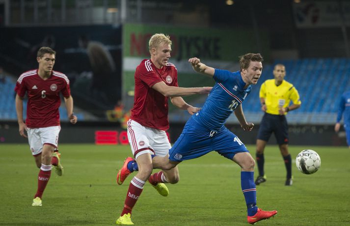 Umfjöllun: Danmörk - Ísland 0-0 | Allt opið í rimmunni við Dani Henry Birgir Gunnarsson í Álaborg skrifar 10. október 2014 12:59 Ólafur Karl Finsen í baráttunni við Alexander Scholz. Vísir/Daníel Leikur Danmerkur og Íslands var grútleiðinlegur en það skipti engu máli því íslenska liðið náði þeim úrslitum sem það ætlaði sér. Markalaust jafntefli í fyrri leiknum gegn sterku liði Dana og því er okkar lið í góðum möguleika í seinni leiknum. Íslenska liðið hóf leikinn ágætlega en heimamenn tóku leikinn fljótlega yfir og hófu að þjarma að íslenska liðinu. Lungi fyrri hálfleiks fór fram á vallarhelmingi íslenska liðsins en það var viðbúið. Það var líka allt í lagi því strákarnir vörðust fimlega og Danirnir sköpuðu lítið af færum. Besta færi Dana kom seint í hálfleiknum er fyrrum leikmaður Stjörnunnar, Alexander Scholz, átti frábæra sendingu á Lasse Christensen en skot hans var lélegt og sigdli yfir markið. Danir skoruðu rétt fyrir hlé en aukaspyrna dæmd á þá. Fyrir litlar sakir að því er virtist en við kvörtum ekki yfir því. Strákarnir voru að sama skapi fljótir fram er þeir fengu tækifæri til þess að sækja hratt en færin voru af skornum skammti. Liðið var heldur ekki að ná að nýta föstu leikatriði sem skildi. Engu að síður var gott að fara með 0-0 til búningsherbergja. Danir héldu áfram að sækja í síðari hálfleik og íslenska liðið lá í skotgröfunum. Liðið sem fyrr að verjast vel en smá fát í að hreinsa frá en strákarnir sluppu með skrekkinn. Danir reyndu að toga og teygja íslensku vörnina en með frekar takmörkuðum árangri. Þegar þeir reyndu síðan langskot þá voru þeir ekki nærri því að skora. Þetta var að spilast eins og íslenska liðið vildi. Það dró svo úr sóknarþunganum eftir því sem leið á hálfleikinn. Danir áttu engin svör við varnarmúr íslenska liðsins. Íslenska liðið hafði nákvæmlega engan áhuga á því að sækja. Oft var bara neglt fram án þess að athuga hvort það væri maður í blárri treyju á svæðinu. Maður myndi ætla að þetta lið gæti meira fram á við en þetta er víst 180 mínútna rimma. Það var brjáluð vinnsla í íslenska liðinu í leiknum. Menn gríðarlega duglegir og fórnuðu sér í allt. Liðið mjög þétt og miðverðirnir líklega með hausverk eftir að hafa skallað alla þessa bolta í burtu. Fyrri hálfleikur í rimmunni búinn og Íslandí fínni stöðu. Nú er það strákanna að sýna að þeir geti líka sótt gegn þessu danska liði. Fótbolti Mest lesið „Rokk og ról“ hjá Frey í villta vestrinu Fótbolti Sjáðu atvikið: Hágrátandi Hakimi frá í nokkrar vikur Fótbolti Óstöðvandi Osimhen, magurt hjá Mourinho og Bilbao brenndir Fótbolti Böl Börsunga í Belgíu Fótbolti Uppgjörið: KR - Grindavík 68-85 | Gestirnir á toppinn Körfubolti „Leyfðum þremur leikmönnum að ganga frá okkur“ Sport Spilaði meira en síðustu tvo mánuði til samans Enski boltinn Magdeburg skoraði 45 en lærisveinar Guðjóns Vals úr leik Handbolti Valskonur niðurlægðu Íslandsmeistarana Körfubolti Nik fær Lindu Líf til Kristianstad Fótbolti Fleiri fréttir „Rokk og ról“ hjá Frey í villta vestrinu Sjáðu atvikið: Hágrátandi Hakimi frá í nokkrar vikur Óstöðvandi Osimhen, magurt hjá Mourinho og Bilbao brenndir Böl Börsunga í Belgíu Foden í stuði gegn Dortmund Spilaði meira en síðustu tvo mánuði til samans Nik fær Lindu Líf til Kristianstad Sandra María skoraði í svekkjandi leik Emelía með þrennu gegn FCK Óvænt úrslit í Meistaradeildinni „Mér finnst þetta ekki leiðinlegur fótbolti“ Davíð Smári tekur við Njarðvík Jeffs tekur við Breiðabliki Dældi fyrri afrekum inn á Instagram eftir vonbrigðin Valdi Isak en ekki Gyökeres í fyrsta landsliðshópinn sinn Leiðir Breiðabliks og Damir skilja Mál Alberts truflar landsliðið ekki Stuðningsmenn Bröndby enn á ný í vandræðum Vonar að Jóhann og Hörður gefi jafn mikið af sér og Aron Orri Steinn lengra frá því að ná þessum leikjum en þeim í síðasta glugga Hópurinn fyrir lokaleikina: Hörður og Jóhann snúa aftur Svona var blaðamannafundur Arnars Rooney að kenna að Liverpool er komið á sigurbrautina á ný? Ánægð með að mæta Íslandi „Ég myndi ekki óska neinum þess að lenda í þessu“ Fékk faðmlag frá konu Diogo Jota í miðju maraþoni Arnar Gunnlaugsson las yfir vælandi fýlupúkum hjá Real Madrid Sjáðu sigurmark Liverpool á móti Real Madrid og mörkin hjá Arsenal í Prag „Við viljum koma Haukum á fótboltakortið“ Ógnaði leikmanni Tottenham með byssu út á götu Sjá meira