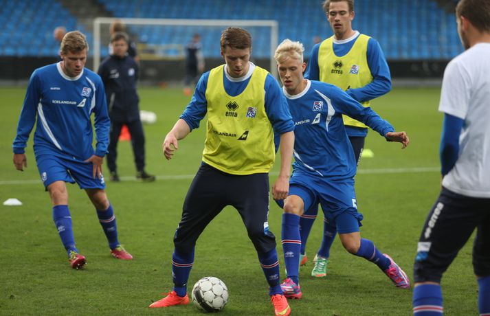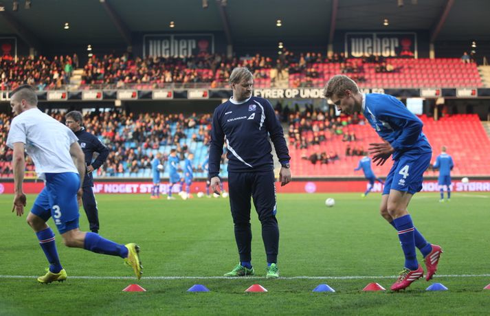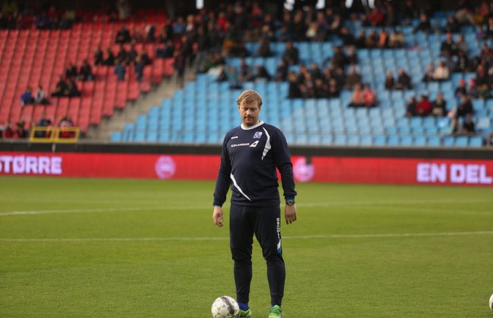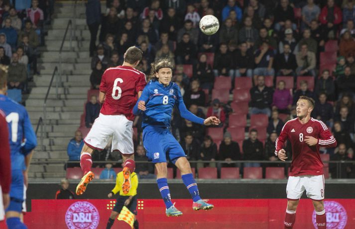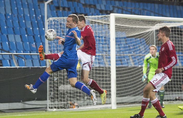 Leikur Danmerkur og Íslands var grútleiðinlegur en það skipti engu máli því íslenska liðið náði þeim úrslitum sem það ætlaði sér. Markalaust jafntefli í fyrri leiknum gegn sterku liði Dana og því er okkar lið í góðum möguleika í seinni leiknum. Íslenska liðið hóf leikinn ágætlega en heimamenn tóku leikinn fljótlega yfir og hófu að þjarma að íslenska liðinu. Lungi fyrri hálfleiks fór fram á vallarhelmingi íslenska liðsins en það var viðbúið. Það var líka allt í lagi því strákarnir vörðust fimlega og Danirnir sköpuðu lítið af færum. Besta færi Dana kom seint í hálfleiknum er fyrrum leikmaður Stjörnunnar, Alexander Scholz, átti frábæra sendingu á Lasse Christensen en skot hans var lélegt og sigdli yfir markið. Danir skoruðu rétt fyrir hlé en aukaspyrna dæmd á þá. Fyrir litlar sakir að því er virtist en við kvörtum ekki yfir því. Strákarnir voru að sama skapi fljótir fram er þeir fengu tækifæri til þess að sækja hratt en færin voru af skornum skammti. Liðið var heldur ekki að ná að nýta föstu leikatriði sem skildi. Engu að síður var gott að fara með 0-0 til búningsherbergja. Danir héldu áfram að sækja í síðari hálfleik og íslenska liðið lá í skotgröfunum. Liðið sem fyrr að verjast vel en smá fát í að hreinsa frá en strákarnir sluppu með skrekkinn. Danir reyndu að toga og teygja íslensku vörnina en með frekar takmörkuðum árangri. Þegar þeir reyndu síðan langskot þá voru þeir ekki nærri því að skora. Þetta var að spilast eins og íslenska liðið vildi. Það dró svo úr sóknarþunganum eftir því sem leið á hálfleikinn. Danir áttu engin svör við varnarmúr íslenska liðsins. Íslenska liðið hafði nákvæmlega engan áhuga á því að sækja. Oft var bara neglt fram án þess að athuga hvort það væri maður í blárri treyju á svæðinu. Maður myndi ætla að þetta lið gæti meira fram á við en þetta er víst 180 mínútna rimma. Það var brjáluð vinnsla í íslenska liðinu í leiknum. Menn gríðarlega duglegir og fórnuðu sér í allt. Liðið mjög þétt og miðverðirnir líklega með hausverk eftir að hafa skallað alla þessa bolta í burtu. Fyrri hálfleikur í rimmunni búinn og Íslandí fínni stöðu. Nú er það strákanna að sýna að þeir geti líka sótt gegn þessu danska liði.