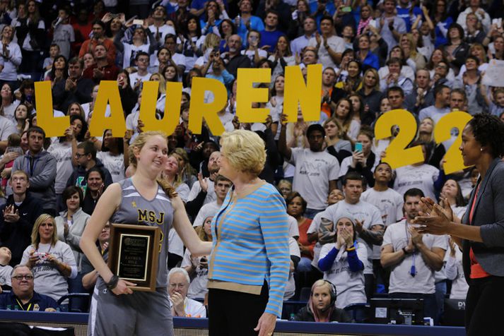 Lauren Hill, 19 ára körfuboltastelpa í Mount St. Joseph háskólanum, spilaði aðeins 47 sekúndur í fyrsta leik tímabilsins en þessar sekúndur voru kannski þær allra dramatískustu á þessu ári í bandarísku íþróttalífi. Lauren Hill er dauðvona því hún greindist með ólæknandi krabbamein í höfði aðeins 48 dögum eftir að hún ákvað að spila fyrir Mount St. Joseph háskólaliðið. Hún fékk þær fréttir í september að hún ætti aðeins nokkrar vikur eftir. „Ég hélt að ég myndi aldrei fá að spila háskólakörfubolta en um leið og ég steig inn á gólfið þá fann ég titringinn frá öll fólkinu. Mér hefur aldrei liðið svona vel á allri ævinni," sagði Lauren Hill en hún skoraði fyrstu körfu leiksins eftir 17 sekúndur. „Ég bjóst bara við lítilli umgjörð og að þetta yrði bara fyrir okkar samfélag hérna. Þetta samfélag er bara svo stórt og við erum öll í þessu saman. Allir sameinuðust í dag og þetta var stórkostlegt," sagði Lauren sem var ekki viss um að geta spilað næsta leik liðsins. Mount St. Joseph háskólinn fékk að færa fyrsta leik tímabilsins fram svo að Lauren Hill, fengi að upplifa drauminn sinn um að spila körfubolta í háskóla. Um 100 manns koma venjulega á leiki liðsins en nú var allt annað upp á teningnum. Tíu þúsund manns fylltu höllina á leiknum og í áhorfendaskaranum mátti finna leikmenn úr bæði WNBA og NFL. „Draumur Laurenar um að spila körfubolta í Mount-búningi rætist í dag. Tíu þúsund manns eru samankomin til að upplifa þetta með henni og í dag spilum við fyrir 22," sagði Dr. Tony Aretz, forseti Mount St. Joseph háskólans fyrir leikinn en Lauren spilaði í treyju númer 22. Hér fyrir neðan má sjá frétt CBS um Lauren Hill og leikinn.Lauren Hill með Pat Summitt, eins virtasta köfuboltaþjálfara allra tíma.Vísir/AP