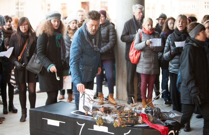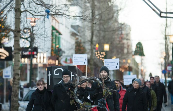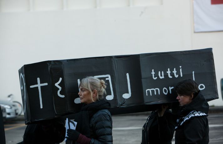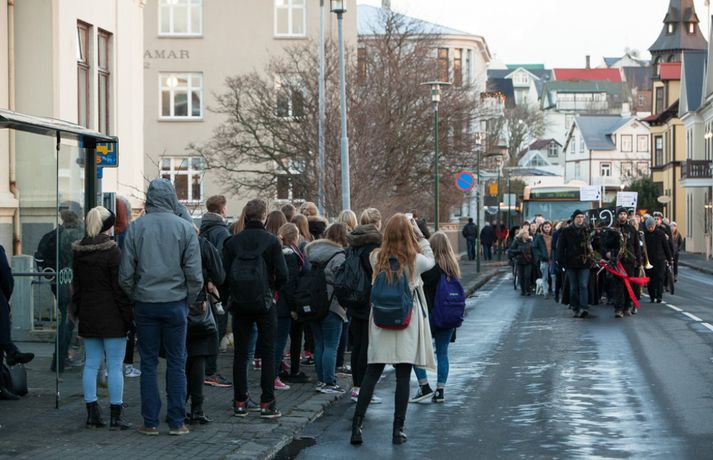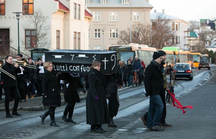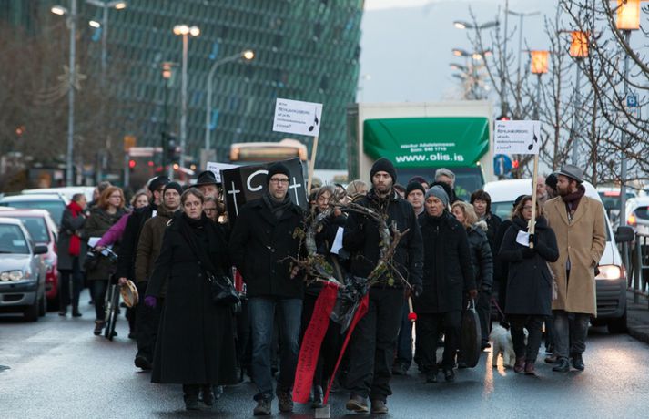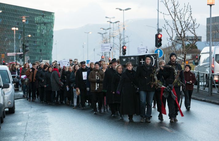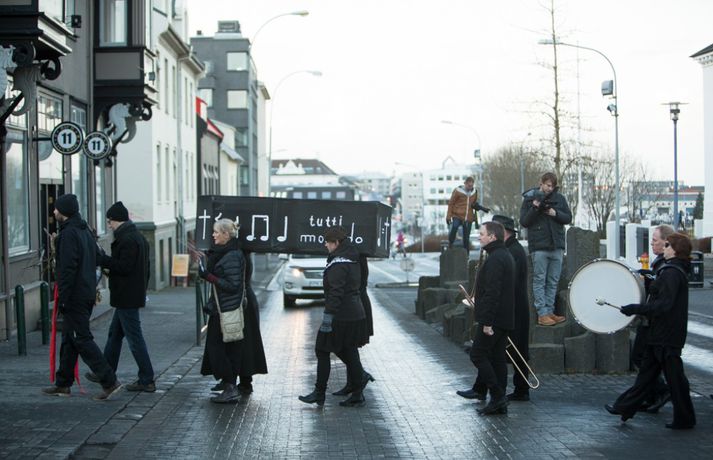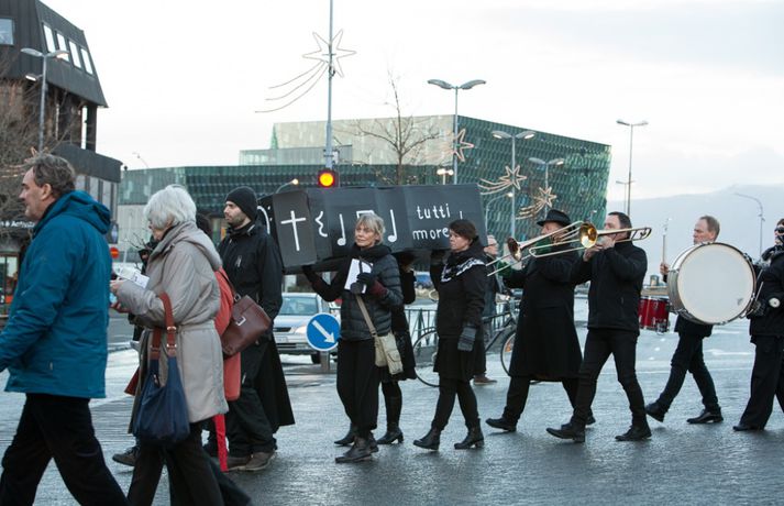 Enn stendur yfir fundur Félags tónlistarkennara og samninganefndar sveitarfélaga í húsakynnum ríkissáttasemjara. Fundurinn hófst klukkan 13 í dag. Lítið hefur þokast í kjaraviðræðum tónlistarkennara en á miðvikudag mun verkfall þeirra hafa staðið yfir í fimm vikur, hafi ekki samist fyrir þann tíma. Tónlistarkennarar efndu í dag til sorgargöngu í miðborginni undir yfirskriftinni: Ætlið þið að kviksetja tónlistarkennara á ykkar vakt, ráðamenn Reykjavíkur? Safnast var saman í Lýðveldisgarðinum og gengið þaðan að Ráðhúsi Reykjavíkur með líkkistu, undir sálmasöng og sorgarmarsi Chopin. Við Ráðhúsið var síðan stutt athöfn. Meðfylgjandi myndir tók Ernir Eyjólfsson ljósmyndari í dag.vísir/ernir