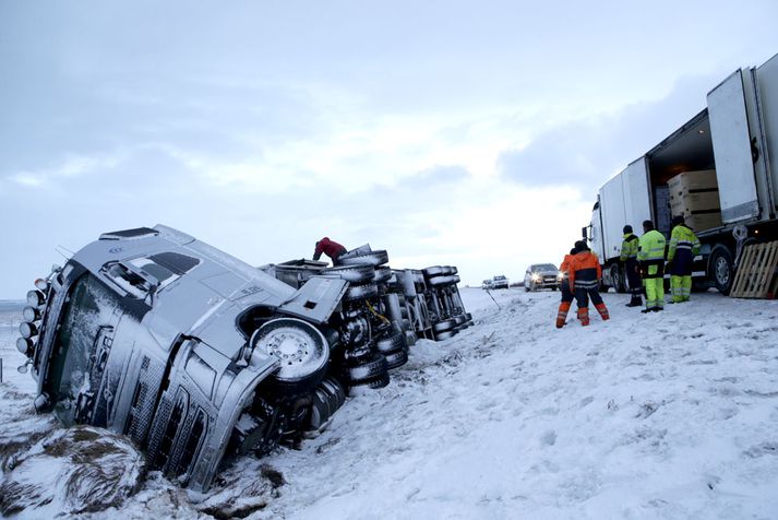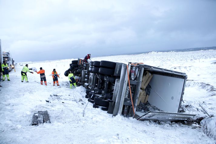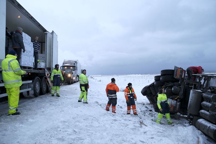 Hæg umferð undir Hafnarfjalli: Um 50 milljóna króna tjón Kolbeinn Tumi Daðason skrifar 9. desember 2014 12:43 Löndun fer fram á Vesturlandsvegi og mun standa eitthvað fram eftir degi. Vísir/Vilhelm Unnið er að því að afferma fiskflutningabíl sem hafnaði utan vegar undir Hafnarfjalli í óveðrinu sem gekk yfir landið í gærkvöldi og nótt. Talið er að tjónið geti numið allt að 70 milljónum króna en bíllinn fór útaf veginum um níuleytið í gær. Nokkuð var um að bílar höfnuðu utan vegar á sömu slóðum í gærkvöldi. Samkvæmt upplýsingum frá lögreglunni í Borgarnesi fóru fimm bílar útaf í gærkvöldi og nótt. Voru þeir allir skyldir eftir mannlausir á meðan versta veðrið gekk yfir. Þá fór einn bíll útaf í morgun en um minniháttaróhapp var að ræða. Verðmæti fiskflutningabílsins er talið vera um 25 milljónir króna og en virði vagnsins er um 22 milljónir. Þá er talið að verðmæti fisksins sé um 20 milljónir króna en samkvæmt upplýsingum af staðnum er talið að megnið af honum sé í lagi. Önnur akreinin á Vesturlandsvegi er lokuð á kafla vegna slyssins og gengur umferð hægt á þeim slóðum af þeim sökum.Vilhelm Gunnarsson, ljósmyndari Fréttablaðsins og Vísis, var á vettvangi í dag eins og sjá má hér að neðan.Vísir/VilhelmVísir/VilhelmVísir/VilhelmMyndirnar voru teknar upp úr hádegi í dag.Vísir/Vilhelm Mest lesið Fjöldi ásakana um brot gegn barnungum stúlkum Erlent „Mjög áhugaverð umræða“ Innlent Nýbirt skjöl varpa ljósi á dánarstund Epstein Erlent Þúsundir kvartana vegna leigubílaaksturs en fagnar breytingum Innlent Fífldjarft að fara í formanninn en varaformannsembættið...? Innlent Játaði brot sín og sleppur ekki aftur við fangelsisvist Innlent Jói Fel málar með puttunum Innlent Vísar því á bug að HSÍ fái ekkert fyrir sinn snúð Innlent Hýdd 140 sinnum fyrir áfengisneyslu og kynlíf utan hjónabands Erlent Segir um að ræða alvarlega aðför að sjálfstæði forseta Íslands Innlent Fleiri fréttir „Mjög áhugaverð umræða“ Þúsundir kvartana vegna leigubílaaksturs en fagnar breytingum Breki Atlason gefur kost á sér á lista Miðflokksins Skjálfti fannst í Hveragerði Jói Fel málar með puttunum „Voðalega eru Íslendingarnir peppaðir“ Vísar því á bug að HSÍ fái ekkert fyrir sinn snúð Handboltaveisla í beinni, málsvörn olíufélaga og fögnuður leigubílstjóra Forsætisráðherra muni alltaf hafa samráð við forseta Rannsókn vegna Deildu.net hætt tíu árum frá kæru Ríkisstjórnin rugli og olíufélögin ekki sökudólgurinn Betri að innleiða tilskipanir en verri að innleiða reglugerðir Segir um að ræða alvarlega aðför að sjálfstæði forseta Íslands Hitni undir olíufélögum sem þurfi að passa sig Stórleikurinn riðlar dagskrá margra Afar sérstakt að lækka laun og það á verkalýðsdaginn sjálfan Kristrún ræðir verðbólguna og allt á suðupunkti fyrir leikinn í kvöld Aldrei verið gefnar út fleiri rauðar viðvaranir Finnist hvergi eins sterk skilyrði til umhverfisverndar í lagareldi Streymi: Heilsan okkar: Meðferð offitu hjá fullorðnum Burðardýr hlaut þungan dóm fyrir vökvasmygl Fífldjarft að fara í formanninn en varaformannsembættið...? Játaði brot sín og sleppur ekki aftur við fangelsisvist Ráðhús Árborgar sprungið – 10 starfsmenn fluttir í annað húsnæði Streymi: Málþing um stöðu fatlaðra barna í íþróttum Lögregla eltist við afbrotamenn Harma launalækkanir í fiskeldi á Vestfjörðum Myndbirtingar foreldra geti skapað hættu Óvissustigi lýst yfir vegna snjóflóðahættu „Muni ekki valda neinu öðru en umferðaröngþveiti“ Sjá meira