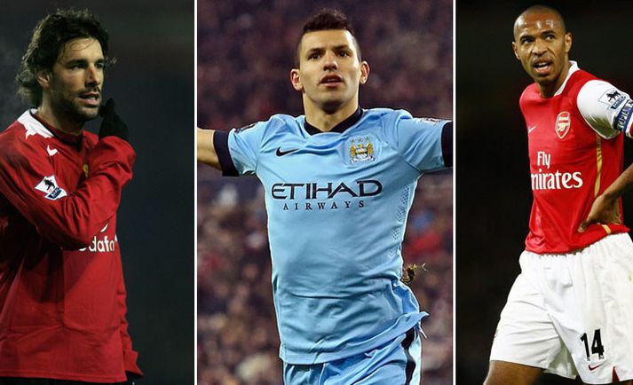 Færri mínútur á milli marka hjá Agüero en hjá Henry og Nistelrooy Tómas Þór Þórðarson skrifar 4. desember 2014 12:00 Ekki amalegur félagsskapur. vísir/getty Sergio Agüero, framherji Manchester City, heldur áfram að fara á kostum á tímabilinu, en hann skoraði tvö mörk í 4-1 sigri meistaranna gegn Sunderland í gærkvöldi. Þar með er Argentínumaðurinn búinn að skora fjórtán mörk í deildinni til þessa, en hann er markahæstur; búinn að skora þremur mörkum meira en brasilíski Spánverjinn Diego Costa hjá Chelsea. Mörkin tvö hjá Agüero voru númer 65 og 66 hjá honum í úrvalsdeildinni í 101. leiknum, en hann hefur nú skorað mark á 108 mínútna fresti. Þetta eru fæstar mínútur á milli marka í sögu úrvalsdeildarinnar. Argentínumaðurinn skýtur með því tveimur af allra bestu framherjum úrvalsdeildarinnar í sögu hennar ref fyrir rass; Thierry Henry og Ruud van Nistelrooy. Henry skoraði 176 mörk í 258 leikjum fyrir Arsenal og setti eitt mark á 122 mínútna fresti. Nistelrooy skoraði 95 mörk í 150 úrvalsdeildarleikjum fyrir Manchester United, en hann skoraði mark á 128 mínútna fresti. Mörk Agüero hafa hjálpað meisturunum að halda í við Chelsea í toppbaráttu ensku úrvalsdeildarinnar og þá hélt hann lífi í Meistaradeildardraumum liðsins í síðustu viku með magnaðri þrennu gegn Bayern München. Í heildina er Agüero búinn að skora 19 mörk í 20 leikjum það sem af er á tímabilinu. Hann er búinn að skora 14 mörk í 14 leikjum í úrvalsdeildinni og fimm mörk í fimm leikjum í Meistaradeildinni. Honum mistókst bara að skora í deildabikarnum.108 - Best mins-per-goal rate in PL history: Aguero 108 mins Henry 122 mins van Nistelrooy 128 mins Lethal. pic.twitter.com/4XfmQACdeE— OptaJoe (@OptaJoe) December 3, 2014 14 - Sergio Aguero (14) has now scored more goals than Sunderland (13) in the Premier League this season. Lethal.— OptaJoe (@OptaJoe) December 3, 2014 Enski boltinn Tengdar fréttir Úrslit kvöldsins í enska boltanum | Myndband Staða efstu liðanna í enska boltanum breyttist ekki neitt í leikjum kvöldsins. 3. desember 2014 19:00 Man. City heldur eltingarleiknum áfram | Myndband Fimm af sjö leikjum Sunderland á heimavelli til þessa hefur lyktað með jafntefli. 3. desember 2014 14:03 Mest lesið Hættur aðeins þrítugur Golf Sjáðu geggjaðan snúning Alberts áður en hann skoraði frábært mark Fótbolti Bunting dró orð sín til baka með tárin í augunum: „Ég er ekki meistari fólksins“ Sport Sakaður um svindl á HM í pílukasti Sport Táningur fær mikið hrós fyrir viðbrögð sín þegar mótherji missti meðvitund Fótbolti Afkáralegt fagn hjá hetju Sambíu Fótbolti Steraleikarnir segi ungu fólki að það sé aldrei nógu fullkomið Sport Áfallið staðreynd og Isak búinn í aðgerð Enski boltinn Áhorfendur ærðust eftir mögulega mark mótsins í fyrsta leik Fótbolti Klappstýrur Björgvins Karls slógu í gegn Sport Fleiri fréttir Fulham skildi Forest eftir við fallsvæðið Áfallið staðreynd og Isak búinn í aðgerð Fagnaði titli Liverpool sem óður maður um alla borg „Allir virðast elska hann“ „Þetta mun ekki buga okkur“ Guardiola mun vigta leikmenn Man City eftir jólin „Ef þið væruð Antoine Semenyo, hvert mynduð þið fara?“ Sjáðu mörkin: Rogers sá um Manchester United Óttast að Isak hafi fótbrotnað Tvenna frá Rogers tryggði Villa sigur gegn Manchester United Fimmta sinn sem Arsenal er á toppnum um jólin: Unnu ekki titilinn í fyrstu fjögur skiptin „Viljum við að okkar verði minnst fyrir að vera skræfur?“ „Ef dómarinn hefði sinnt sínu starfi almennilega hefði Romero ekki fengið spjald“ Haaland gaf barnabarni Hareide gjöf Sjáðu mörkin úr enska: Sviptingar, sænskt þema og svakalegar tæklingar Calvert-Lewin hættir ekki að skora Gyökeres skaut Arsenal aftur á toppinn Slot fámáll um stöðuna á Isak Gleði og sorg í sigri Liverpool Dramatík er Broja reyndist hetja Burnley Haaland frábær er Manchester City komst á toppinn Andri Lucas skoraði í langþráðum sigri Blackburn Chelsea vann upp tveggja marka forskot á St James' Park Ekkert fararsnið á Guardiola sem segir að City verði að vera undirbúið Tíu bestu mörkin úr leikjum Liverpool og Tottenham Salah bað samherjana afsökunar Lineker fokillur við blaðamann: „Þvílíkt kjaftæði“ Skírði soninn LFC og Mac Allister lét draum feðganna rætast Jóga og pílates lykillinn að snöggri endurkomu Fantasýn: „Hann setti allt á 3 og það kom upp 19“ Sjá meira