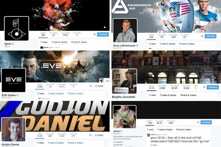 Samfélagsmiðillinn Twitter nýtur vaxandi vinsælda hér á landi og mætti segja að 2014 væri ár tístsins miðað við hversu margir Íslendingar eru farnir að nota vefinn. Fréttablaðið hefur tekið saman upplýsingar um Íslendinga sem eru áberandi á vefnum. Einnig kemur fram hversu mörgum fylgjendum sumir bættu við sig. Björk á flesta fylgjendur og í öðru sæti er Of Monsters and Men. FjölmiðlafólkGuðjón Daníel Jónsson (með fótboltastöð á YouTube) Fylgjendur 140.231 Fylgir 498Auðunn Blöndal Fylgjendur 14.526 Fylgir 411 Bætti við sig á árinu 3.780Egill Einarsson Fylgjendur 13.551 Fylgir 851 Bætti við sig á árinu 3.820Gummi Ben Fylgjendur 11.757 Fylgir 1.051 Bætti við sig á árinu 2.729Steindi Jr. Fylgjendur 8.973 Fylgir 165FIFA 15 | THE GD PROJECT | WINNING STREAK! https://t.co/azq0Ti74bl — Guðjón Daníel (@GudjonDaniel) December 18, 2014Fyrirtæki og stofnanirEVE Online Fylgjendur 54.696 Fylgir 46Icelandair Fylgjendur 57.313 Fylgir 24.338Inspired by Iceland Fylgjendur 19.997 Fylgir 812Iceland Airwaves Fylgjendur 17.454 Fylgir 641Lögreglan á höfuðborgarsvæðinu Fylgjendur 8.354 Fylgir 41Holiday Propaganda in #eveonlinehttps://t.co/YqCqVLJyLM#tweetfleet — EVE Online (@EveOnline) December 16, 2014TónlistarmennBjörk Fylgjendur 554.467 Fylgir 30 Bætti við sig á árinu 72.998Of Monsters and Men Fylgjendur 311.512 Fylgja 12.945 Bættu við sig á árinu 60.227Sigurrós Fylgjendur 183.187 Fylgja 20.692 Bættu við sig á árinu 23.286Jónsi í Sigur Rós Fylgjendur 155.388 Fylgir 89.737 Bætti við sig á árinu 4.085Ólafur Arnalds Fylgjendur 30.043 Fylgir 516 Bætti við sig á árinu 7.302"in iceland, you have the lava, almost no trees, almost no animals and almost no people, so things are very stripped down. it's very naked.” — björk (@bjork) November 14, 2014Birgitta JónsdóttirStjórnmálamennBirgitta Jónsdóttir Fylgjendur 23.160 Fylgir 2.989 Bætti við sig á árinu 3.436Jón Gnarr Fylgjendur 15.777 Fylgir 42 Bætti við sig á árinu 8.990Dagur B. Eggertsson Fylgjendur 3.057 Fylgir 450 Bætti við sig á árinu 2.244Sigmundur Davíð Gunnlaugsson Fylgjendur 1.650 Fylgir 173 Bætti við sig á árinu 960Svandís Svavarsdóttir Fylgjendur 1.208 Fylgir 683 Bætti við sig á árinu 693Dear Chelsea Manning: birthday messages from Snowden, Sacco,Terry Gilliam, Alan Moore, Molly Crabapple, me & more. https://t.co/rYK0iamrwf — Birgitta Jónsdóttir (@birgittaj) December 16, 2014