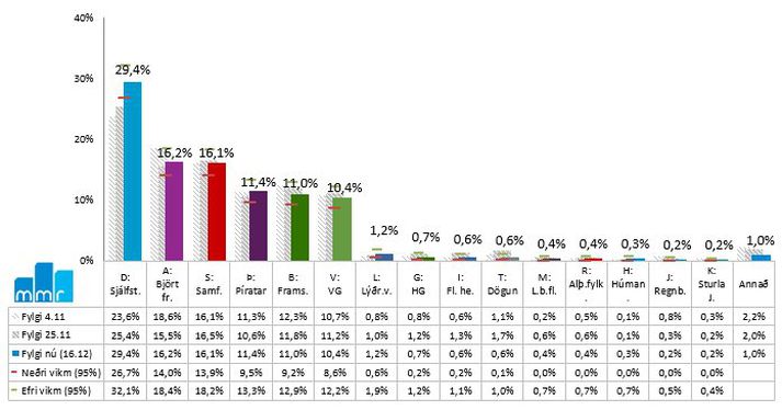 Stuðningur við ríkisstjórnina mældist nú 37,3% en mældist 36,4% í síðustu mælingu og 33,0% í byrjun nóvember. Þetta kemur fram í könnun MMR um fylgi stjórnmálaflokka og stuðning við ríkisstjórnina á tímabilinu 9. til 16. desember. Fylgi Sjálfstæðisflokksins mældist nú 29,4% og eykst það um fjögur prósent frá síðustu könnun. Fylgi Bjartrar framtíðar mældist nú 16,2%, borið saman við 15,5% í síðustu könnun. Fylgi Samfylkingarinnar mældist nú 16,1%, borið saman við 16,5% í síðustu könnun. Fylgi Pírata mældist nú 11,4%, borið saman við 10,6% í síðustu könnun. Fylgi Framsóknarflokksins mældist nú 11,0%, borið saman við 11,8% í síðustu könnun og mældist fylgi Vinstri-grænna mældist nú 10,4%, borið saman við 11,2% í síðustu könnun. Fylgi annarra flokka mældist undir 2%. Samtals voru 75,2% sem gáfu upp afstöðu til flokka, aðrir kváðust óákveðnir (7,9%), myndu skila auðu (8,2%), myndu ekki kjósa (3,1%) eða vildu ekki gefa upp afstöðu sína (2,3%). Myndin sýnir niðurstöðu könnunar að viðbættum efri og neðri vikmörkum miðað við 95% öryggisbil ásamt samanburði við síðustu könnun þar á undan. Tæplega ellefu hundruð manns tóku þátt í könnuninni, allir 18 ára og eldri. Úrtakið voru einstaklingar 18 ára og eldri, valdir handahófskennt úr hópi álitsgjafa MMR.Samtals voru 75,2% sem gáfu upp afstöðu til flokka, aðrir kváðust óákveðnir (7,9%), myndu skila auðu (8,2%), myndu ekki kjósa (3,1%) eða vildu ekki gefa upp afstöðu sína (2,3%).vísir/mmr
