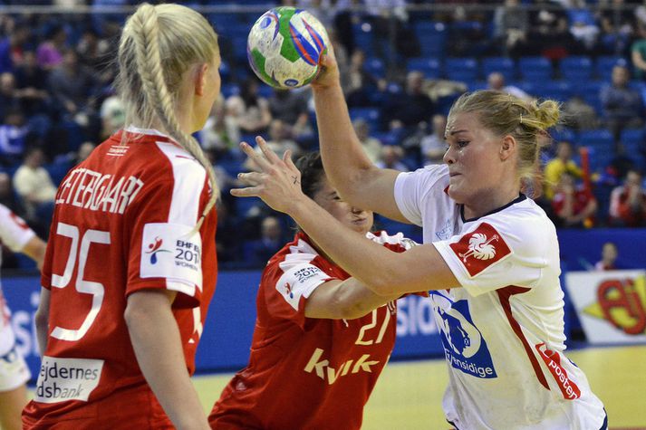 Þórir Hergeirsson og stelpurnar hans í norska kvennalandsliðinu koma með fullt hús inn í milliriðilinn á EM í handbolta eftir 27-21 sigur á Danmörku í lokaumferð riðlakeppninnar í gær. Danir unnu brons á HM í fyrra og ætluðu sér stóra hluti á EM. Liðið fer hinsvegar bara með eitt stig inn í milliriðilinn eða þremur stigum minna en bæði Spánn og Noregur og það verður því mjög erfitt fyrir þær dönsku að komast í undanúrslitin. Blaðamaður danska blaðsins Ekstra Bladet er bjartsýnn fyrir hönd Þóris og leikmanna hans í norska kvennalandsliðinu og telur að þarna sé eitt sigurstranglegasta lið keppninnar á ferðinni. Hann nefnir sérstaklega drápseðli liðsins sem hann telur að Norðmenn hafi varðveitt frá gömlu góðu hvaladögunum. „Þær keyra hnífanna í andstæðinginn þegar hann er að berjast við að ná andanum og hefur misst vonina," skrifar blaðamaður Ekstra Bladet í grein sinni um leikinn. Norsku stelpurnar keyrðu hreinlega yfir þær dönsku í seinni hálfleiknum sem Noregur vann 15-8. Danska liðið var 13-10 yfir í leiknum þegar rúmar tvær mínútur voru til hálfleiks en norska liðið vann hinsvegar næstu 27 mínútur 14-5 og gerði út um leikinn.Vísir/AP