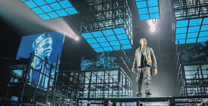„Leyfið mér að vera stórkostlegur…mér líður eins og Cassius Clay,“ ómar í hljóðkerfinu eftir að ljósin slökkna. Svart myrkrið verður skyndilega fórnarlamb ljósasýningar á sviðinu. Hinn 44 ára gamli Jay-Z gengur inn á sviðið svartklæddur með derhúfu og gullkeðju. Lagið You Don‘t Know hefur aldrei hljómað svona vel. Í textanum er Jay-Z að láta hlustendur vita hversu merkilegur hann er. „Þið eruð að horfa á 40 milljóna manninn,“ segir hann og vísar til þess hversu margar plötur hann hefur selt. Lagið kom út árið 2001 og textinn er í raun úreltur. Nú hefur Jay-Z selt 75 milljón plötur, fengið 17 Grammy-verðlaun og er af mörgum talinn besti rappari heims. Hann lýgur því ekki þegar hann kallar yfir áhorfendur, í lok lagsins:Timbaland stóð sig frábærlega á tónleikunum, var algjörlega magnaður.„Ég mun aldrei tapa" Jay-Z er sannkallaður sigurvegari. Enginn verður óbarinn biskup; Útistöðurnar sem hann hefur lent í eru ófáar. Nas, Mobb Deep og fleiri listamenn hafa orðið fyrir barðinu á Jay-Z á leið hans á toppinn. Þegar hann gengur léttur á fæti um sviðið má merkja sjálfstraust í hverju skrefi. Hann snýr sér að áhorfendum og býr til merki plötufyrirtæki síns, Roc-A-Fella Records með höndunum. Áhorfendur gera slíkt hið sama, allir dansandi í takt. Jay-Z fer úr jakkanum sínum. Undir honum er bolur merktur hönnuðinum Tom Ford. Hann kynnir hinn geysivinsæla Timbaland til leiks. Þeir hafa unnið saman fjölda laga. Þeir unnu fyrst saman árið 1998 og eru enn að. Jay-Z heldur áfram að skemmta áhorfendum. Hann tekur lög af nýjustu plötu sinni, Magna Carta, Holy Grail. Hún hefur farið sigurför um heiminn en verður fyrst og fremst minnst fyrir viðskiptahæfileika Jay-Z. Hann seldi Samsung eiua milljón eintaka áður en platan kom út, hún fylgdi með ákveðnum gerðum af Samsung snjallsímum. Þetta er eitt dæmið um hversu snöggur Jay-Z er að aðlagast breyttum aðstæðum á markaðinum.Jay-Z og Beyoncé eru sannarlega magnað par og eiga saman dótturina Blue Ivy.„Blue bað mig að minna ykkur á að ég er maðurinn" Líf Jay-Z, sem heitir réttu nafni Sean Carter, breyttist þegar hann eignaðist barn með söngkonunni Beyoncé. Dóttirin var skírð Blue Ivy Carter og hafa margir keppst við að reyna að ráða í merkingu nafnsins. Talið er að nafnið Blue komi úr titli Blueprint sem er af mörgum talin besta plata Jay-Z. Millinafnið Ivy er svo talið tengjast tölunni fjórum, en eins og margir vita er IV í rómverska talnakerfinu 4. Fyrstu tveir stafirnir í millinafninu virðast því hafa ráðið nafninu. Talan fjórir er gríðarlega merkileg í lífi Beyoncé, hún á sjálf afmæli 4. september og móðir hennar 4. janúar. Hún segir þetta vera sína uppáhaldstölu. Jay-Z fjallar um lífið eftir fæðinguna í laginu Holy Grail og ómar söngur Justins Timberlake um salinn og tuttugu þúsund manns taka undir. Hann er þó ekki á staðnum. En stuttu seinna röltir leynigestur á sviðið. Allt tryllist. Skyrtan óhneppt Rick Ross mætti óvænt á sviðið, með skyrtuna flakandi frá.„Þið vitið að ég er með þetta" Rapparinn Rick Ross geltir í hljóðnemann og gengur rólega inn á sviðið. Þessi íturvaxni rappari er með skyrtuna óhneppta; óhræddur við að sýna vömbina, gullkeðjurnar og húðflúrin. Með sólgleraugu og svægi. Fagnaðarlætin eru gríðarleg, enda tónleikarnir nálægt heimaslóðum Rick Ross sem slegið hefur í gegn og hefur unnið með stærstu listamönnum heims, eins og Lady Gaga. Félagarnir hafa unnið mikið saman undanfarið, eru nýbúnir að ljúka við sitt sjötta lag. Þeir taka lagið umdeilda FuckWithMeYouKnowIgot it. Langur titillinn vísar til viðlagsins sem Rick Ross rappar af sinni alkunnu taktfestu. Samstarf þeirra Jay-Z endurspeglar viðskiptavit hins síðarnefnda. Hann er duglegur að vinna með listamönnum sem eru á uppleið og hefur þannig náð að viðhalda sínum eigin vinsældum og ná til nýrra og yngri markhópa. Kanye West, Pharrell Williams og Drake eru meðal listamanna sem Jay-Z hefur unnið með. Menn sem hafa náð langt. Hann tekur síðan lagið N*ggas in Paris, sem hann gerði einmitt með Kanye West. Hann biður áhorfendur um að standa uppi á sætum sínum. Hann segist hafa fengið sekt fyrir að hvetja fólk til þess annars staðar, en honum sé sama. Hann vilji að fólkið skemmti sér. Magna Carta, Holy Grail kom út árið 2013 og seldi Jay-Z fimm milljónir eintaka áður en hún kom út til Samsung.„Látnir forsetar endurspegla mig" Jay-Z fer hratt yfir sögu á tónleikum, tekur það besta úr mörgum lögum sínum. Að syrpunni lokinni róar hann salinn og tekur gamlan slagara, Dead Presidents. Í viðlaginu óma orðin „látnir forsetar endurspegla mig“. Látnir forsetar eru slangur yfir peningaseðla og vísar viðlagið því í gildismat Jay-Z. Lagið var eitt af þeim vinsælli á fyrstu plötu hans, Reasonable Doubt, sem kom út árið 1996, fyrir um 18 árum. Jay-Z hefur verið lengur að. Á annarri erminni á bolnum hans eru rómversku tölurnar XXV sem vísa líklega til þess að um 25 ár eru liðin frá árinu 1988, sem Jay-Z hefur nefnt í textum sínum sem mikilvægt ár í hans lífi, en þá segist hann hafa verið að selja eiturlyf. Vinsamlegast fylgið leiðtoga ykkar Jay-Z skeiðar um sviðið, frár á fæti. Í raun er ótrúlegt að hann hafi gert þetta í um tvo áratugi. Hann tekur helstu lögin af löngum ferli sínum og tvinnar saman þau og lögin af nýjustu plötunni. Inni á milli fá tónlistarmennirnir sem spila undir að sýna sig. Timbaland tekur syrpu af sínum bestu lögum og trommarinn frægi Tony Royster Jr tekur hreinlega magnað trommusóló sem endar með því að hann kastar kjuðunum frá sér og trommar með hnefunum. Hann hefur verið frægur frá barnsaldri og þykir með þe