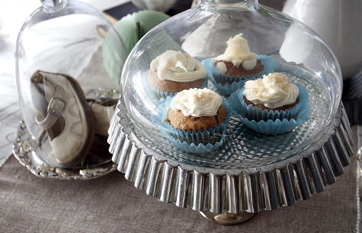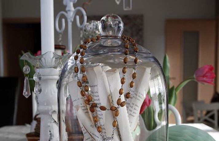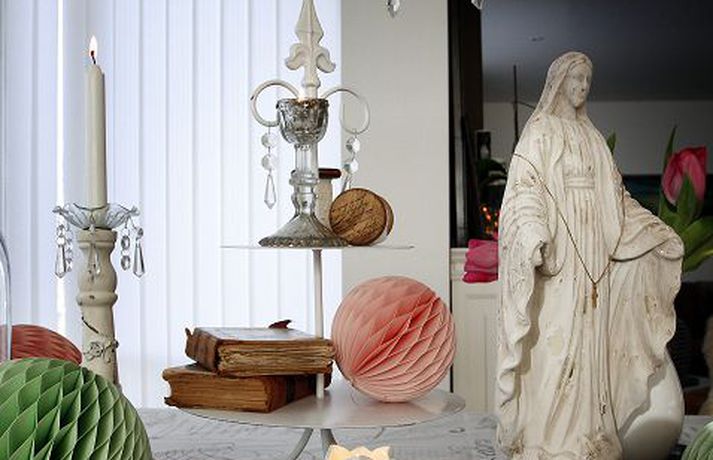 Mig langaði til að stíga frá þessu hefðbundna bleika og bláa þema sem oft er ríkjandi í fermingarskreytingum en blanda frekar saman, nýta gamalt og skreyta borðið með hlutum sem tengjast fermingarbarninu,“ útskýrir Soffía Dögg Garðarsdóttir blómaskreytir en hún heldur úti síðunni Skreytum hús. Til að gera veisluborðið persónulegt stingur Soffía upp á að safna saman ólíkum kertastjökum frá ættingjum og vinum og hvítu leirtaui. Til að fá hækkun á borðið segir Soffía sniðugt að raða upp bókum eða nota fallega kassa. „Í þessu tilfelli notaði ég tveggja hæða disk. Á borðið notaði ég síðan dúk með vintage script-munstri og pappírskúlur sem ég fékk í Púkó og Smart. Undir glerkúpla setti ég gamla barnaskó og upprúlluð bókarblöð og hengdi talnaband með krossi yfir. Maríustyttan er trúartákn og fallegt að nota á fermingarborð.“ Á síðunni www.skreytumhus.is má forvitnast nánar um skreytingar Soffíu Daggar.