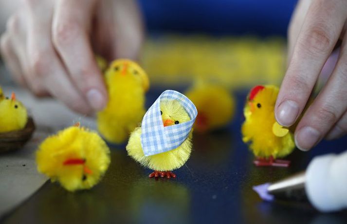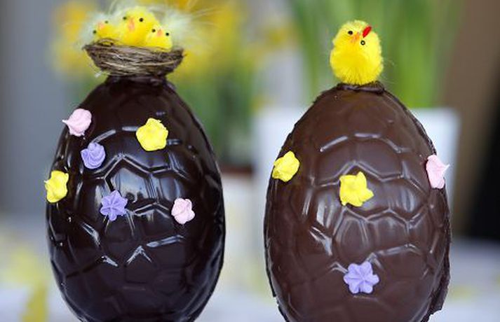 Í stærri eggin þarf um það bil 300 g af súkkulaði en 150 g í minni eggin. Þægilegast og fljótlegast er að nota súkkulaðihjúp en hjúpinn þarf bara að hita og hella svo í mótin. Ég notaði hjúp frá Nóa Síríusi. Ef notað er venjulegt súkkulaði þarf að tempra það og nota hitamæli til að fylgjast með. Þá skal bræða ¾ af súkkulaðinu yfir vatnsbaði upp í 42 gráður. Taka súkkulaðið þá af vatnsbaðinu og bæta þeim ¼ sem eftir er út í. Þá lækkar hitastigið niður í 32 gráður. Með þessari aðferð á eggið að verða gljáandi og fallegt. Stóru mótin skal fylla að 1/3 . Velta mótinu svo til og frá en gott er að standa úti ef það er hægt, þá gengur það hraðar. Þegar súkkulaðið hættir að renna til er gott að setja það í frysti í 15 til 20 mínútur. Litlu mótin má fylla alveg. Sniðugt er að blanda lakkrískurli í súkkulaðið en þá er gott að setja minna en í mótið. Velta því svo til og kæla og setja svo aðra umferð af súkkulaði, blönduðu lakkrískurlinu. Til að festa skeljarnar saman er bráðnu súkkulaði smurt á jaðrana og skeljarnar svo lagðar saman meðan þær eru enn í mótinu. Áður er sniðugt að setja nammi og málshátt í aðra skelina. Sett inn í frysti í 15 mínútur. Eggið losað úr mótinu og kantarnir snyrtir með hníf. Gott er að vera í bómullarhönskum við að handleika eggið svo að ekki komi fingraför. Fóturinn er steyptur á sama hátt og eggið og eggið svo að lokum fest á fótinn með bráðnu súkkulaði. Við skreyttum eggin með toppum úr blöndu úr 1 msk. af „marengs powder“, 2 msk. af volgu vatn og 1¼ bolla af flórsykri sem hrært er saman, skipt í skálar og litað með matarlit. Sprautað á plötu og þarf að harðna í tvo tíma. Mótin og fleira skraut fékk ég í Allt í köku. Páskaungana fékk ég í Blómavali.