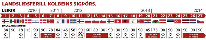 Kolbeinn Sigþórsson hefur ekki skorað í 283 mínútur með íslenska landsliðinu og eftir ótrúlegt markaskor hans í landsliðsbúningnum undanfarin ár er þetta eitthvað sem stuðningsmenn íslenska landsliðsins eiga ekki að venjast.Íslenska þjóðin er vön góðu Íslenska þjóðin hefur heldur betur vanist góðu frá aðalmarkaskorara sínum undanfarin ár sem var, fyrir þessa markaþurrð, búinn að skora í 15 af 24 landsleikjum sínum. Heimsklassatölfræði Kolbeins hefur kallað á meiri kröfur og um leið áhyggjur yfir markaleysinu nú. Kolbeinn hefur aðeins einu sinni þurft að bíða lengur eftir marki með landsliðinu en hann skoraði ekki í 304 mínútur eftir að hann kom til baka eftir axlaraðgerð í ársbyrjun 2013. Umrótið í kringum Kolbein hjá félagsliði hans Ajax er ekki að hjálpa til og margir bíða eftir því að hann komist að hjá liði sem spilar meira upp á styrkleika hans. Íslenska landsliðið náði ekki að halda áfram sigurgöngu sinni í Tékklandi um helgina og fyrsta tapið er staðreynd. Íslenska liðið fékk vissulega færi til að ná í stig en Kolbeinn var meira í því að hjálpa til að búa til færi fyrir félagana en komast í færin sjálfur.Sextánda markið gegn Tyrkjum Kolbeinn skoraði sitt sextánda landsliðsmark í sigrinum á Tyrkjum í fyrsta leik undankeppninnar en hann var þá að spila sinn 24. landsleik. Kolbein vantar aðeins eitt mark til að jafna Ríkharð Jónsson, annan markahæsta leikmann íslenska landsliðsins frá upphafi. Hér fyrir neðan má sjá yfirlit yfir landsliðsferil Kolbeins og magnað markaskor hans í landsliðsbúningnum.Á undan Eiði í leikjum og árum Eiður Smári á metið en hann hefur átta marka forskot á Kolbein, Eiður Smári jafnaði met Ríkharðs í sínum 41. leik (28 ára gamall) og bætti það sjö leikjum síðar (29 ára gamall). Kolbeinn er enn bara 24 ára gamall og ekki búinn að spila nema 27 landsleiki. Metið hans Eiðs Smára er því enn í stórhættu. Kolbeinn þurfti að bíða eftir landsliðsmarki í 304 mínútur fyrri hluta árs 2013 en þegar markastíflan brast skoraði hann í fimm landsleikjum í röð og setti nýtt met. Sú markaveisla endaði ekki fyrr en hann meiddist illa á ökkla í fyrri hálfleik í fyrri umspilsleiknum við Króata.Brestur stíflan á næsta ári? Það er lífsnauðsynlegt fyrir íslenska landsliðið að koma Kolbeini aftur í gang á næsta ári þegar seinni hluti undankeppninnar fer fram og það mun reyna á íslenska landsliðið við að tryggja sér sæti á stórmóti í fyrsta sinn. Bresti stíflan með sama hætti og síðast ætti íslenska landsliðið hins vegar að vera í góðum málum á árinu 2015.Vísir/AntonGrafík/Garðar Kjartansson.
