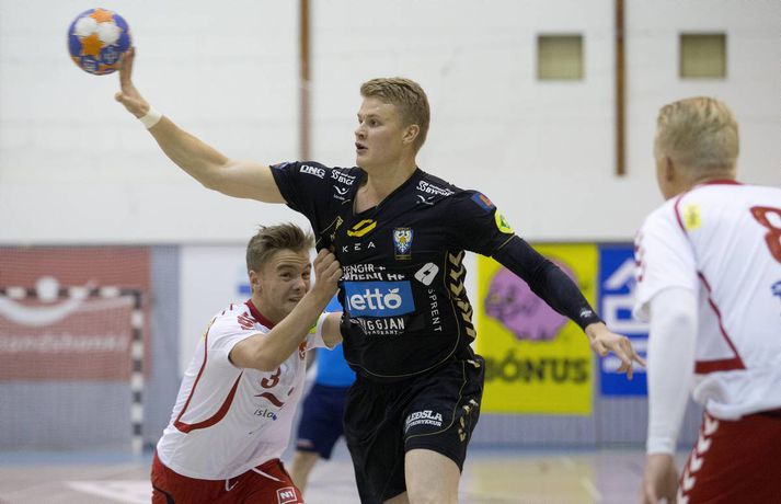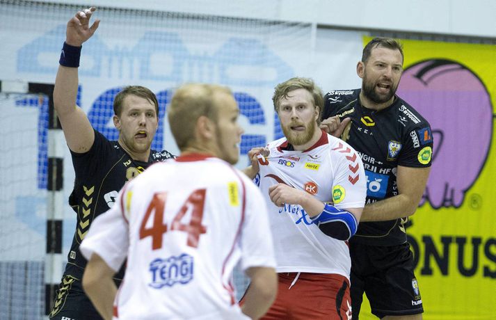 Akureyri, með Peking-tvíeykið Sverre Jakobsson og IngimundIngimundarson í hjarta varnarinnar, vann HK, 25-21, í fyrstu umferð Olís-deildar karla í handbolta.Kristján Orri Jóhannsson var markahæstur hjá Akureyri með sjö mörk, en Guðni Már Kristinsson, sem kom til HK frá ÍR, skoraði mest fyrir heimamenn eða átta mörk. Fram lagði Hauka, 22-21, í æsispennandi leik í Safamýri þar sem GarðarSigurjónsson skoraði fimm mörk fyrir Fram líkt og hinn bráðefnilegi ÓlafurÆgirÓlafsson. ÁrniSteinnSteinþórsson skoraði níu mörk fyrir Hauka. Þá vann Afturelding sigur á Stjörnunni, 29-22, í nýliðaslagnum í Mosfellsbænum og ÍR og Valur skildu jöfn í Austurbergi.Fram - Haukar 22-21 (12-12)Mörk Fram: Garðar Sigurjónsson 5/3, Ólafur Ægir Ólafsson 5, Sigurður Örn Þorsteinsson 3, Stefán Baldvin Stefánsson 3, Ragnar Þór Kjartansson 2/2, Þröstur Bjarkason 2, Ólafur Jóhann Magnússon 1, Stefán Darri Þórsson 1.Mörk Hauka: Árni Steinn Steinþórsson 9/4, Adam Haukur Baumruk 3/2, Heimir Óli Heimisson 2, Leonharð Harðarson 2, Vilhjálmur Hauksson 2, Einar Pétur Pétursson 1, Jón Þorbjörn Jóhannsson 1, Tjörvi Þorgeirsson 1.Afturelding - Stjarnan 29-22 (14-10)Mörk Aftureldingar: Birkir Benediktsson 6, Jóhann Jóhansson 6, Gunnar Malmquist 4, Árni Bragi Eyjólfsson 4, Kristinn Elísberg Bjarkason 3, Böðvar Páll Ásgeirsson 3, Pétur Júníusson 2, Ágúst Birgisson.Mörk Stjörnunnar: Ari Magnús Þorgeirsson 5, Andri Hjartar Grétarsson 4, Egill Magnússon 3, Starri Friðriksson 2, Hrannar Bragi Eyjólfsson 2, Þórir Ólafsson 2, Víglundur Jarl Þórsson 2/1, Hjálmtýr Alfreðsson 1, Sverrir Eyjólfsson 1.ÍR - Valur 23-23Mörk ÍR: Björgvin Hólmgeirsson 7 (12), Sturla Ásgeirsson 6/2 (11/5), Arnar Birkir Hálfdánsson 3 (11), Jón Heiðar Gunnarsson 2 (2), Davíð Georgsson 2 (3), Bjarni Fritzson 2 (4/1), Eggert Sveinn Jóhannsson 1 (1), Ingi Rafn Róbertsson (1).Varin skot: Arnór Freyr Stefánsson 13/1, Svavar Már Ólafsson 2/1.Mörk Vals: Guðmundur Hólmar Helgason 6 (10), Finnur Ingi Stefánsson 5 (10/2), Vignir Stefánsson 3 (5), Kári Kristján Kristjánsson 2 (3), Elvar Friðriksson 2 (4), Alexander Örn Júlíusson 2 (5), Geir Guðmundsson 2 (6), Orri Freyr Gíslason 1 (1).Varin skot: Stephen Nielsen 22/4.HK - Akureyri 21-25 (9-13)Mörk HK: Guðni Már Kristinsson 8, Óðinn Þór Ríkharðsson 3, Leó Snær Pétursson 3, Þorgrímur Smári Ólafsson 2, Þorkell Magnússon 2, Tryggvi Þór Tryggvason 2, Aron Gauti Óskarsson 1.Mörk Akureyrar: Kristján Orri Jóhannsson 7, Brynjar Hólm Grétarsson 5, Elías Már Halldórsson 3, Þrándur Gíslason 3, Heiðar Þór Aðalsteinsson 2, Ingimundur Ingimundarson 2, Halldór Logi Árnason 1, Andri Snær Stefánsson 1, Sigþór Árni Heimisson 1.