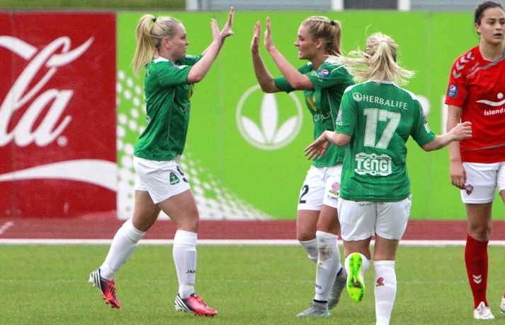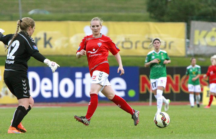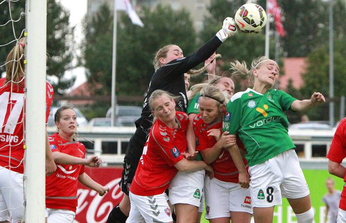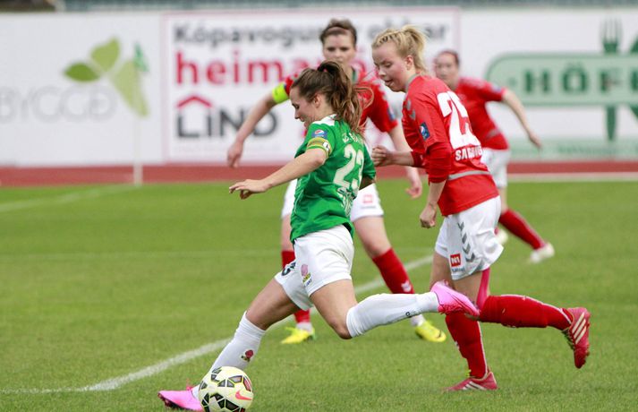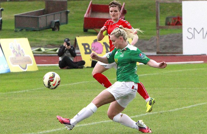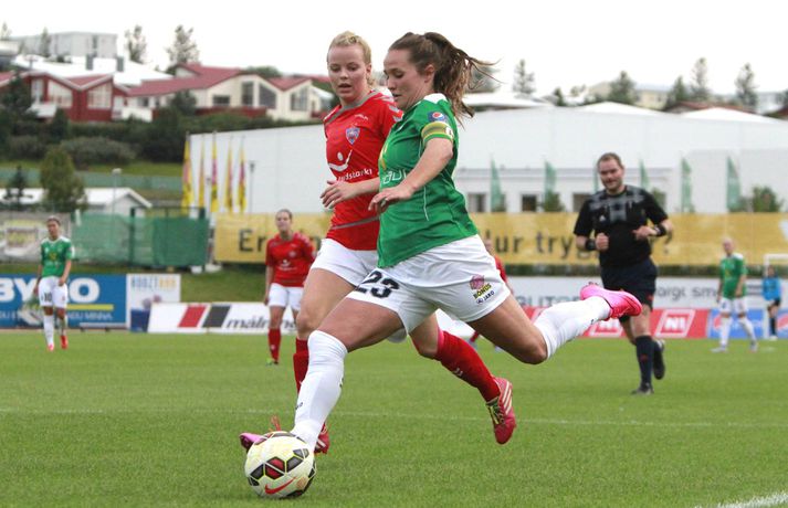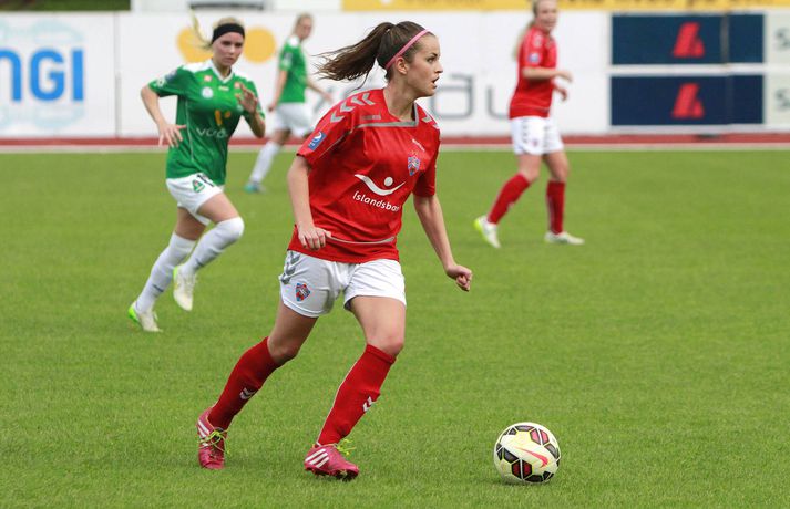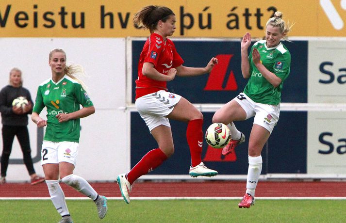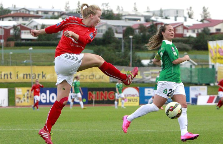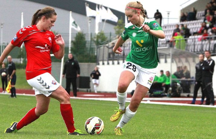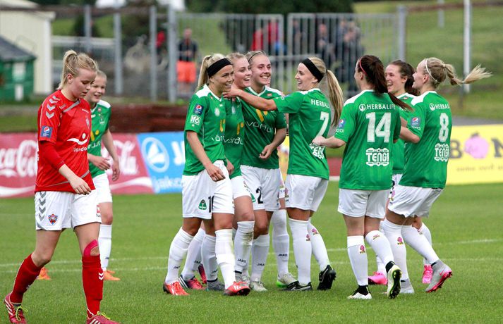 Breiðablik vann öruggan sigur á Val, 6-0, í 15. umferð Pepsi-deildar kvenna í kvöld. Sigurinn var aldrei í hættu en liðið náði samt sem áður ekki að tryggja sér Íslandsmeistaratitilinn með sigrinum. Stjarnan vann einnig sinn leik fyrir norðan.Andri Marinó Karlsson, ljósmyndari Vísis og Fréttablaðsins, var á leiknum í kvöld og náði þessum myndum hér fyrir ofan. Blikar hófu leikinn með miklum látum en Andrea Rán Snæfeld Hauksdóttir skoraði fyrsta mark leiksins eftir aðeins þriggja mínútna leik. Blikar náðu fínni fyrirgjöf fyrir mark Valsara og markið kom upp úr þeirri fyrirgjöf. Þórdís María Aikman, markvörður Vals, fór út í skelfilegt úthlaup, boltinn barst að lokum til Andreu, sem lagði boltann í autt markið. Mist Edvardsdóttir, leikmaður Vals, stóð ein eftir á marklínunni og gat lítið gert í málunum. Blikar réðu lögum og lofum út hálfleikinn og það eina sem sást frá Valsliðinu voru misheppnuð skot utan af velli. Heimastúlkur náðu að bæta við öðru marki á markamínútunni sjálfri, þeirri 43. þegar Fanndís Friðriksdóttir hamraði boltanum í netið rétt fyrir utan vítateig. Heimastúlkur byrjuðu síðari hálfleikinn á því að skora tvö mörk á stuttum tíma og staðan var orðin 4-0. Fanndís Friðriks skoraði þá sitt annað mark og Telma Hjaltalín skoraði einnig. Þegar hálftími var eftir af leiknum var hann í raun búinn. Fanndís átti eftir að skora sitt þriðja mark í leiknum og kom það rétt undir lok leiksins. Þá kórónaði hún frábæran leik sinn og lék sér einfaldlega að varnarmönnum Vals og innsiglaði þrennuna. Svava Rós Guðmundsdóttir innsiglaði magnaðan sigur Blika í kvöld og gerði sjötta mark þeirra í leiknum. Blikar unnu gríðarlega þægilegan sigur á Val í kvöld. Fleiri mörk voru ekki skoruð í leiknum. Breiðablik er einfaldlega með mikið betra lið. Blikar þurfa því einn sigur í viðbót til að tryggja sér titilinn. Fanndís: Þurfum að vera með hausinn rétt skrúfaðan á„Þrátt fyrir að það hafi verið 2-0 fyrir okkur í hálfleik, þá vorum við ekkert að spila frábærlega vel,“ segir Fanndís Friðriksdóttir, markaskorari Blika, eftir sigurinn. „En ef leikir fara 6-0 þá segir það manni að hann var ekkert svo erfiður. Við nálguðumst þennan leik bara eins og alla aðra og ætluðum að fara í hann eins og alla aðra, með það hugafar að vinna.“ Fanndís segir að núna sé mjög mikilvægt að hafa hausinn rétt skrúfaðan á.+ „Ef það er ekki þannig, þá getur þetta farið illa. Við þurfum að stilla spennustigið og gíra okkur upp í það að klára þetta almennilega.“ Ólafur: Ekki svona mikill gæðamunur á þessum liðum„Ég get ekki viðurkennt að gæðamunurinn sé svona mikill á liðunum,“ segir Ólafur Tryggvi Brynjólfsson, þjálfari Vals, eftir leikinn í kvöld. „Við vorum með ákveðið leikskipulag inn í leikinn, en fáum á okkur mark strax í upphafi. Eftir það var þetta erfitt en við náðum að vinna okkur aftur inn í leikinn.“ Hann segir að með smá meiri gæðum hjá hans leikmönnum hefði liðið getað opnað vörn Blika betur. „Við ætluðum síðan bara að halda áfram í síðari hálfleiknum en þegar leið á hann fór að bera á óþolinmæði hjá mínum leikmönnum. Þá fóru menn að fara úr stöðu og svona og þá opnast fyrir þessa hröðu framherja Breiðabliks.“ Ólafur segir að það sé enginn möguleiki á því að titillinn fari eitthvað annað en til Blika í ár. „Þær fengu þrjá sigurvegara frá Val fyrir tímabilið, stelpur sem kunna að vinna og það hjálpar liðinu gríðarlega.“vísir/getty