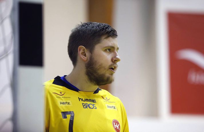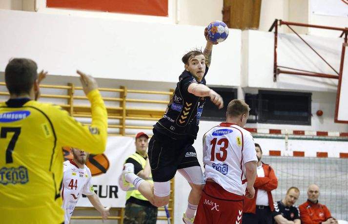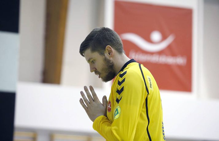 Umfjöllun, viðtöl og myndir: HK - Akureyri 22-22 | HK enn á lífi Dagur Sveinn Dagbjartsson skrifar 15. mars 2015 15:15 Lárus bjargaði HK í dag. vísir/stefán HK og Akureyri skildu jöfn í hörku spennandi leik í dag, 22-22. Leikurinn var ekki mikið fyrir augað en þó var gaman að sjá baráttuna í heimamönnum, sem náðu að knýja fram jafntefli á æsilegri lokamínútu. Lárus Helgi Ólafsson varði þá vítakast á sama tíma og lokaflautan gall. Byrjun leiksins fer seint í sögubækurnar fyrir góðan handbolta. Báðum liðum gekk ævintýralega illa að skora og gerðu sig sek um ótal mistök. Staðan eftir 10 mínútur var 2-1 fyrir Akureyri og mikil deyfð yfir leiknum. Það lifnaði þó yfir þessu og Akureyri virtist ætla að stinga af, náðu mest fimm marka forystu, 10-5, þegar sjö mínútur lifðu af fyrri hálfleik. HK var þó ekki af baki dottið og náði að minka muninn. Staðan í hálfleik var 12-10 fyrir Akureyri og enn gat allt gerst. Það var allt annað að sjá heimamenn í síðari hálfleik. Þeir byrjuðu af miklum krafti og náðu forystu í fyrsta sinn í leiknum eftir 10 mínútur í síðari hálfleik, 17-16. HK tók Sigþór Heimisson úr umferð og við það riðlaðist sóknarleikur Akureyrarliðsins og gestirnir gerðu sig seka um klaufaleg mistök trekk í trekk. Leikurinn var jafn og spennandi allt til enda. Akureyri fékk gullið tækifæri til að tryggja sér sigur þegar dæmt var vítakast á HK á sama tíma og leiktíminn rann út. Kristján Orri Jóhannsson tók vítakastið en Lárus Helgi Ólafsson, besti leikmaður HK, gerði sér lítið fyrir og varði vítakastið. Lokatölur urðu 22-22. Markverðir beggja liða áttu ágætisleik í dag. Tomas Olason er öflugur markvörður og nýtur góðs af því að hafa Sverre og Ingimund fyrir framan sig. Með þessa tvo turna í miðri vörn og Tomas í stuðu fyrir aftan þá, geta öll lið lent í erfiðleikum. Sóknarleikur Akureyrarliðsins er hins vegar vandamálið. Í þessum leik var það helst Sigþór Heimisson sem bar sóknarleik Akureyrar uppi. Hann er klókur leikmaður en Akureyri þarf fleiri vopn í sóknarleikinn til að taka næsta skref. HK á ennþá tölfræðilega möguleika á að halda sæti sínu í deildinni. Með fjóra leiki eftir er liðið 8 stigum á eftir Stjörnunni sem situr í 8. sæti. Sú von er hins vegar veik en á meðan enn sést í ljós við enda gangnanna hljóta HK-ingar að leggja allt í sölurnar. Ég tek hattinn ofan fyrir HK að hafa barist eins og ljón í þeirri stöðu sem liðið er í og var komið í í þessum leik. Næsti leikurinn liðsins er gegn Aftureldingu í Mosfellsbæ á fimmtudaginn, en þar vann HK þriggja marka sigur í október, 25-22.Lárus Helgi Ólafsson: Hefði viljað að þessi varsla hefði tryggt sigur Lárus Helgi Ólafsson markvörður var besti leikmaður HK í leiknum og var ánægður með að hafa tryggt sínu liði eitt stig í dag. Hann varði vítakast Akureyrar um leið og lokaflautan gall. "Mér leist nú ekkert á þetta þarna í lokinn en allt er gott sem endar vel. Ég hefði viljað að þessi varsla hefði tryggt sigur en ég er mjög ánægður að við náðum allavega einu stigi. Við byrjuðum hægt en um miðjan seinni hálfleik komumst við yfir. En okkur tekst eitthvað voðalega illa upp einum fleiri í leikjum. En við fengum séns á að komast aftur inní leikinn og gripum það tækifæri," sagði Lárus Helgi í samtali við Vísi. "Við erum voðalega lítið að líta á töfluna. Við einbeitum okkur bara að því að hafa gaman og spila handbolta. Næsti leikur er gegn Aftureldingu í Mosó. Við unnum þá í október og það er held ég einn skemmtilegasti leikur sem við allir höfum spilað. Við hlökkum bara til að mæta aftur þangað," sagði Lárus Helgi að lokum, aðspurður um möguleika liðsins um að halda sæti sínu í deildinni.Bjarki Sigurðsson: Byrjunin feldi okkur "Bæði lið gerðu mörg mistök og þetta var hægur handbolti. Jafntefli er niðurstaðan og við erum ágætlega sáttir við það. Byrjunin fellir okkur smávegis. Við skorum eitt mark á fyrstu 12 mínútunum eða svo. Það er ekki boðlegt. En varnarlega vorum við flottir og Lalli var flottur í markinu. Sóknarleikur gekk ágætlega þegar við létum boltann ganga og vorum hreifanlegir," sagði Bjarki Sigurðsson, þjálfari HK, að leik loknum. "Við erum bara að reyna að njóta þess að spila handbolta og sjá hvað það skilar okkur mörgum stigum. Við erum farnir að horfa fram á við, fram á næsta ár og hvað við getum gert. Hvernig við ætlum að halda í hópinn. Við erum búnir að vera óheppnir með meiðsli í vetur. Og svo þegar við fáum allan hópinn saman fyrir tveimur vikum, þá sér maður strax bætingu hjá liðinu. Ég hefði viljað hafa það svoleiðis frá upphafi. En það er ekkert hægt að segja við því núna. Við sjáum hver niðurstaðan verður," sagði Bjarki.Sverre Jakobsson: Við héldum að þetta myndi bara koma, næsti maður myndi redda þessu fyrir okkur Sverre Jakobsson, leikmaður Akureyrar, var fremur daufur eftir leikinn og alls ekki sáttur við spilamennsku sinna manna. "Mér fannst við byrja illa og það var erfitt að finna taktinn. Svo fórum við í gang en aftur fórum við af sporinu. Og þeir gengu á lagið. Eftir það vorum við að strögla, gerðum of mikið af tæknifeilum, vorum andlausir og hreinlega ekki tilbúnir. Ég vil alls ekki taka neitt af HK-ingum, þeir börðust allan tímann og voru til fyrirmyndar. En mér fannst við eiga að geta tekið bæði stigin hér í dag," sagði Sverre. "Ég er mest svekktur með að mér fannst toppstykkið ekki vera í lagi hjá okkur sem lið í dag. Bar keim að því að við héldum að þetta myndi bara koma, næsti maður myndi redda þessu fyrir okkur. Það er leiðinlegt," sagði svekktur Sverre. "Við erum ekkert farnir a