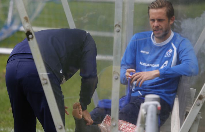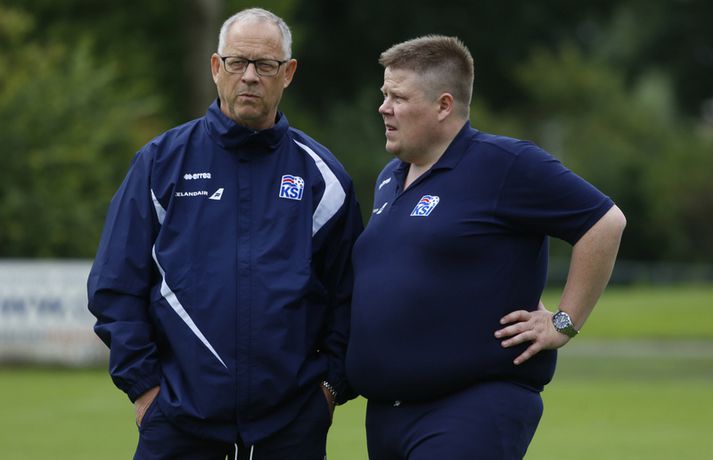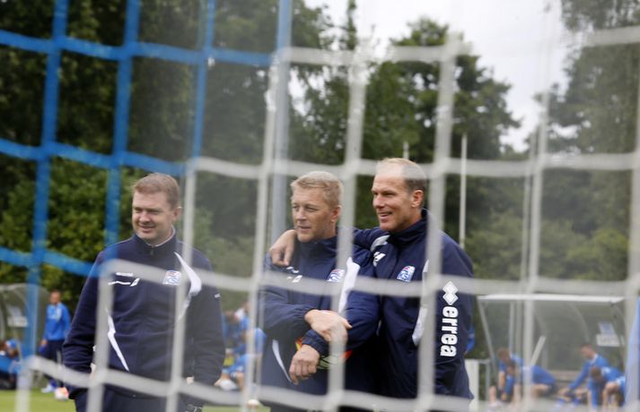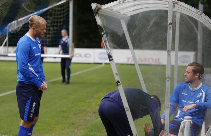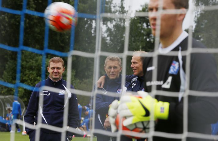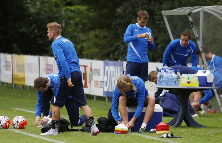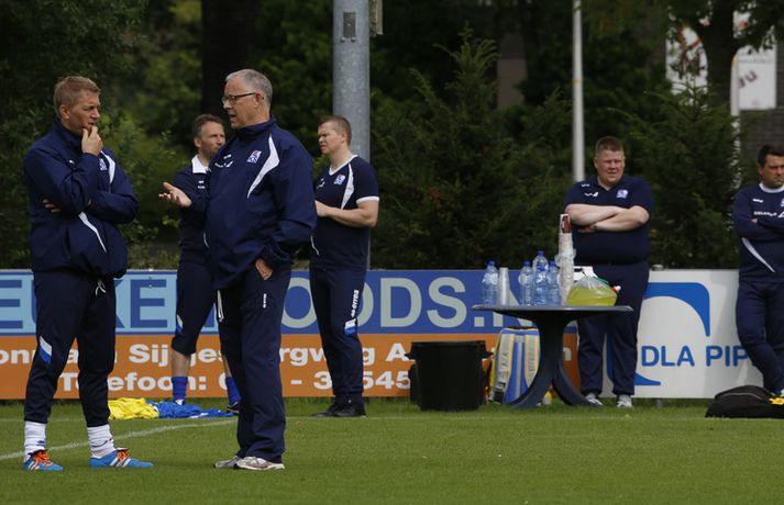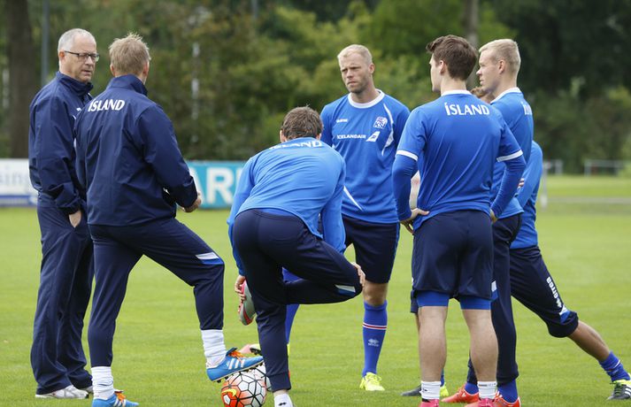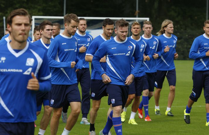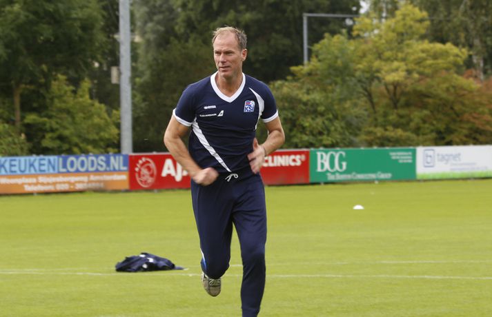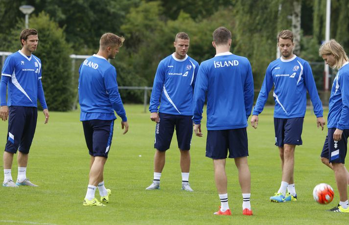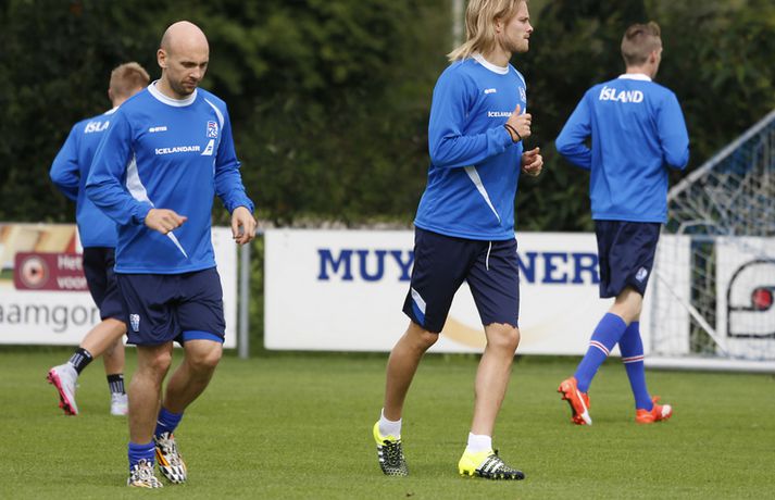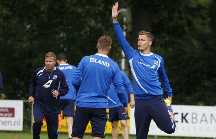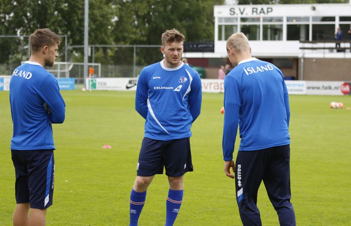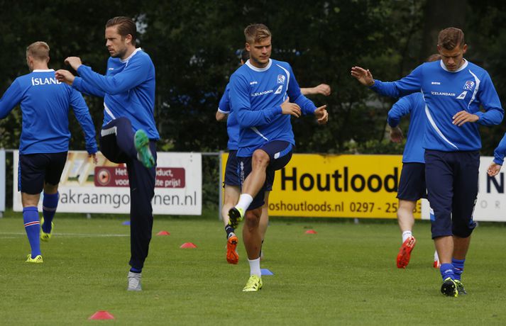 Íslenska landsliðið í fótbolta er komið á fulla ferð í undirbúningi sínum fyrir leikinn við Holland í undankeppni EM á fimmtudaginn. Íslenska liðið tók sína aðra æfingu á æfingasvæði SV Rap sem er í um tíu mínútna fjarlægð frá hóteli íslenska liðsins. Blaðamann fengu að fylgjast með byrjun æfingarinnar og gátu þá séð að allir leikmenn tóku fullan þátt í æfingunni. Þeir sem komu seinna í gær eða voru að spila á sunnudaginn voru núna klárir í alvöru æfingu og það var vel tekið á því á æfingunni. Valgarður Gíslason, ljósmyndari Vísis og Fréttablaðsins, var með myndavélina á lofti og tók þessar myndir hér fyrir ofan og neðan.Rúrik Gíslason, fyrir miðju, mætti til Amsterdam rétt fyrir æfinguna í gær. Ólafur Ingi Skúlason mætti þó síðastur allra enda um neyðarútkall að ræða í ljósi meiðsla Emils Hallfreðssonar.Vísir/ValliJóhann Berg, Aron Einar og Kolbeinn Sigþórsson hafa allir spilað með hollenskum félagsliðum.Vísir/ValliStrákarnir héldu boltanum á lofti í upphafi æfingar á meðan fjölmiðlamenn fengu að fylgjast með.Vísir/ValliGunnar Gylfason, Heimir Hallgrímsson og Þorgrímur Þráinsson voru hressir í upphafi æfingar.Vísir/ValliVísir/ValliEiður Smári Guðjohnsen og Gylfi Þór Sigurðsson talast við fyrir æfinguna í dag.Vísir/ValliVísir/ValliAlfreð Finnbogason kann vel við sig í Hollandi þar sem hann varð markakóngur með Heerenveen tímabilið 2013-2014. Hér heilsar hann að höfðingjasið.Vísir/Valli
