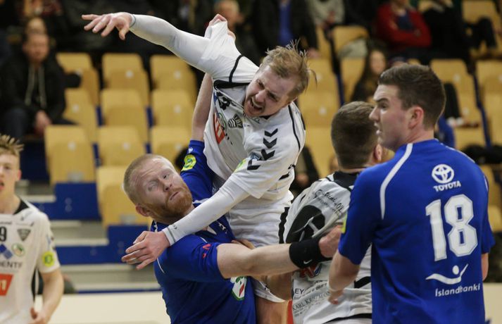 Stjarnan vann gríðarlega mikilvægan sigur, 28-26, á ÍBV í Olís-deild karla í handbolta í kvöld. Með sigrinum jöfnuðu Garðbæingar Fram að stigum en Safamýrarpiltar halda 8. sætinu sökum betri árangurs í innbyrðisviðureignum liðanna.Vilhelm Gunnarsson, ljósmyndari 365, var á vellinum í kvöld og tók meðfylgjandi myndir. Sigurður Ingiberg Ólafsson átti hvað stærstan þátt í sigri Stjörnunnar í kvöld en hann varði 25 skot í markinu og var með skyttur Eyjaliðsins, og þá sérstaklega Einar Sverrisson,í vasanum allan tímann. Frábær frammistaða. Stjörnumenn voru sterkari aðilinn í fyrri hálfleik og leiddu að honum loknum með þremur mörkum, 14-11. Sigurður byrjaði leikinn í fantaformi í marki Stjörnunnar og hélt hreinu fram á 10. mínútu. Stjörnumenn gerðu hins vegar aðeins tvö mörk á þessum tíma og hefðu með meiri skynsemi og aga í sóknarleiknum haft betri forystu. Hrannar Bragi Eyjólfsson, sem byrjaði inn á í stöðu leikstjórnanda, tapaði boltanum til að mynda fjórum sinnum á fyrstu 15 mínútum leiksins. Stjörnumenn leiddu með þremur mörkum, 7-4, um miðjan fyrri hálfleik. Þá fékk Vilhjálmur Halldórsson tveggja mínútna brottvísun og það nýttu gestirnir sér, skoruðu fjögur mörk gegn einu heimamanna og jöfnuðu metin í 8-8. Í stöðunni 10-9 fyrir Stjörnuna var Grétari Þór Eyþórssyni vikið af velli. Garðbæingar spiluðu vel í yfirtölunni og komust fjórum mörkum yfir, 13-9, eftir að Hilmar Pálsson, sem tók Agnar Smára Jónsson úr umferð allan leikinn, stal boltanum og skoraði úr hraðaupphlaupi. Stjörnumenn leiddu sem fyrr sagði með þremur mörkum í hálfleik, 14-11, og þeir byrjuðu seinni hálfleikinn vel, skoruðu tvö fyrstu mörk hans og náðu fimm marka forskoti, 16-11. Garðbæingar spiluðu ljómandi vel fyrstu 20 mínútur seinni hálfleiks og náðu mest sex marka forystu, 22-16. Egill Magnússon var frábær í seinni hálfleik, skoraði sjö mörk, tók af skarið á réttum augnablikum og deildi auk þess út stoðsendingum á félaga sína. Sverrir Eyjólfsson var einn þeirra sem naut góðs af því en hann var öflugur á línunni í kvöld og skoraði sjö mörk. En það er stutt í vitleysuna hjá Stjörnunni og þeir hleyptu Eyjamönnum inn í leikinn með afar óskynsömum leik á lokamínútunum. Gestirnir runnu á lyktina og færðust alltaf nær og nær. Þeir skoruðu fimm mörk gegn einu og minnkuðu muninn í eitt mark, 26-25. Nær komust þeir hins vegar ekki og Stjörnumenn fögnuðu mikilvægum sigri sem ætti að veita þeim byr undir báða vængi í baráttunni sem framundan er. Egill var þeirra markahæstur með átta mörk en Sverrir kom næstur með sjö mörk. Þá gerði Andri Hjartar Grétarsson fimm mörk úr vinstra horninu. Theodór Sigurbjörnsson, Andri Heimir Friðriksson og Agnar Smári Jónsson skoruðu fjögur mörk hver fyrir ÍBV sem er í 6. sæti deildarinnar.Egill: Annar leikurinn í vetur sem við spilum vel í 60 mínútur Egill Magnússon sýndi á sér sparihliðarnar þegar Stjarnan vann mikilvægan sigur á ÍBV í kvöld. Egill skoraði átta mörk, þar af sjö í seinni hálfleik. Stórskyttan unga átti auk þess fjölda stoðsendinga á félaga sína. Hann var að vonum sáttur eftir leik, en gerðu Stjörnumenn þetta ekki full spennandi undir lokin. "Jú, ég veit það samt ekki. Þeir minnkuðu muninn mest í eitt mark, held ég," sagði Egill sem var mjög ánægður með frammistöðu Stjörnuliðsins í kvöld. "Þetta var annar leikurinn í vetur þar sem við spilum vel í 60 mínútur. Við höfum alltaf klúðrað þessu á svona 10 mínútna köflum í leikjunum í vetur, en ekki núna. "Leikurinn var mjög góður og þá sérstaklega varnarlega. Við keyrðum hratt á þá og skoruðum mikið úr hraðaupphlaupum," sagði Egill sem hrósaði markverðinum Sigurði Ingiberg Ólafssyni fyrir hans þátt í sigri Stjörnunnar. "Hann tók mikilvæga bolta og var frábær sem og vörnin. Þegar vörnin er sterk er markvörðurinn oftast góður. Siggi fær hæstu einkunn fyrir þennan leik," sagði Egill að lokum.Gunnar: Hann var með okkur í vasanum Gunnar Magnússon, þjálfari ÍBV, sagði að slæm byrjun hafi orðið hans liði að falli gegn Stjörnunni í dag. "Við mættum ekki nógu klárir til leiks í kvöld," sagði Gunnar. "Eins og ég sagði við mína menn eru Stjörnumenn að berjast fyrir lífi sínu. Það er eitt að mæta liðum í 2. og 3. sæti, en annað að mæta botnliðunum á þessum tíma. Það er mjög erfitt. "Stjörnumenn voru miklu klárari og grimmari en við. Byrjunin var erfið og við náðum aldrei að hrista hana af okkur," sagði Gunnar sem var ekki sáttur með vandræðaganginn í sóknarleik ÍBV í kvöld, en Eyjamenn skoruðu sitt fyrsta mark ekki fyrr en á 10. mínútu. "Við vorum í vandræðum sóknarlega. Þetta var erfitt, útilínan var öll köld og við klikkuðum líka á góðum færum í hornunum og á línu. "Það verður samt að gefa Sigurði (Ingiberg Ólafssyni) kredit, hann var stórkostlegur í markinu hjá Stjörnunni. Hann var með skytturnar í vasanum og tók líka færi úr hornum og línu. Hann var gjörsamlega frábær," sagði Gunnar. Hann segir að Eyjamenn þurfi að bæta leik sinn á næstunni ef þeir ætla að gera einhverjar rósir í úrslitakeppninni í vor. "Við þurfum að vera betri en þetta. Ég var að vonast til að við værum komnir með meiri stöðugleika. Við erum frábærir einn daginn og alls ekki góðir hinn daginn. Við þurfum að ná upp meiri stöðugleika fyrir úrslitakeppnina," sagði Gunnar að lokumEgill Magnússon skoraði átta mörk fyrir Stjörnuna í kvöld.Vísir/Vilhelm