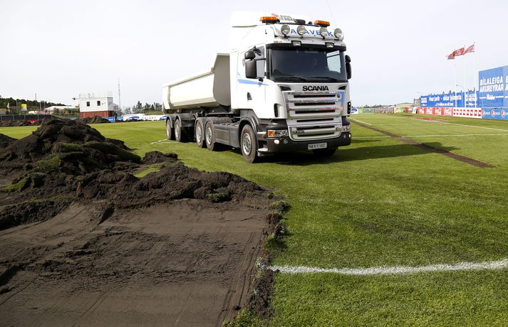 Framkvæmdir hafnar á Vodafone-vellinum | Myndir Kristinn Páll Teitsson skrifar 27. júlí 2015 19:30 Frá Vodafone-vellinum. Vísir/Andri Marinó Framkvæmdir hófust í dag á Vodafone-vellinum en ákveðið var fyrr á árinu að skipta út grasinu fyrir gervigras í ljósi þess að félagið átti inni gervigrasvöll frá Reykjavíkurborg vegna samnings við borgina um sölu lands sem var áður í eigu Vals. Ólafur Jóhannesson, þjálfari Valsmanna, sagði í viðtali við Borgunarmörkin að hann væri hlynntur breytingunni en leikmenn Vals léku síðustu leikina á grasinu í síðustu viku. Vann kvennalið Vals öruggan 3-1 sigur á KR en í karlaflokki töpuðu Valsmenn nokkuð óvænt 0-1 fyrir Víking á laugardaginn. Áætluð verklok eru 1. október næstkomandi og gæti því lokaleikur Vals í Pepsi-deild karla farið fram á vellinum en Valur tekur á móti Stjörnunni í lokaumferðinni. Fram að því munu karla- og kvennaliðin leika í Laugardalnum en Valur lék einmitt í Laugardalnum síðast þegar liðið varð Íslandsmeistari í karlaflokki árið 2007. Pepsi Max-deild karla Tengdar fréttir Óli Jó á von á gervigrasinu á Hlíðarenda í mánuðinum Valsmenn feta í fótspor Stjörnunnar og spila heimaleiki sína í efstu deild á gervigrasi. 6. júlí 2015 23:02 Síðasti heimaleikur Vals á náttúrúlegu grasi á laugardag Grasvöllurinn verður rifinn upp á mánudag og nýr gervigrasvöllur lagður á Vodafone-völlinn. 22. júlí 2015 11:00 Líklegt að Valur kveðji Hlíðarenda í ágúst Víkingsleikurinn í deildinni lok júlí verður spilaður á Vodafone-vellinum og líklega bikarleikurinn fái Valsmenn heimaleik. 7. júlí 2015 10:30 Mest lesið Hættur aðeins þrítugur Golf Áfallið staðreynd og Isak búinn í aðgerð Enski boltinn Sjáðu geggjaðan snúning Alberts áður en hann skoraði frábært mark Fótbolti Bunting dró orð sín til baka með tárin í augunum: „Ég er ekki meistari fólksins“ Sport Afkáralegt fagn hjá hetju Sambíu Fótbolti Sakaður um svindl á HM í pílukasti Sport Táningur fær mikið hrós fyrir viðbrögð sín þegar mótherji missti meðvitund Fótbolti Steraleikarnir segi ungu fólki að það sé aldrei nógu fullkomið Sport Áhorfendur ærðust eftir mögulega mark mótsins í fyrsta leik Fótbolti Klappstýrur Björgvins Karls slógu í gegn Sport Fleiri fréttir Meira en 37 stöðugildi hjá Knattspyrnusambandi Íslands Óskar Hrafn um komu Arnórs Ingva: „Gífurlega dýrmætt fyrir KR“ Arnór Ingvi orðinn leikmaður KR Breiðablik kaupir Jónatan frá Norrköping Elías mættur til meistaranna KR sagt vera að landa Arnóri Ingva Hilmar Árni til starfa hjá KR Segir fjórðung í bók Óla ósannan Víkingur í úrslit Bose-bikarsins eftir sigur „Verið heiður að spila í appelsínugulu með frábærum liðsfélögum“ Þekkir Egilshöllina vel og skoraði gegn fyrrum félögum Strákar Heimis Guðjóns fengu slæman skell í fyrsta leik Axel verður áfram hjá Aftureldingu Kveður pabba sinn í Laugardalnum og fer til FH „Félag sem var í basli með að ná endum saman og greiða laun á réttum tíma“ Skrýtið og taktlaust: „Ég er ekkert sátt með niðurstöðuna“ Fanndís kveður sviðið: „Ég er búin að fella nokkur tár“ Gylfi með tvö og Víkingar byrja á sigri Frá Akureyri til Danmerkur Markadrottningin heldur að landsliðið sé búið spil Strákarnir í 2. flokki Vals þeir einu sem ekki spila fyrir áramót Dæturnar vildu norður: „Mun alltaf gera allt fyrir þær“ Stjarnan sækir markvörð í 3. deildina „Ég var orðinn algjörlega bugaður“ Jónatan áfram á Hlíðarenda: „Var alltaf jákvæður fyrir því að framlengja“ Óli Jó kallar ráðninguna á Jóa Kalla algjört bull „Ég elska þig Ísland, takk fyrir allt!“ Sextán ára með fernu fyrir meistara Víkings Valur dregur sig úr Bose-bikarnum „Sagði bara við hann: Djöfulsins fíflið þitt“ Sjá meira