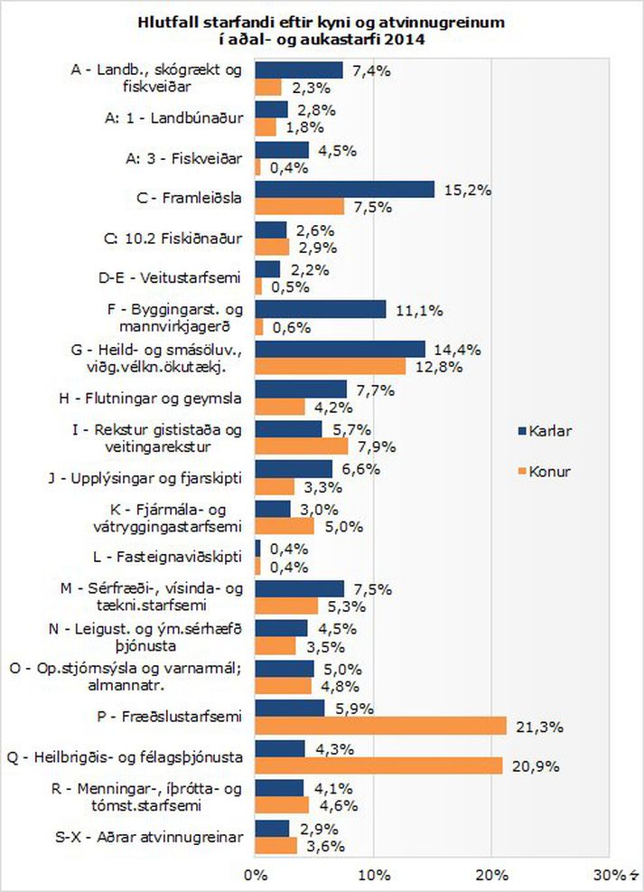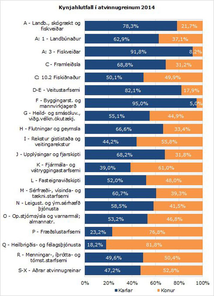 Þegar atvinnugreinar eru skoðaðar þá sést að vinnumarkaðurinn skiptist að talsverðu leyti eftir kyni. Rúmlega 42% kvenna á vinnumarkaði starfa hjá hjá fyrirtækjum eða stofnunum sem heyra undir tvær atvinnugreinar, annars vegar fræðslustarfsemi og hins vegar heilbrigðis- og félagsþjónustu.