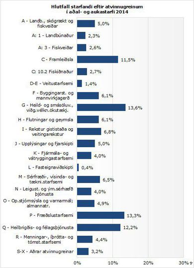 Fjöldi starfandi í hverri atvinnugrein er samanlagður fjöldi fólks í aðal- og aukastarfi. Hver einstaklingur getur mögulega verið í fleiri en einu starfi í mismunandi atvinnugreinum. Hver og einn er þó aðeins talinn einu sinni í hverri grein. Hlutfall starfandi í hverri atvinnugrein er ekki reiknað út frá samanlögðum fjölda í atvinnugreinum heldur út frá heildarfjölda starfandi fólks á vinnumarkaði.