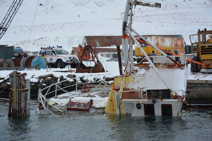 „Veit ekki hvað þeir ætla að gera en ég reikna með því að þeir nái honum upp á morgun,“ segir Guðjón Már Jónsson sem situr í svæðisstjórn björgunarsveita. Hundrað tonna stálskip sökk í slippnum á Seyðsifirði í dag en ekki liggur fyrir hvað varð til þess að skipið sökk. Talsverð hætta sakapaðist í kjölfarið og munaði litlu að skipið togaði annan bát með sér niður en björgunarsveitinni Ísólfi tókst að koma í veg fyrir það. Veðurofsi átti ekki þátt í því að sökkva skipinu því skaplegt veður var á Seyðisfirði í dag.Talsverð hætta sakapaðist í kjölfarið og munaði litlu að skipið togaði annan bát með sér niður en björgunarsveitinni Ísólfi tókst að koma í veg fyrir það.Mynd/Ómar Bogason„Báturinn liggur nú bara þarna við bryggju, hálf sokkinn,“ segir Guðjón Már um ástandið á Seyðisfirði sem stendur. Fréttastofa Rúv greindi frá þessu fyrr í dag. Skipið sem byrjaði allt í einu að leka, var mikið í fréttum á árinu 2010. Það var kyrrsett eftir að grunsamlegir menn sigldu því hingað til lands. Lögregla taldi að smyglskipið hefði verið notað til að flytja nokkur tonn af maríjúana frá Afríku áleiðis til Hollands. „Þetta er mjög gamall bátur sem hefur bara verið við bryggju í einhver ár,“ bætir Guðjón Már við.