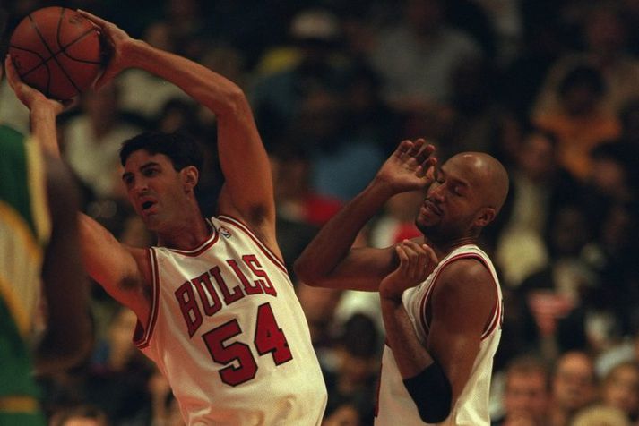 Chicago Bulls 1995-96 setti met með því að vinna 72 af 82 leikjum sínum í deildarkeppninni en í gær kvaddi einn leikmanna liðsins þennan heim. Jack Haley, sem lék alls í níu tímabil í NBA-deildinni, lést í gær en hann glímdi við hjartasjúkdóm. Haley var 51 árs. Jack Haley spilaði með Chicago Bulls, New Jersey Nets, Los Angeles Lakers of San Antonio Spurs og sínum NBA-ferli og var með 3,5 stig og 2,7 stoðsendingar að meðaltali. Haley var 208 sentímetra miðherji sem var ekki með Bulls-liðinu í úrslitakeppninni 1996 en kom við sögu í lokaleik deildarkeppninnar þar sem hann var með fimm stig á sjö mínútum. „Chicago Bulls fjölskyldan hefur fengið þær sorglegu fréttir að fyrrum leikmaður liðsins, Jack Haley, hafi látist. Hann var mikilvægur meðlimur 1995-96 meistaraliðsins, áhugasamur og hvetjandi liðsfélagi sem kom alltaf með orku og eldmóð inn í félagið. Við sendum fjölskyldu Jack okkar samúðarkveðjur," sagði í yfirlýsingu frá Chicago Bulls. Jack Haley vildi sjálfur ekki taka undir það að hann hafi verið barnapía Dennis Rodman í þessu 1996-liði en Rodman birti mynd af Haley að kyssa hann á kinnina á twitter-síðu sinni. Haley var ekki aðeins þekktur fyrir að spila í NBA. Hann lék í körfuboltamyndunum „Eddie" og „Rebound" og hann lék einnig í tónlistarmyndbandinu "Love in an Elevator" með Aerosmith.