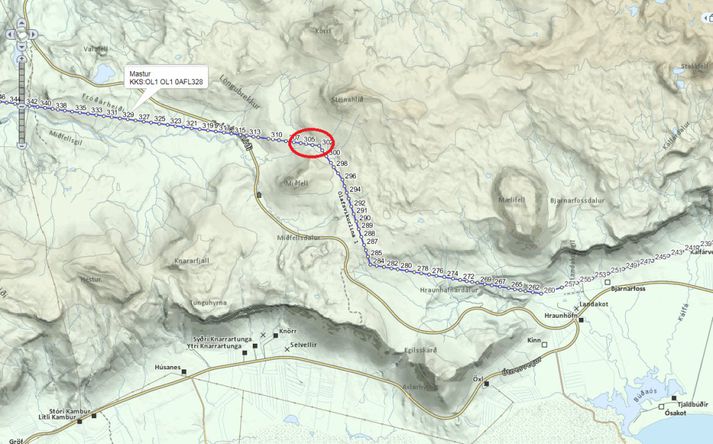 Landsnet varar útivistarfólk við því að vera á ferð í nágrenni Ólafsvíkurlínu 1 á Fróðárheiði þar sem hún liggur norðan við Miðfell. Er þetta vegna þess að dregið hefur í skafla undir línunni. Komið hefur verið fyrir viðvörunarveifum á staðnum til að vekja athygli á hættunni. Hér að neðan má sjá kort af svæðinu sem um ræðir.Kort af svæðinu sem um ræðir.Mynd/Landsnet